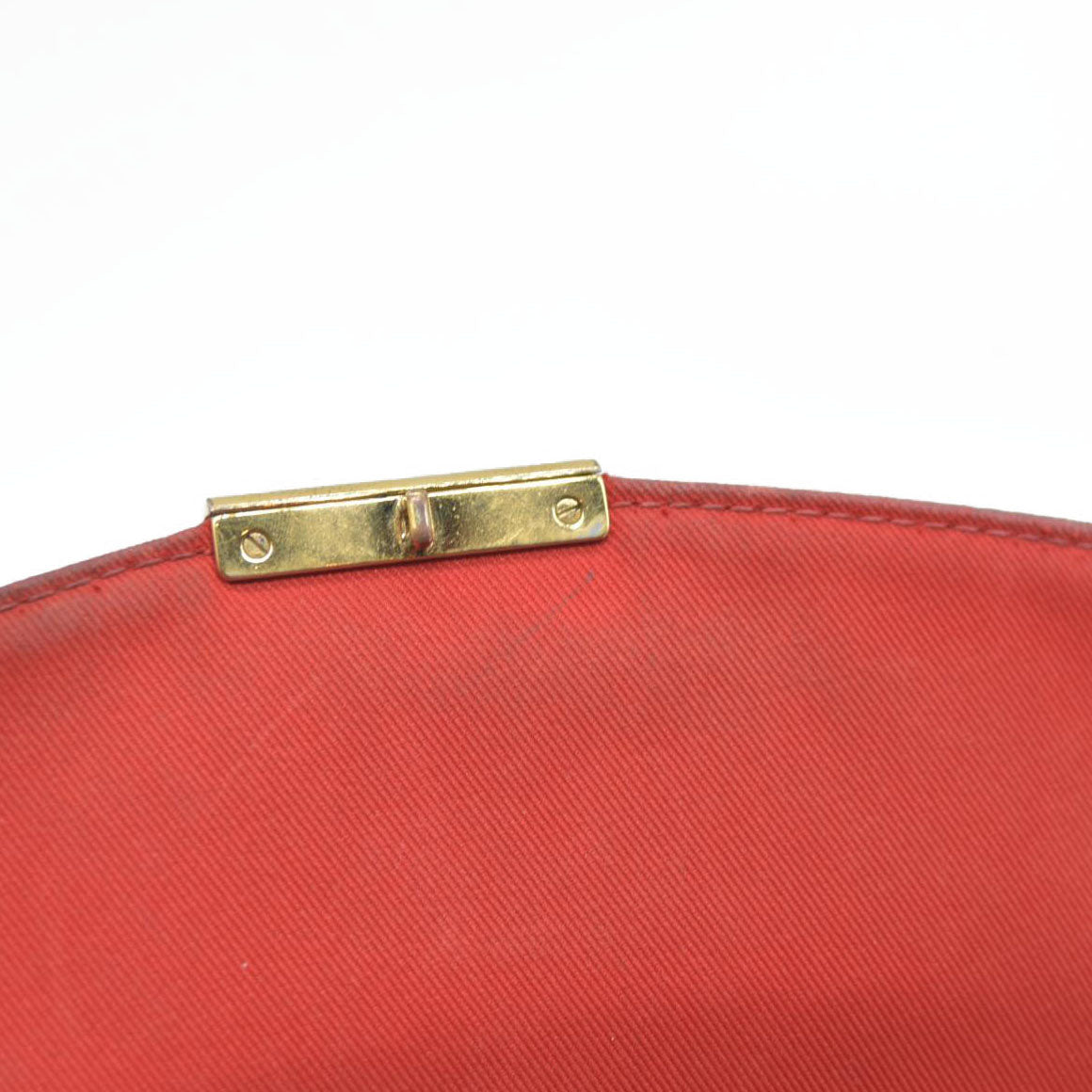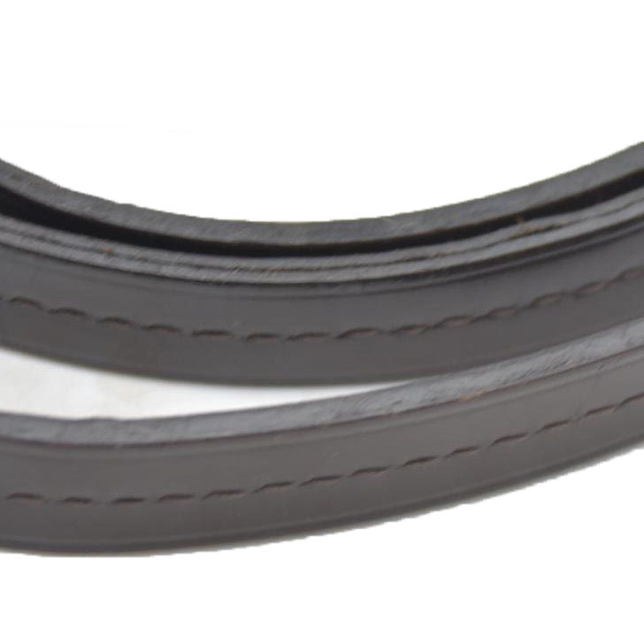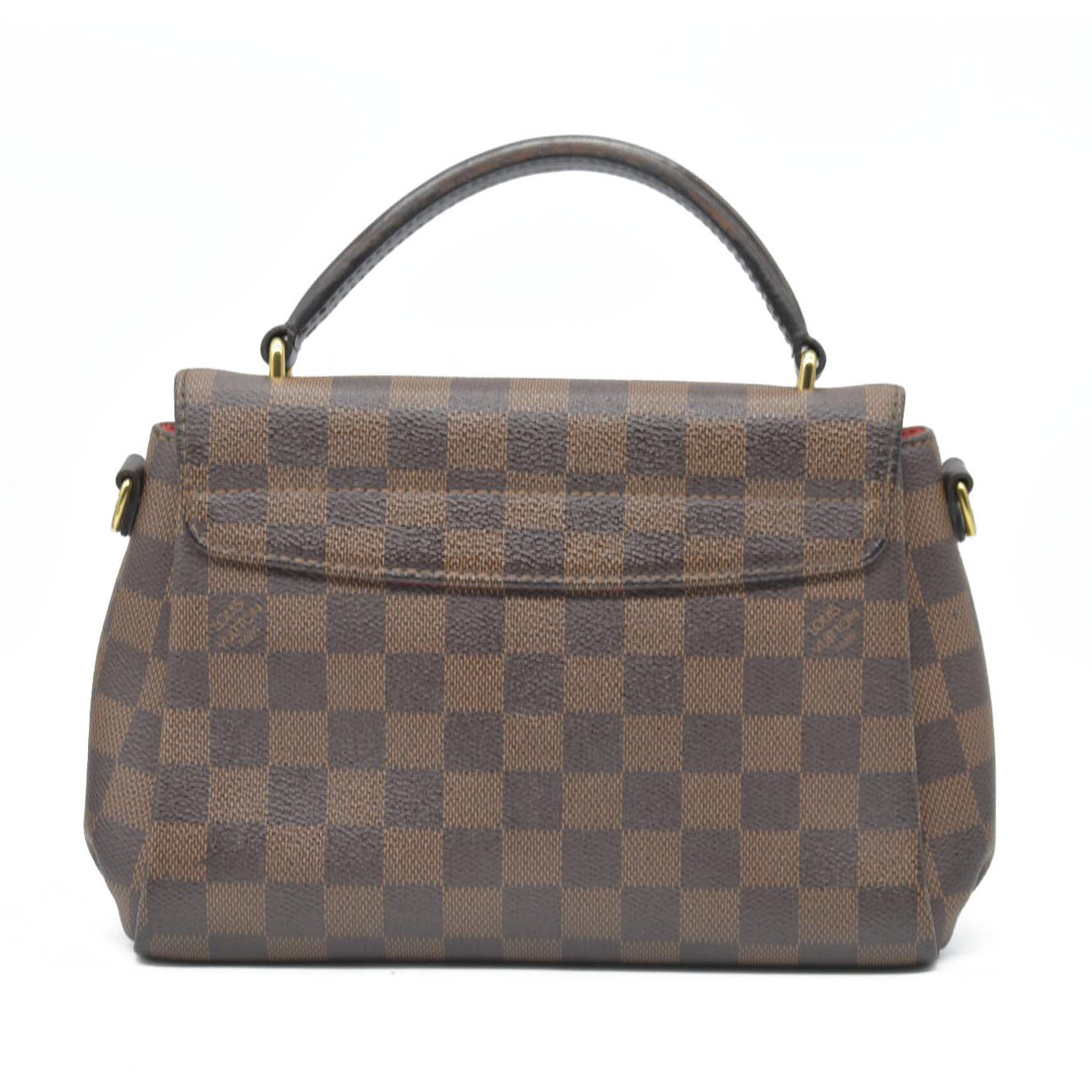 This is an authentic LOUIS VUITTON Damier Ebene Croisette. This handbag is crafted of Louis Vuitton checkerboard canvas in brown. The bag features a dark brown cowhide leather top handle, an optional leather shoulder strap, and brass hardware. The flap is secured by a brass S lock and opens to a rouge red fabric interior with a patch pocket.