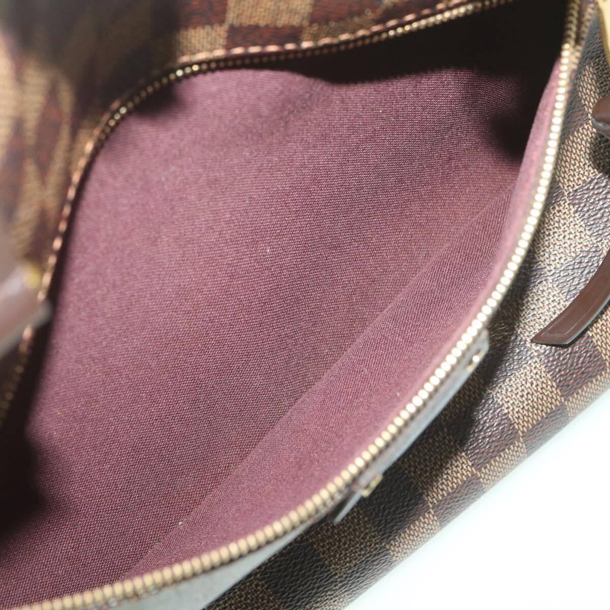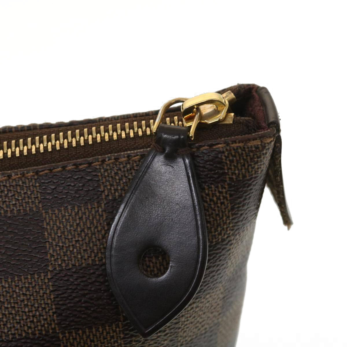 This is an authentic LOUIS VUITTON Damier Ebene Iena MM. This stylish shoulder bag is crafted of Louis Vuitton Damier toile coated canvas in brown. The bag features a front zipper pocket, and dark brown leather trim and shoulder straps, with polished brass hardware. The top zipper opens to a plum purple fabric interior with patch pockets.