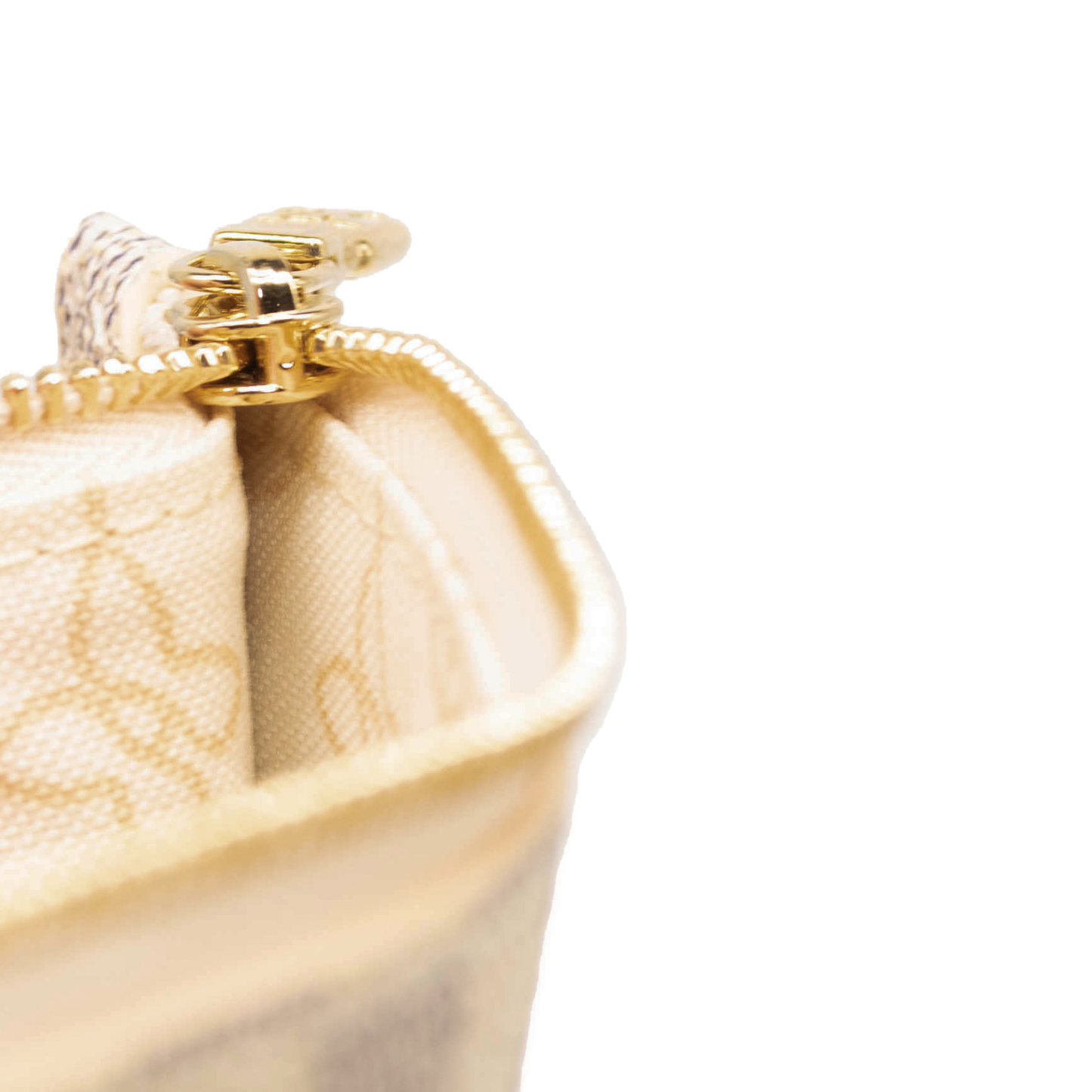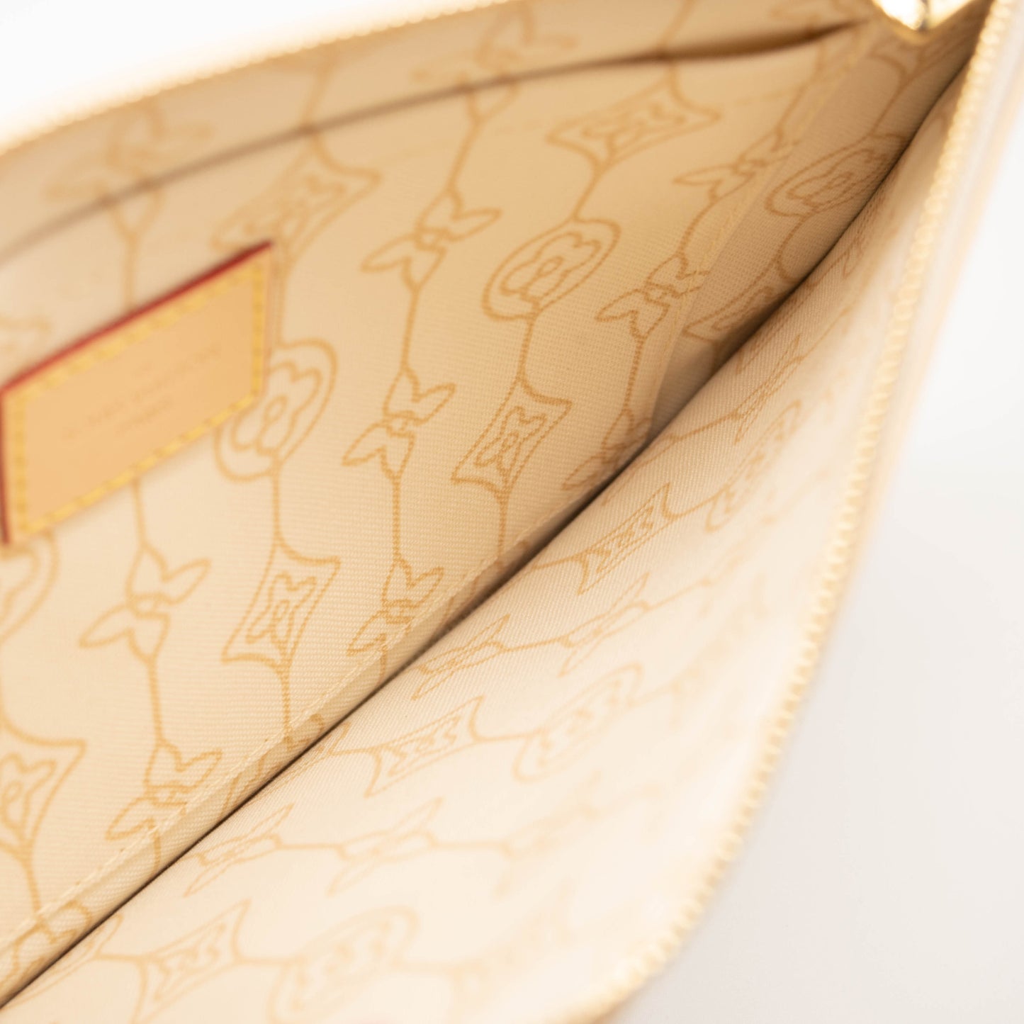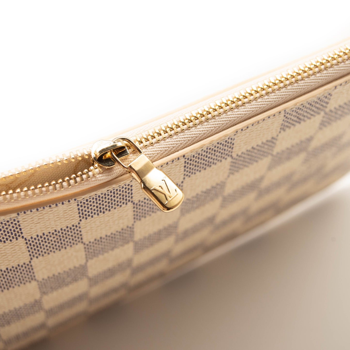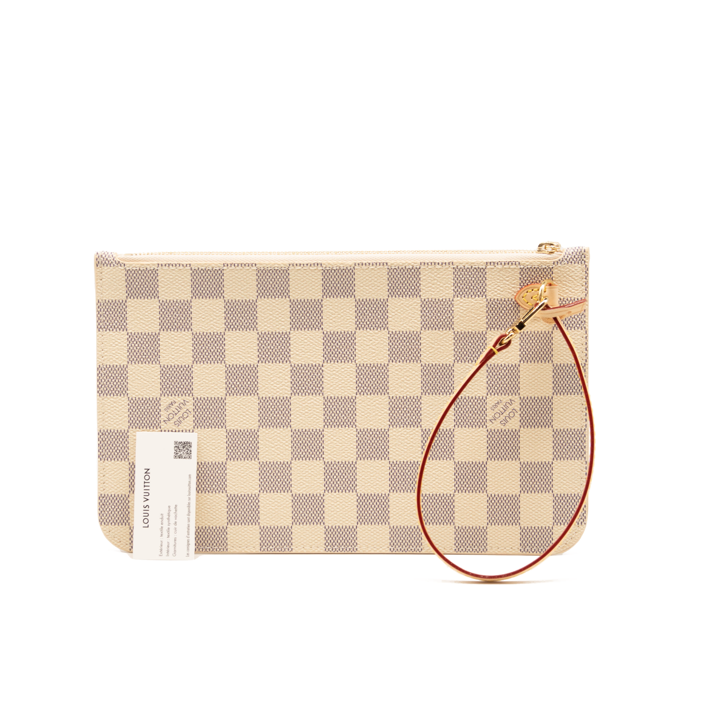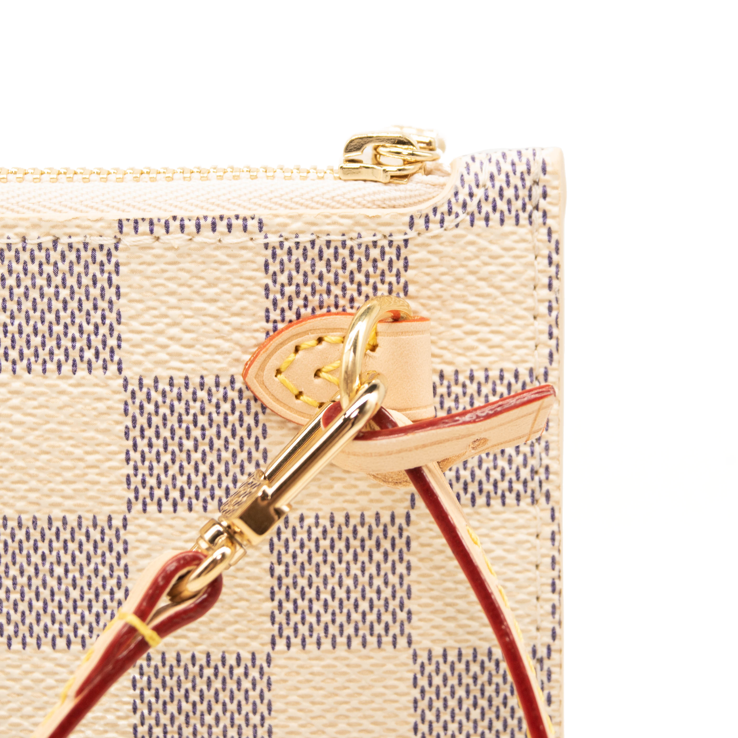 This an authentic LOUIS VUITTON Damier Azur Neverfull MM GM Pochette. This pouch is crafted of signature Louis Vuitton Damier Azur check coated canvas in blue and white, complemented with a vachetta leather cowhide wristlet strap. The brushed gold top zipper opens to a light beige medallion logo fabric interior with a patch pocket.