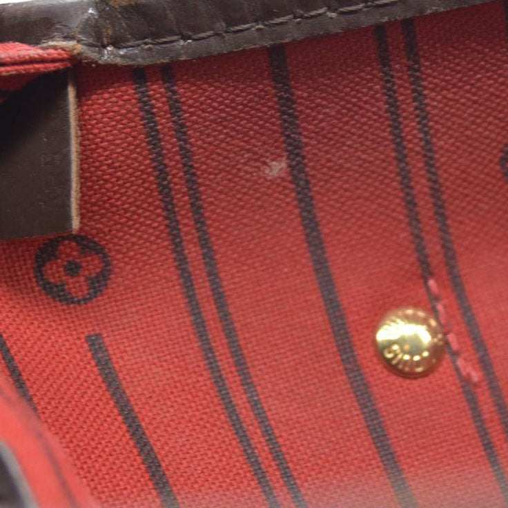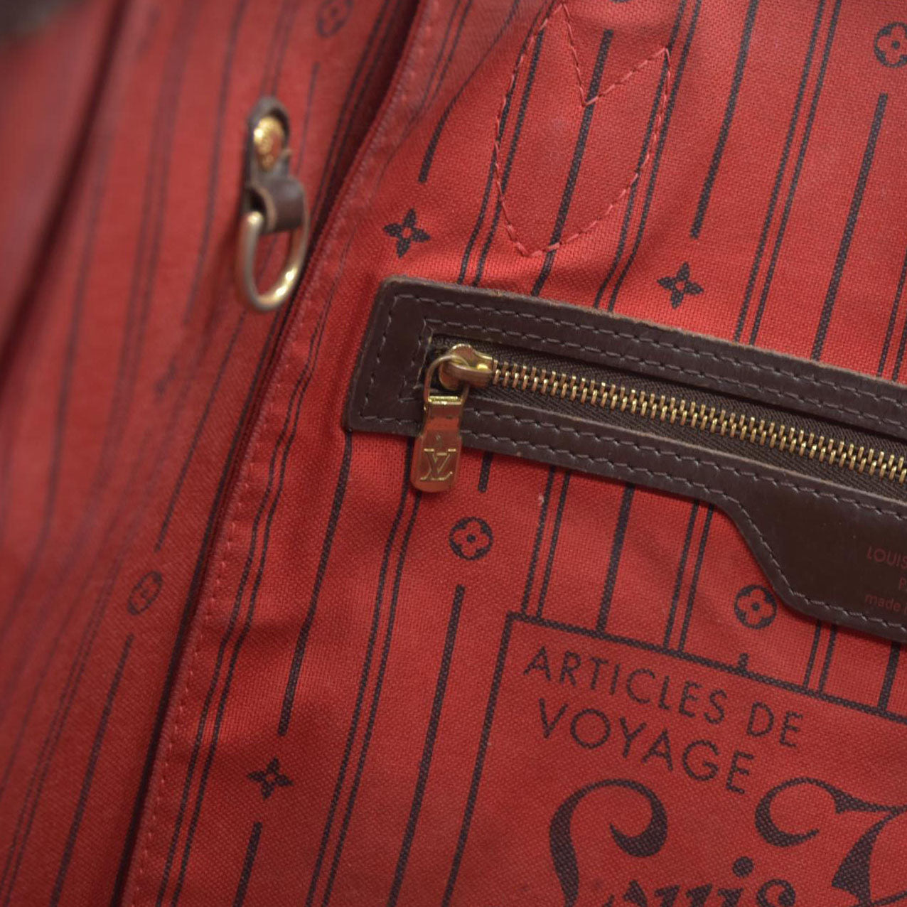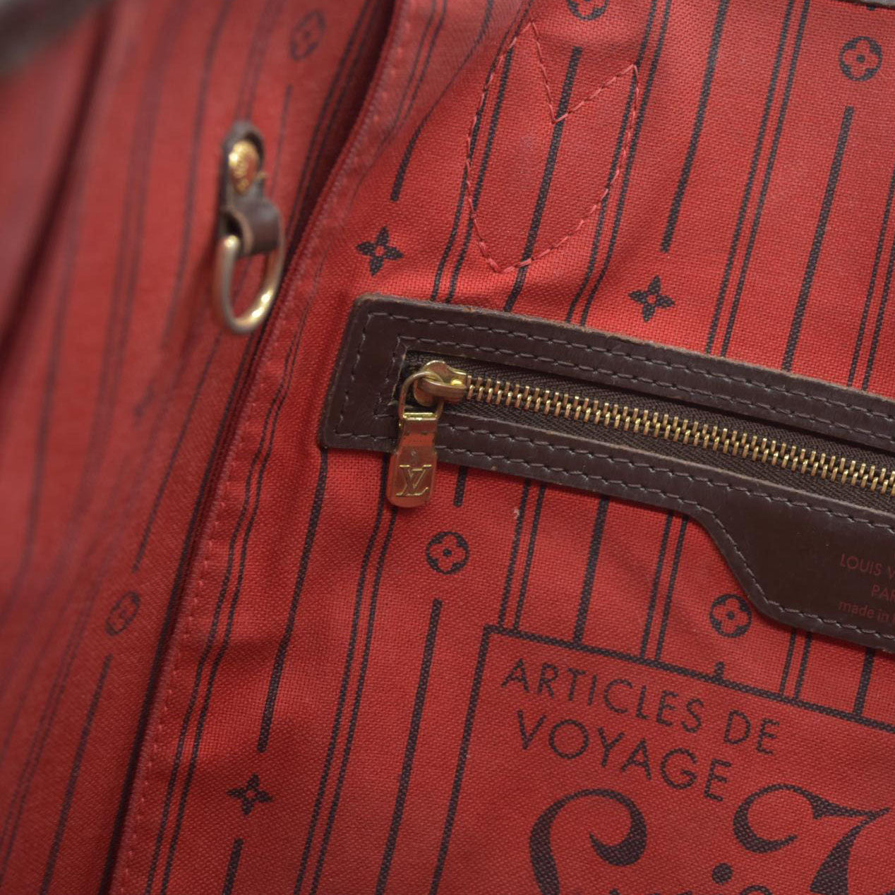 This is an authentic LOUIS VUITTON Damier Ebene Neverfull MM. This chic handbag is crafted of classic Louis Vuitton damier checkered canvas with chocolate brown cowhide leather top shoulder handles and trim. This bag opens to an interior of rouge red striped Louis Vuitton logo fabric with a zipper pocket. This is a wonderful tote that is ideal for all of your everyday needs with the special accent of luxury and style, from Louis Vuitton.