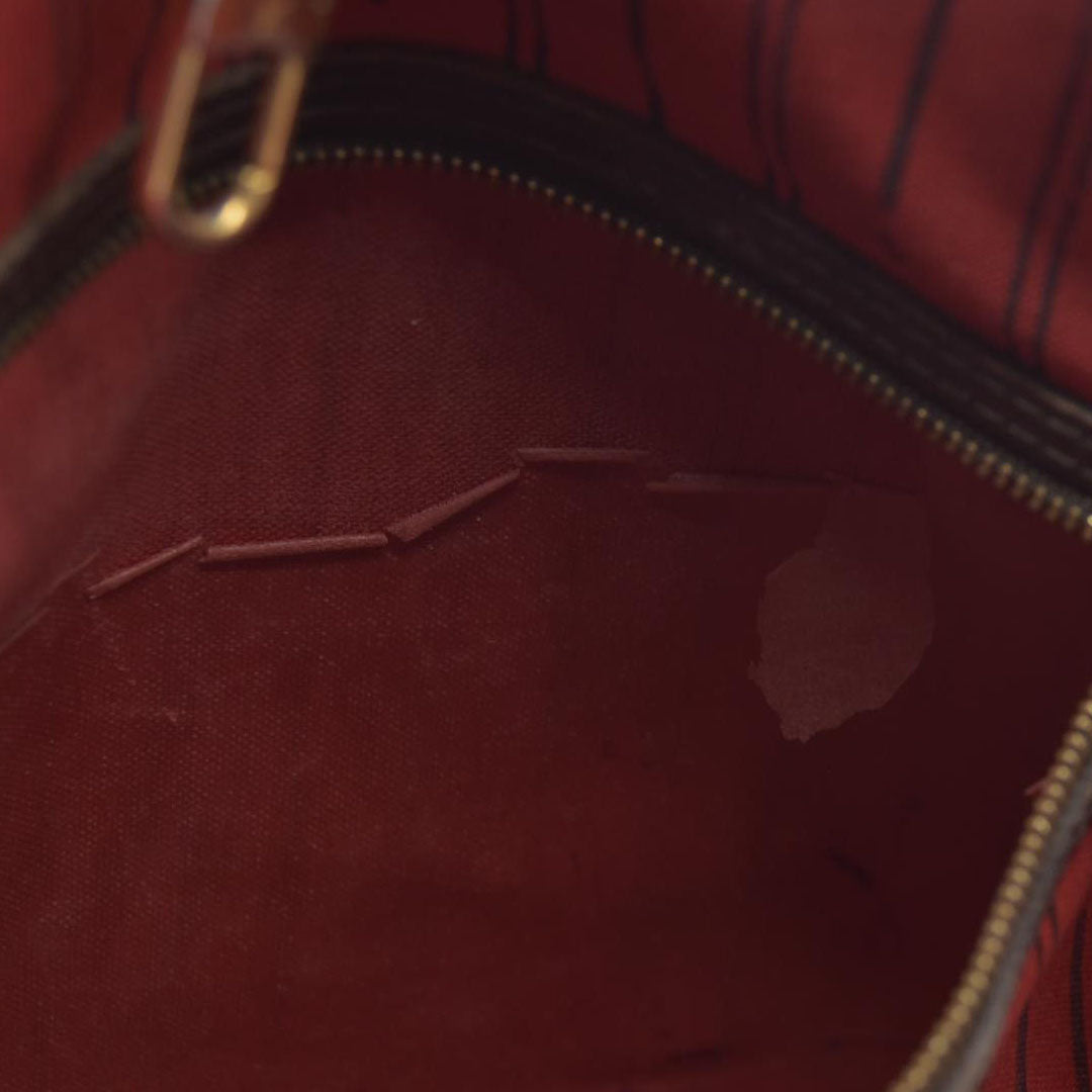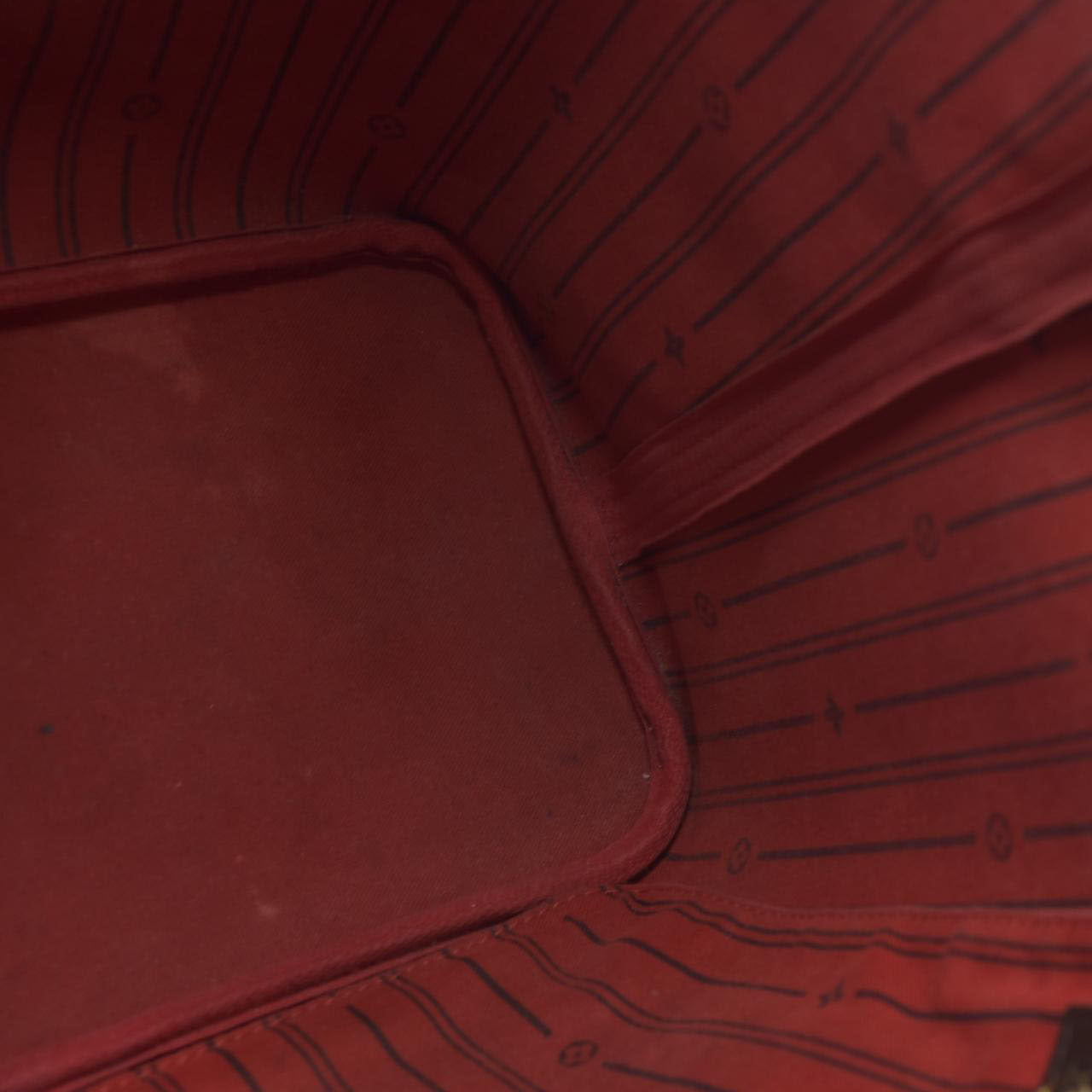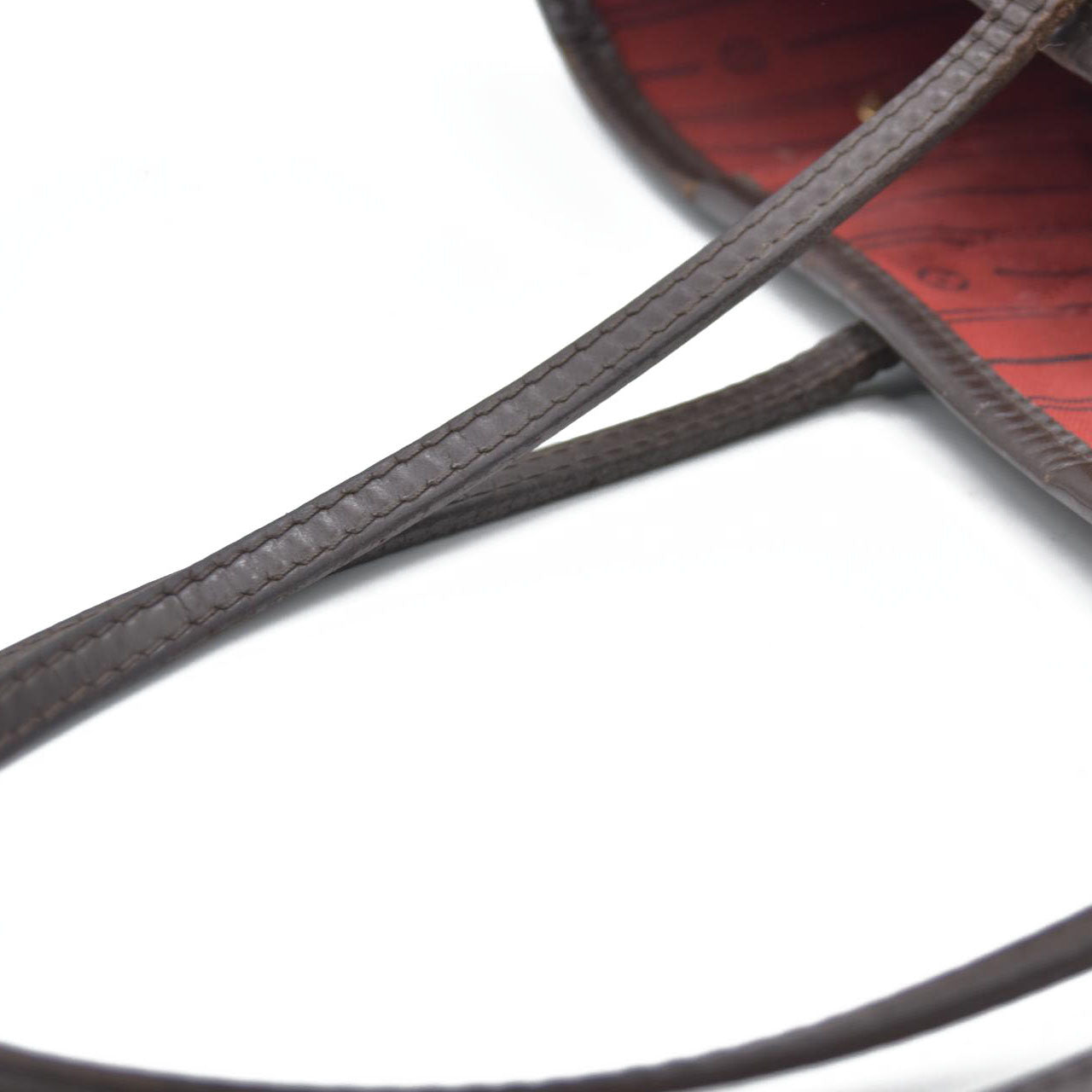 This is an authentic LOUIS VUITTON Damier Ebene Neverfull MM. This chic handbag is crafted of classic Louis Vuitton damier checkered canvas with chocolate brown cowhide leather top shoulder handles and trim. This bag opens to an interior of rouge red striped Louis Vuitton logo fabric with a zipper pocket. This is a wonderful tote that is ideal for all of your everyday needs with the special accent of luxury and style, from Louis Vuitton.