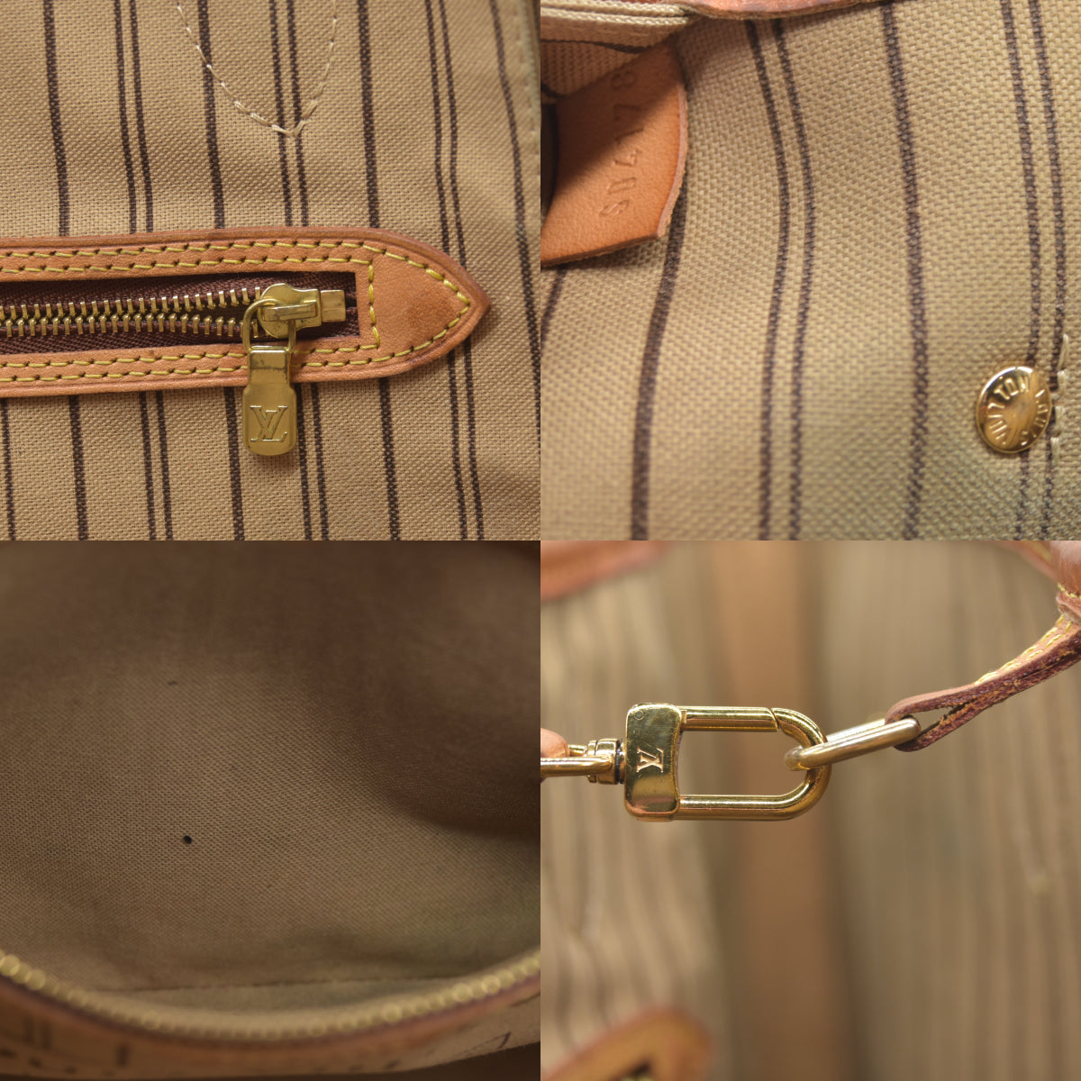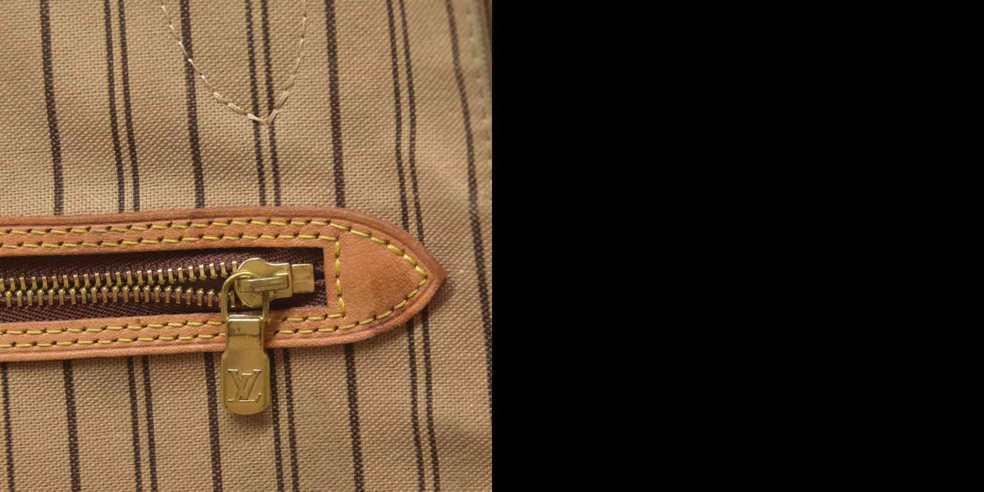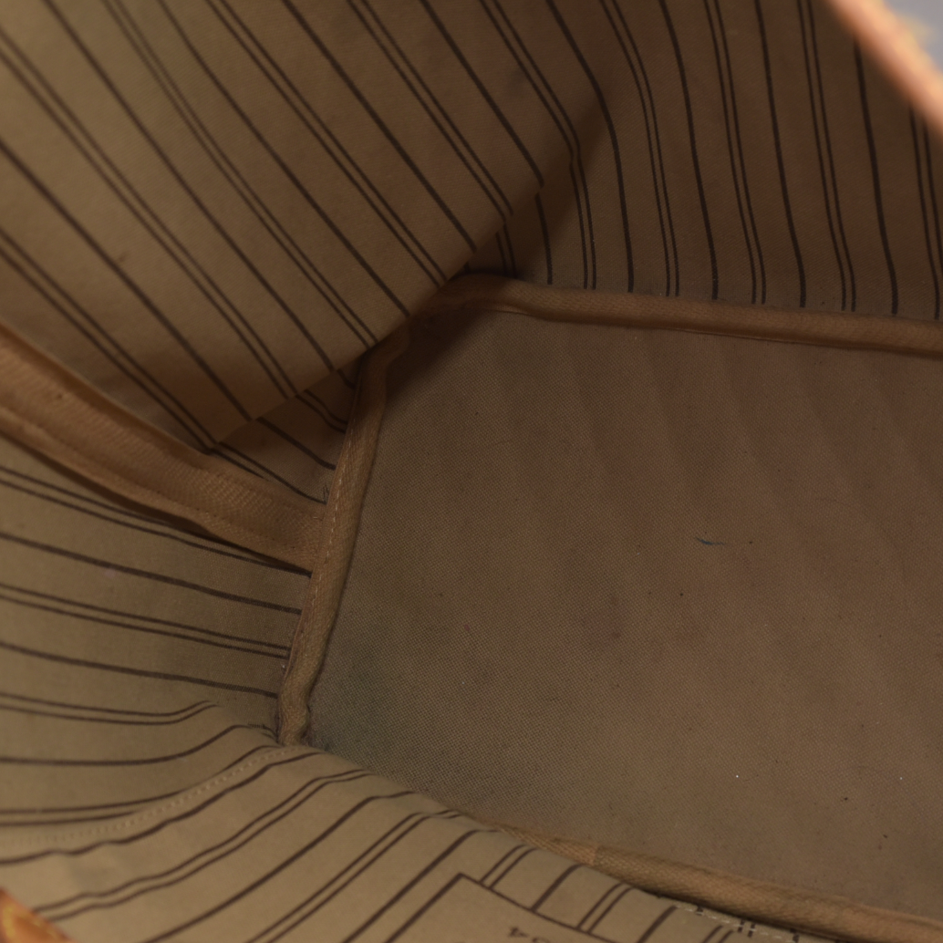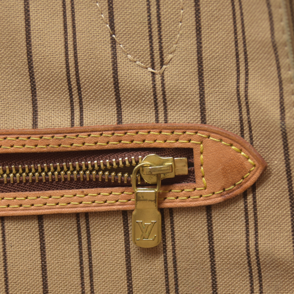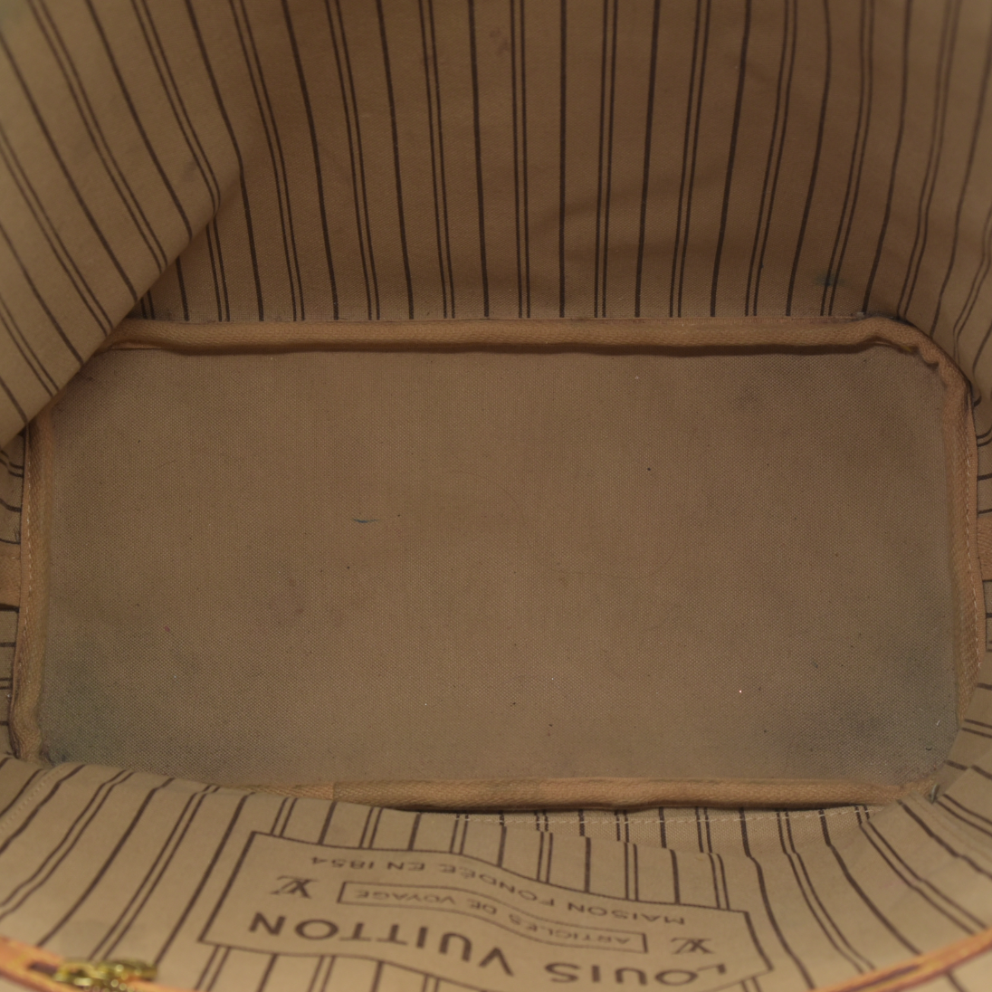 This is an authentic LOUIS VUITTON Monogram Neverfull MM. This stylish tote is crafted of classic Louis Vuitton monogram coated canvas in brown. The bag features vachetta cowhide leather trim, top handles, and side cinch cords with gold-toned hardware. The top is open to a beige striped fabric interior with a hanging zipper pocket.