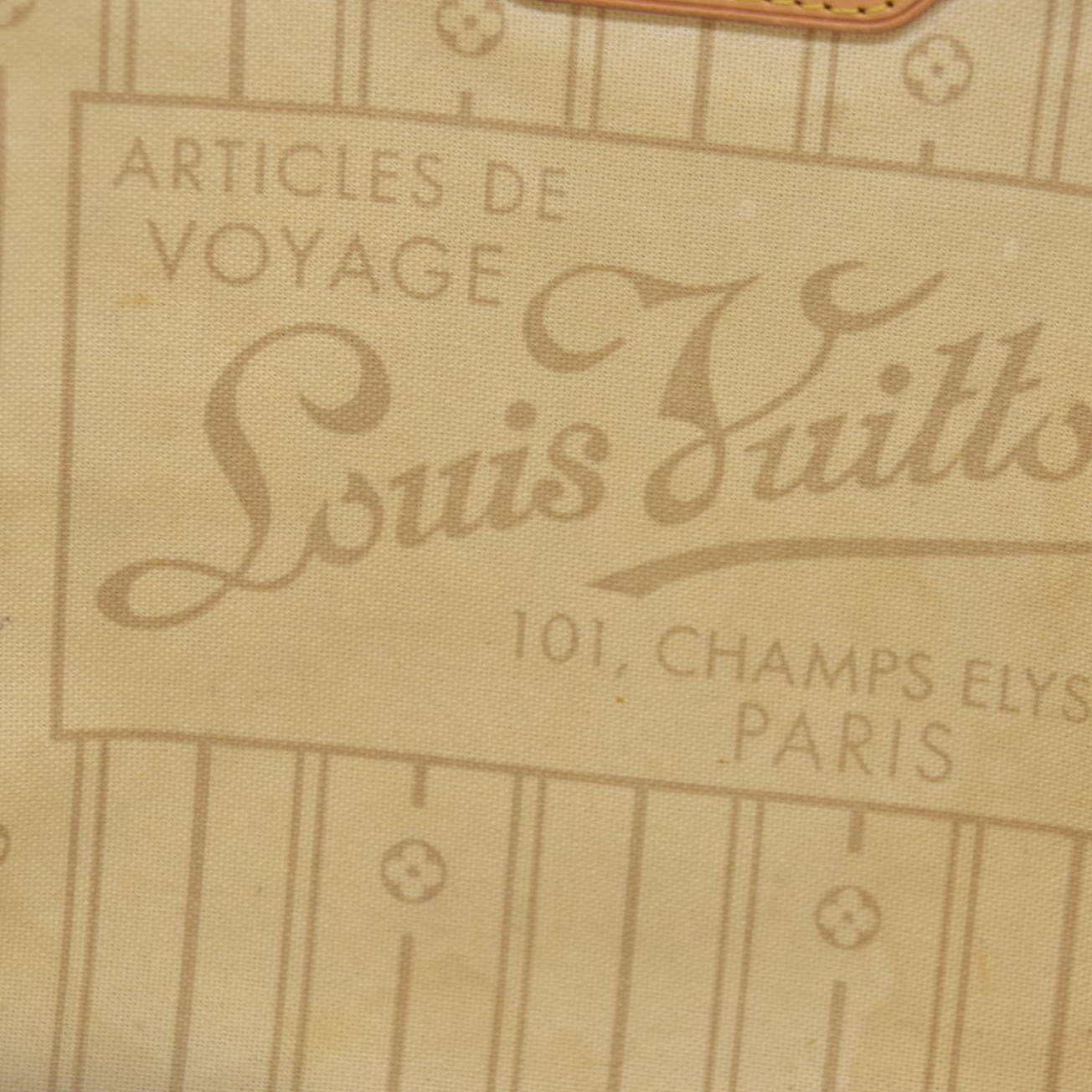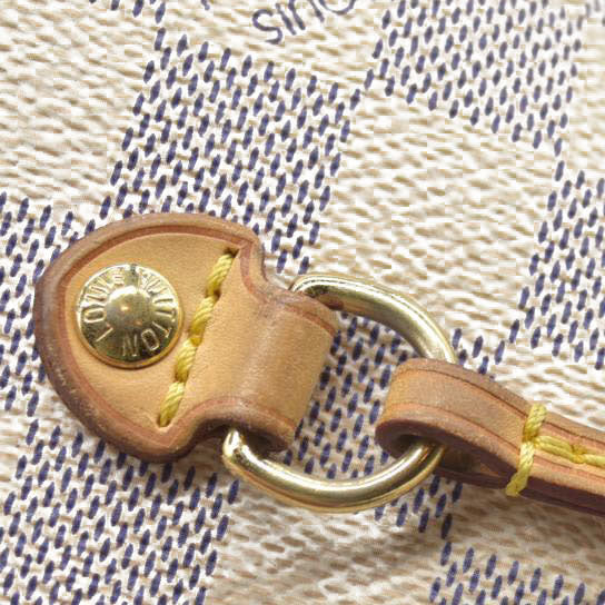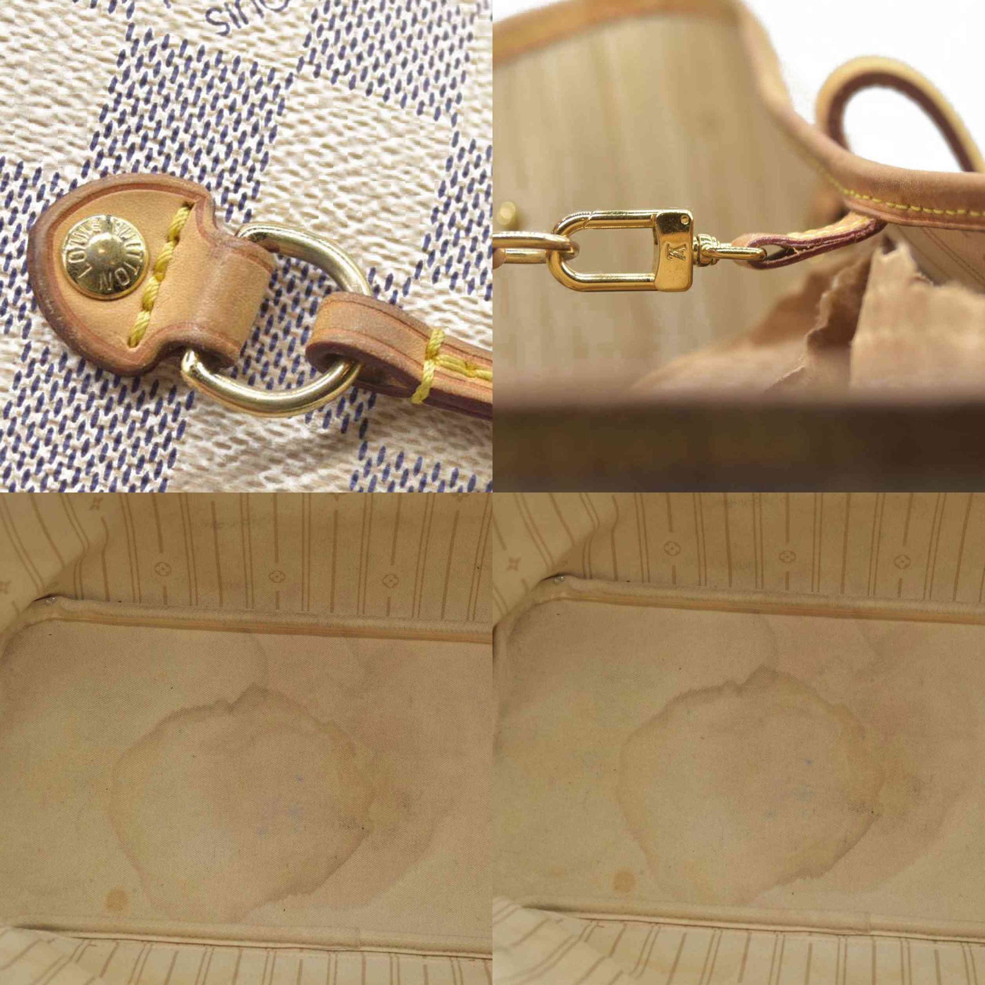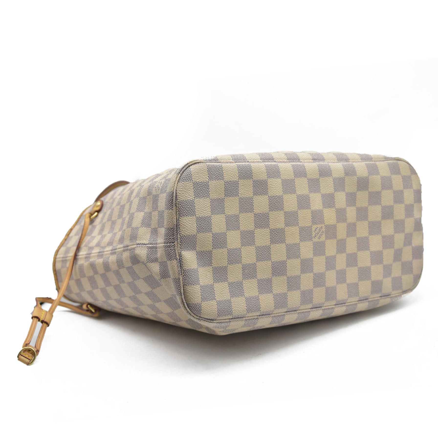 This is an authentic LOUIS VUITTON Damier Azur Neverfull MM. This stylish tote is crafted of Louis Vuitton's signature damier canvas in blue and white. This shoulder bag features vachetta cowhide leather trim, including strap handles and side cinch cords, with polished gold tone hardware. The top is wide and open to a striped white fabric interior with a hanging zipper pocket.