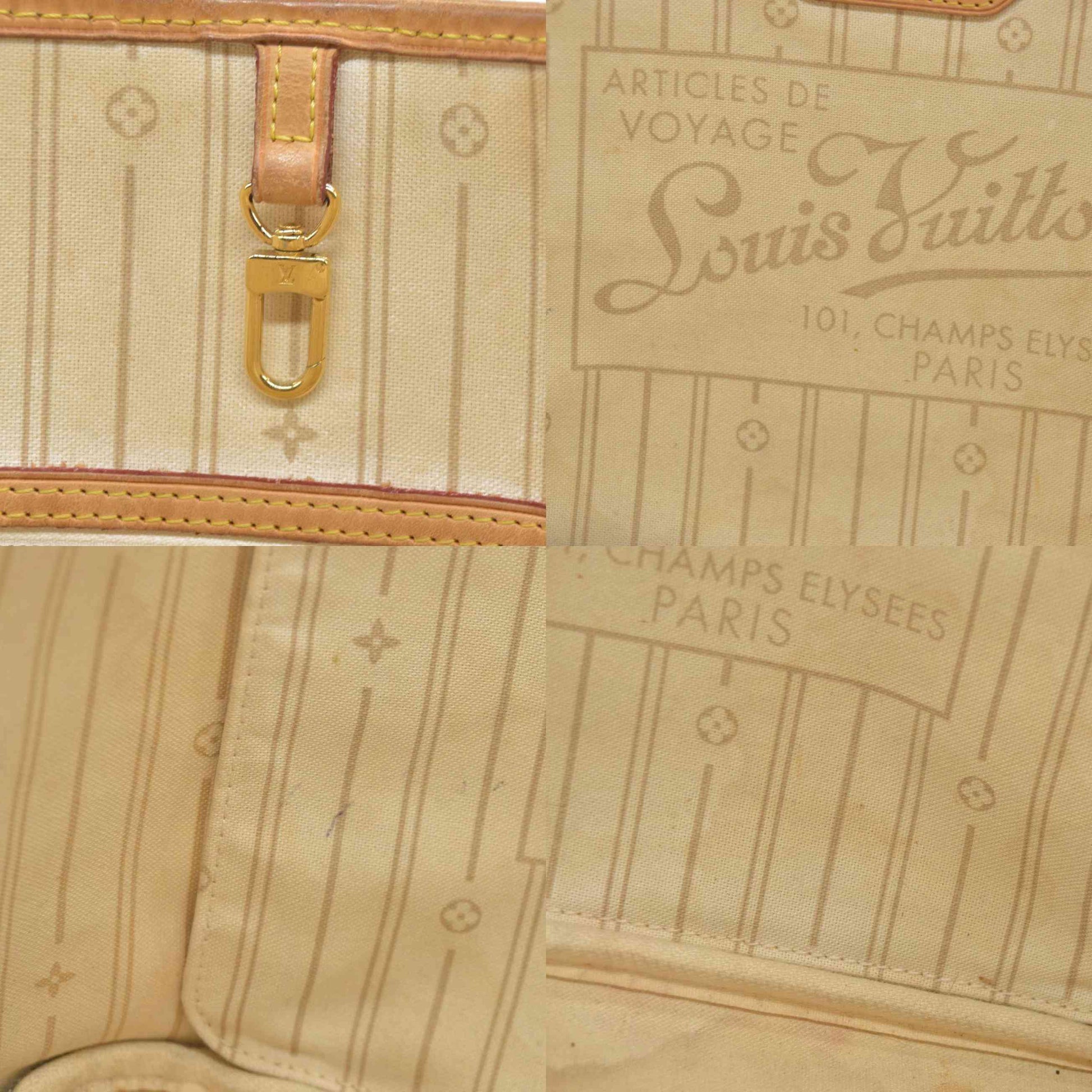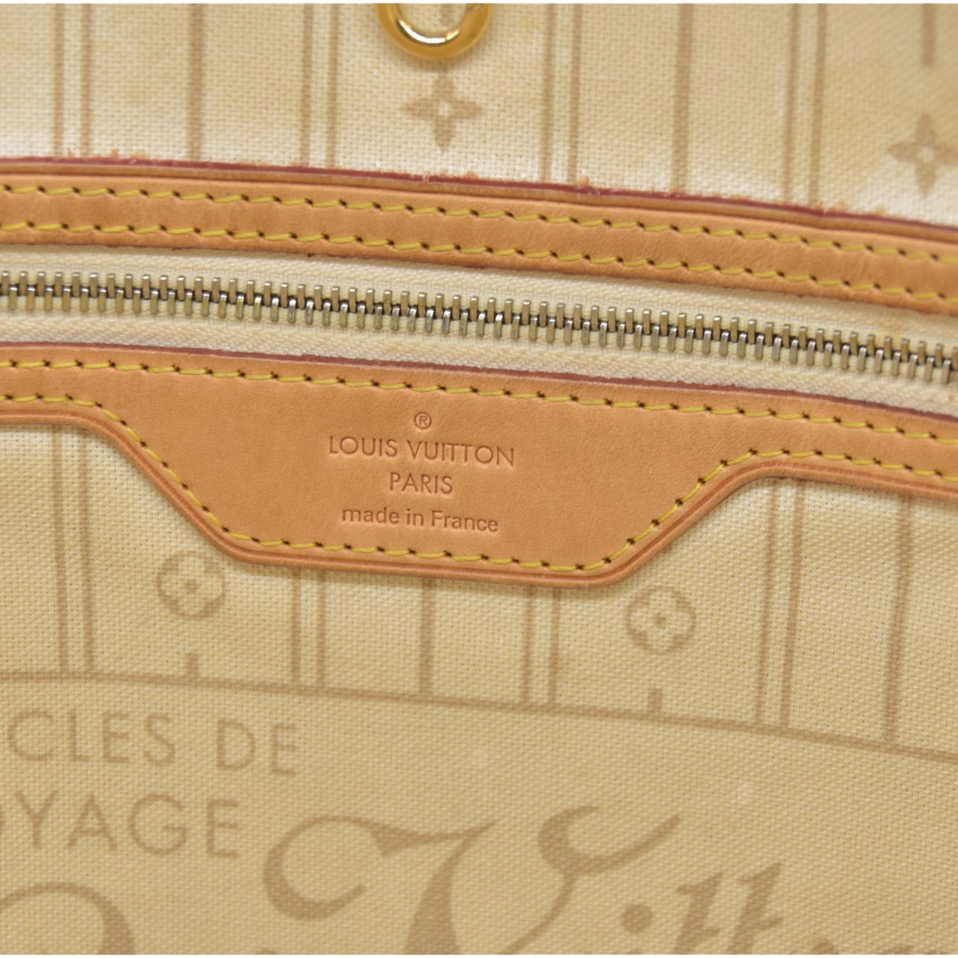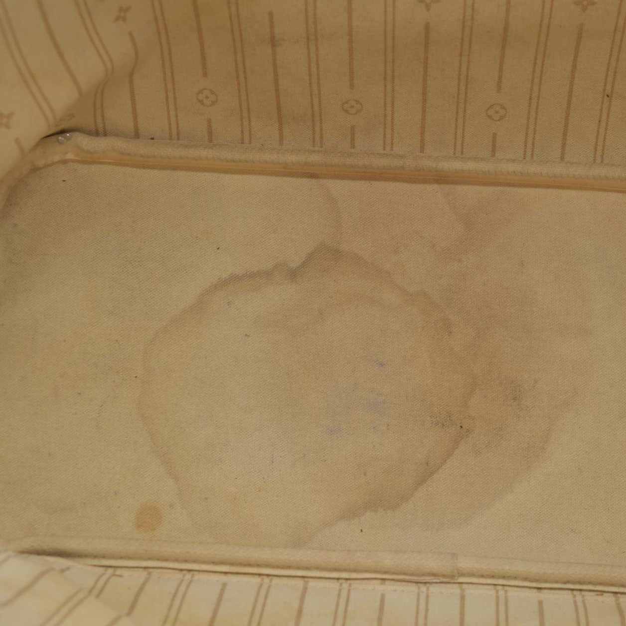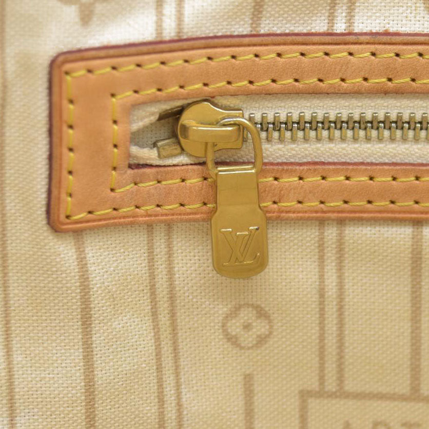 This is an authentic LOUIS VUITTON Damier Azur Neverfull MM. This stylish tote is crafted of Louis Vuitton's signature damier canvas in blue and white. This shoulder bag features vachetta cowhide leather trim, including strap handles and side cinch cords, with polished gold tone hardware. The top is wide and open to a striped white fabric interior with a hanging zipper pocket.