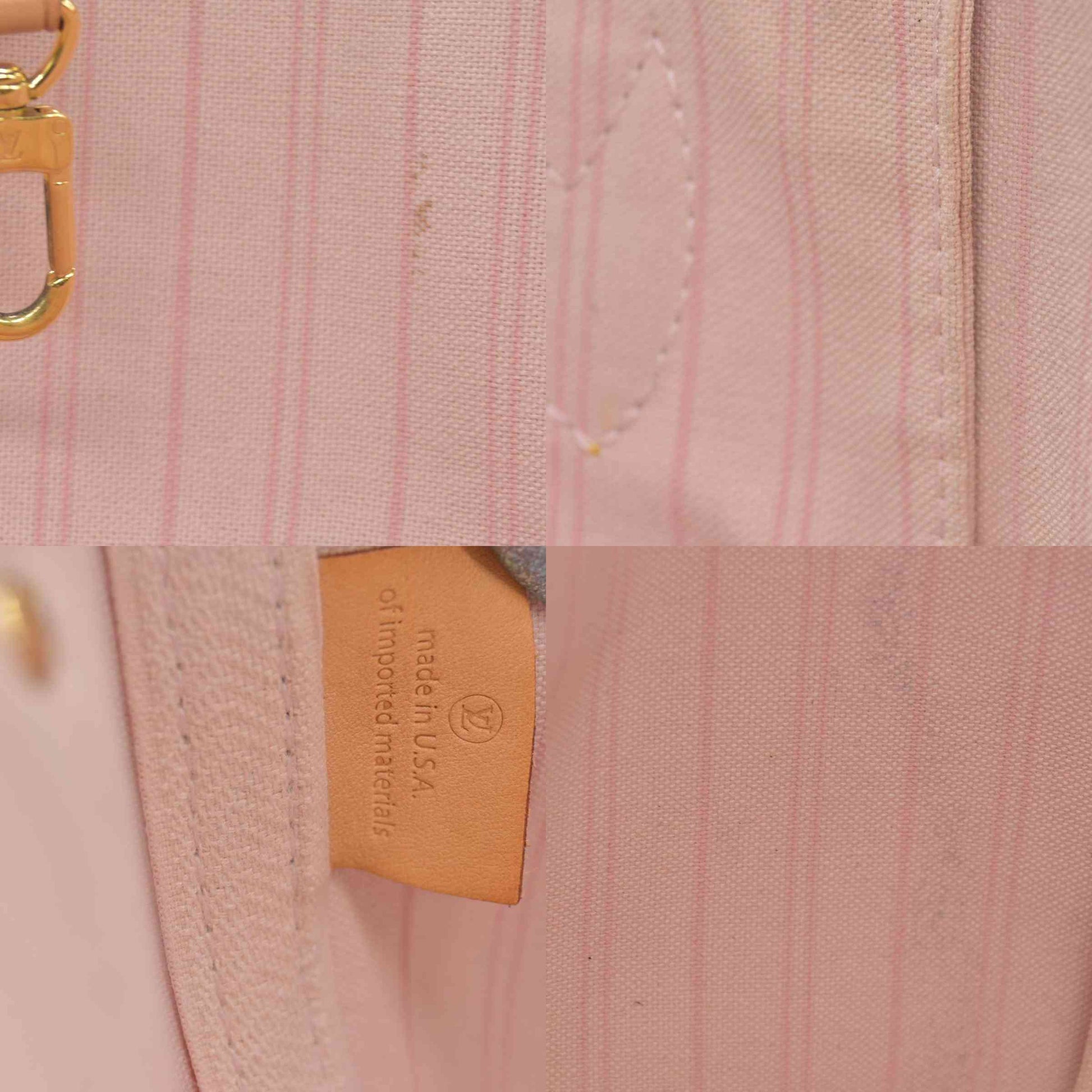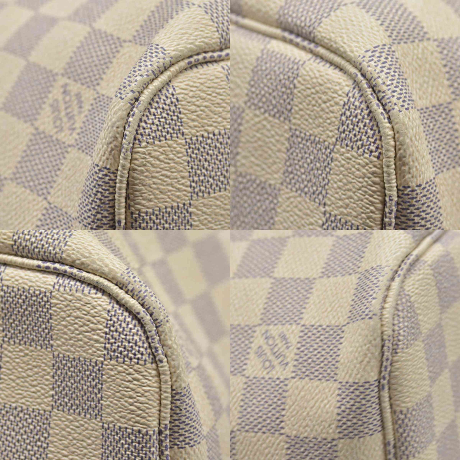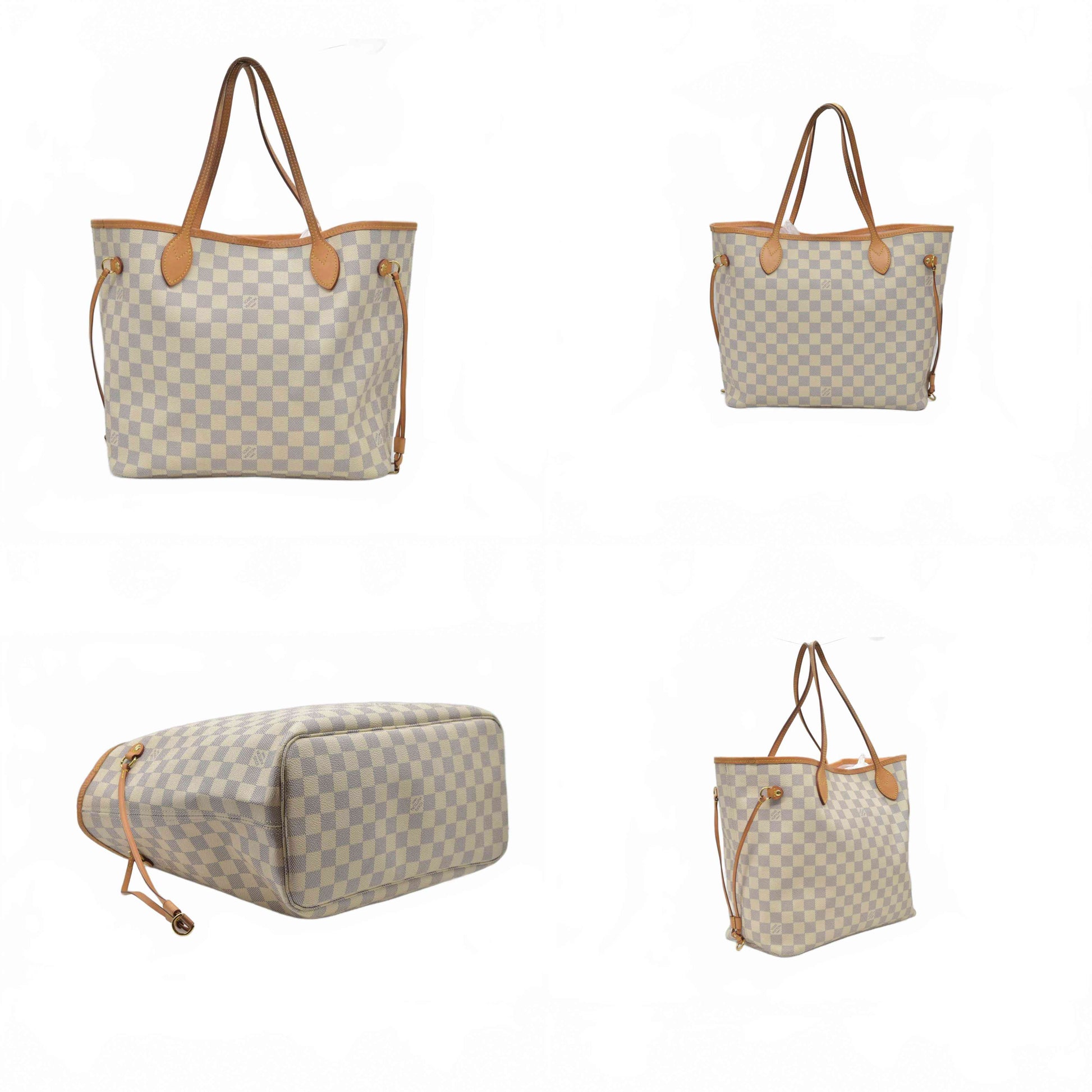 This is an authentic LOUIS VUITTON Damier Azur Neverfull MM. This stylish tote is crafted of Louis Vuitton's signature damier canvas in blue and white. This shoulder bag features vachetta cowhide leather trim, including strap handles and side cinch cords, with polished brass hardware. The top is wide and open to a striped ivory fabric interior pocket.