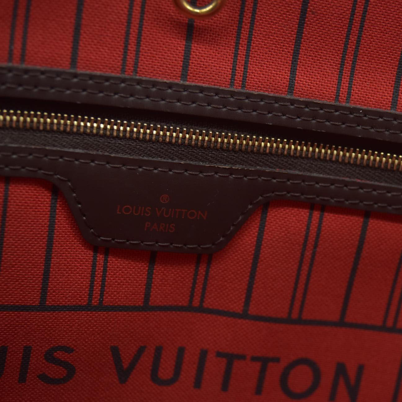 This is an authentic LOUIS VUITTON Damier Ebene Neo Neverfull MM. This chic tote is crafted of classic Louis Vuitton Damier coated canvas in brown. The shoulder bag features chocolate brown cowhide leather trim, brown leather shoulder straps, side cinch cords, and polished brass hardware. The top is open to a striped red fabric interior with a hanging zipper pocket, brass D-ring, brass hook closure.