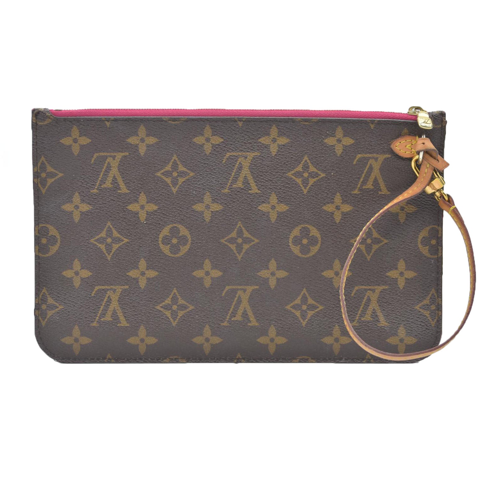 This is the authentic LOUIS VUITTON Monogram Neverfull MM GM Pochette. This chic pochette is featured in signature Louis Vuitton monogram canvas and includes an optional vachetta leather wristlet strap. The polished brass top zipper opens to a brown striped fabric interior with a flat pocket.