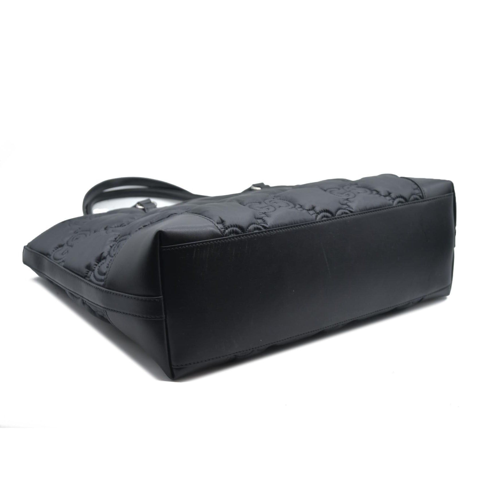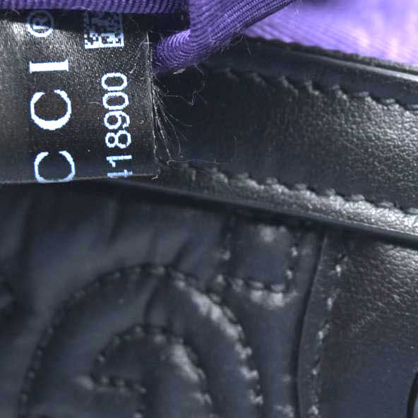 This is an authentic GUCCI Nylon Calfskin Enamel GG Matelasse Medium Ophidia Shopping Tote in Black. This chic shoulder bag is finely crafted of GG monogram quilted black nylon with black calfskin leather trim. The shoulder bag features leather strap handles and polished silver hardware. The top opens to a purple fabric interior with zipper and patch pockets.