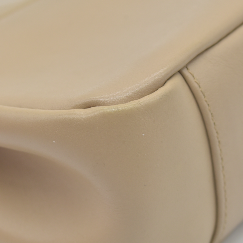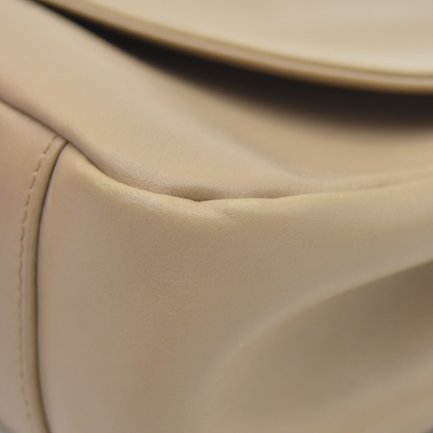 Heavy marking at interior; moderate residue at interior; moderate scratches at hardware; moderate discoloration throughout; minor creasing at flap underside; minor markings throughout; shape has relaxed due to wear.