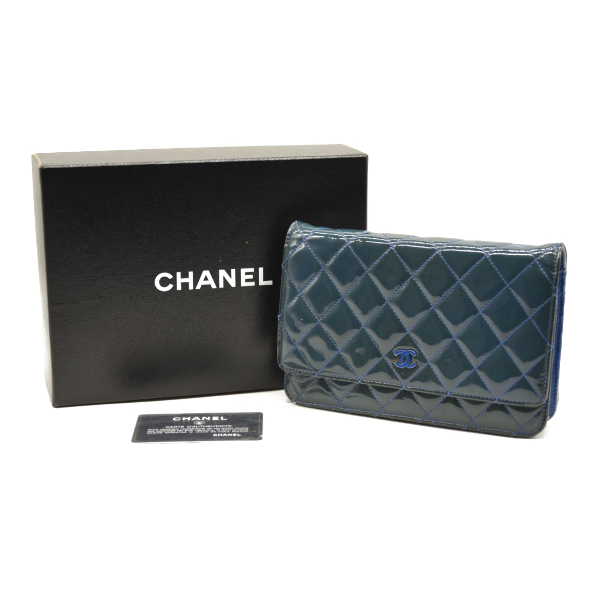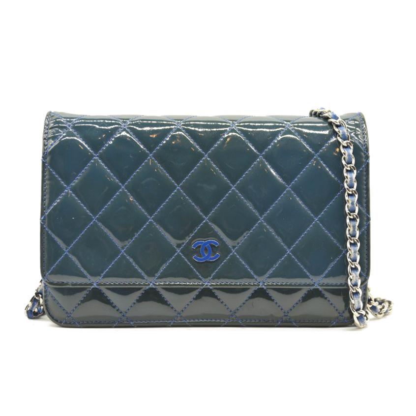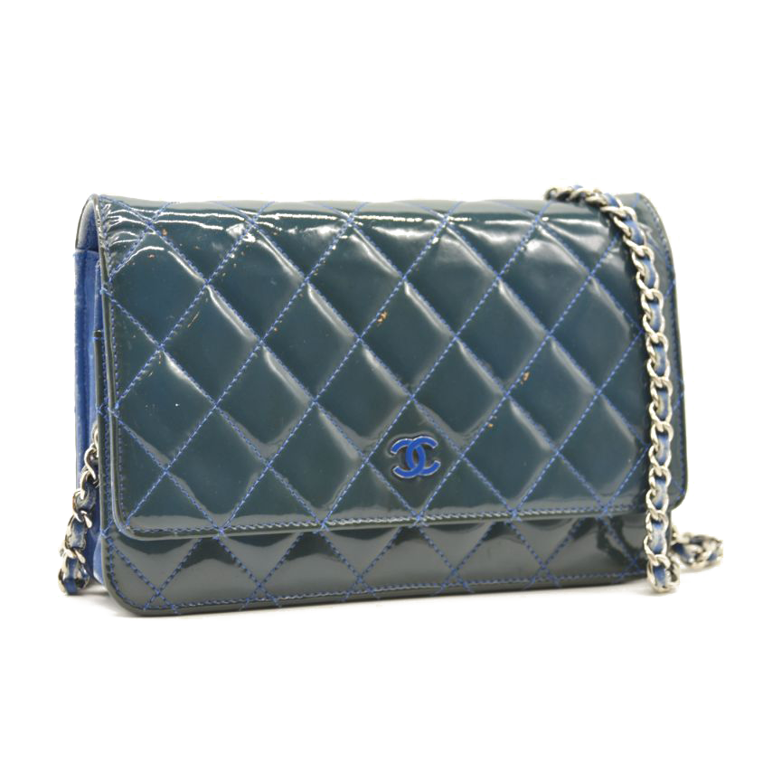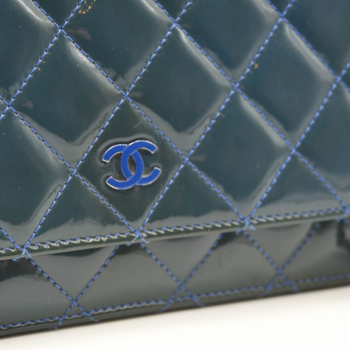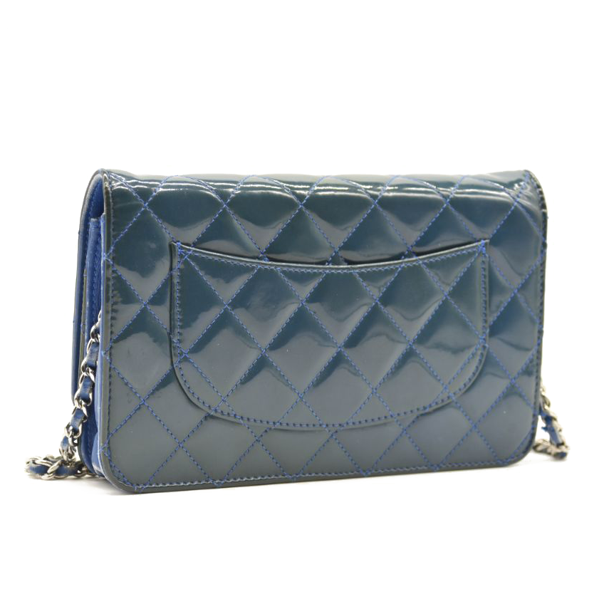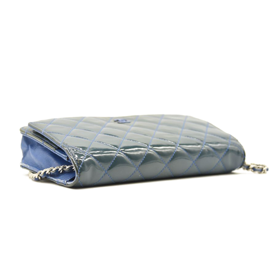 $3350 Chanel Classic Quilted Patent Wallet On Chain Blue