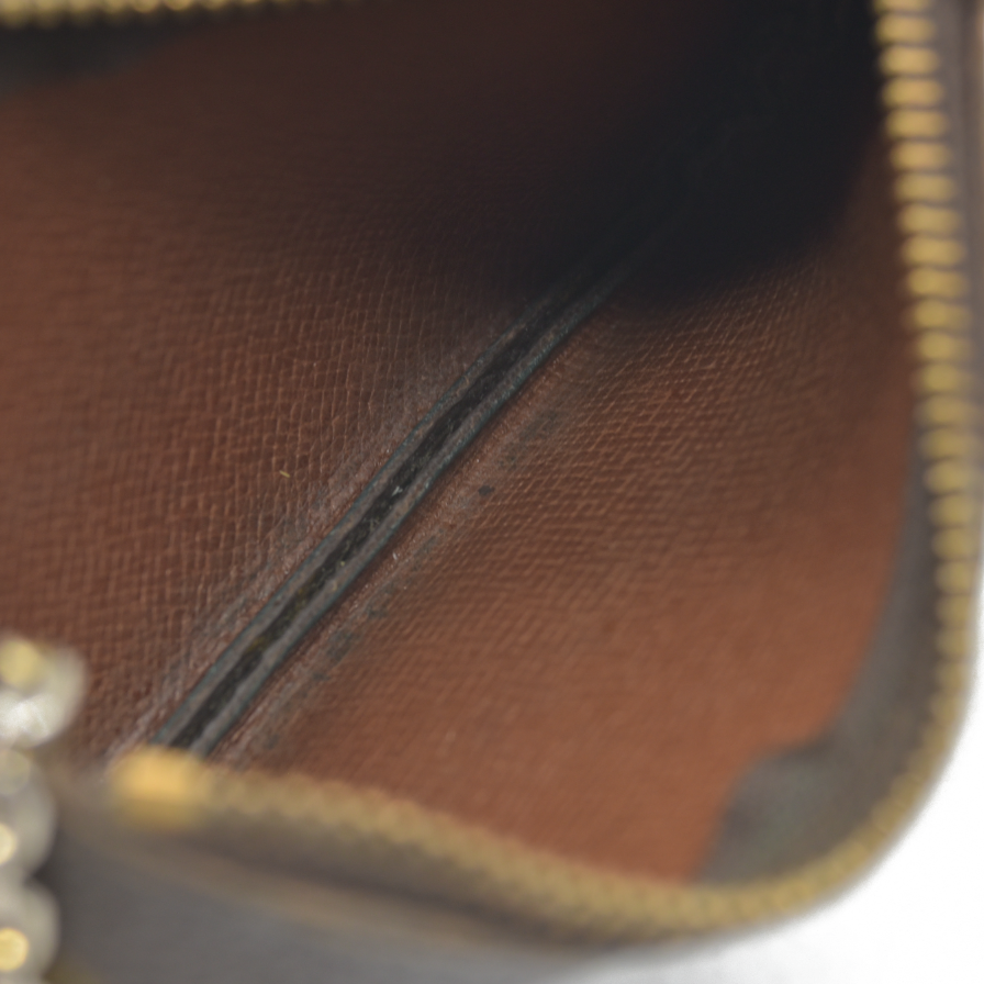 Women's brown Louis Vuitton monogram pochette coin case with brass hardware, chain linked accents, and zip closure at top.