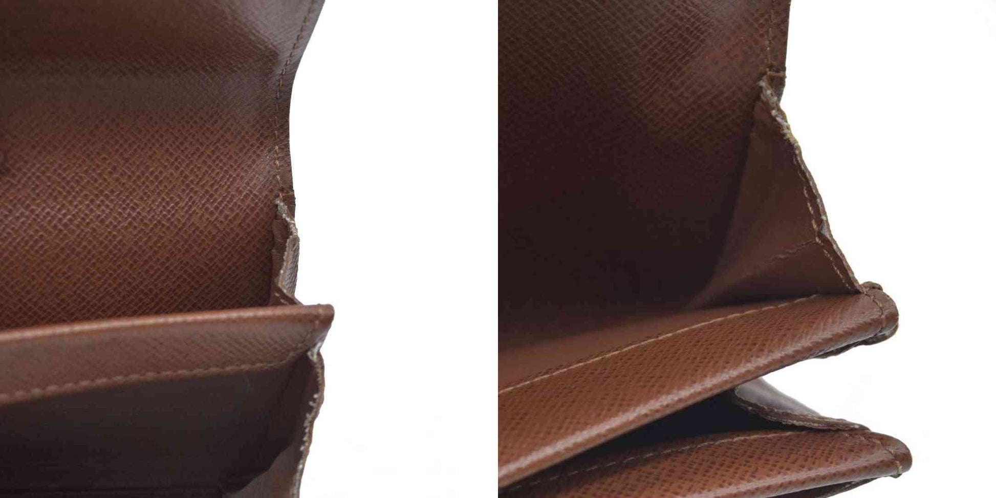 The exterior is rubbed with scratches. There are rubbed marks on the inside. There are loose stitches around the folding area.
