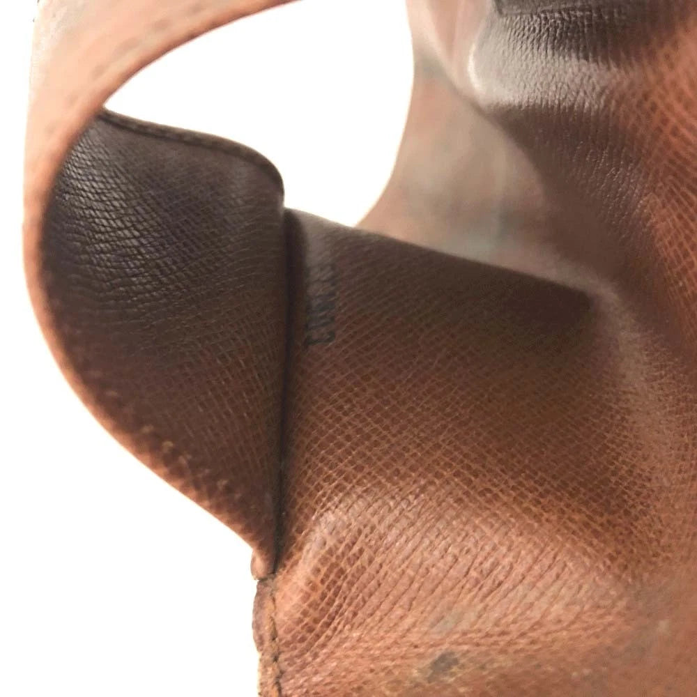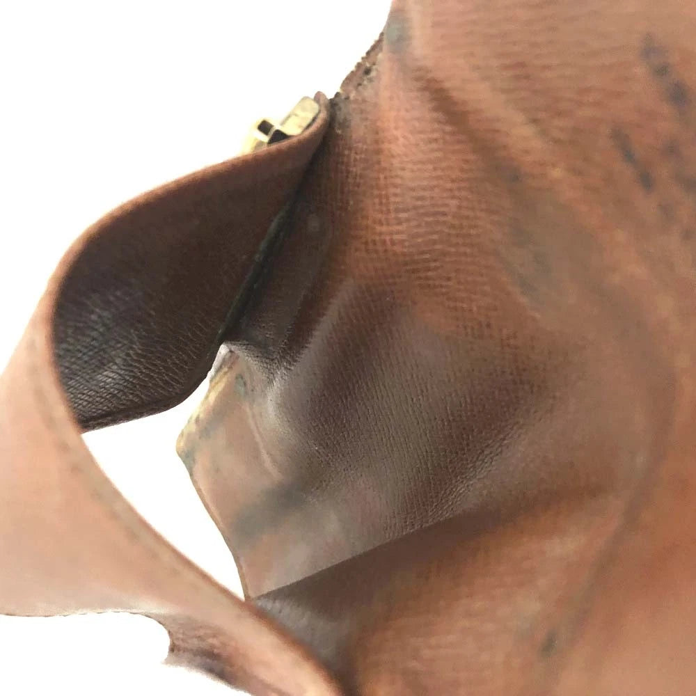 The exterior is rubbed with scratches. There are rubbed marks on the inside. There are loose stitches around the folding area. The surface platings of the hardware is peeling off.