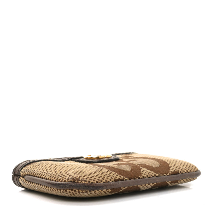 This is an authentic GUCCI Monogram Jumbo GG Textured Dollar Calfskin Ophidia Key Case in Camel and Brown. This coin purse is crafted of coated canvas with the jumbo GG motif. The pouch features brown leather trim with a polished gold GG logo on the front. The top zipper opens to a fabric interior with a D-ring keychain.