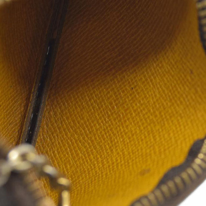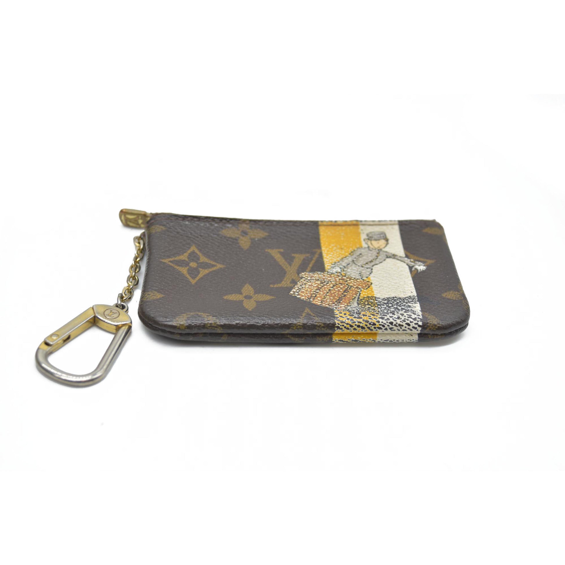 This is an authentic LOUIS VUITTON Monogram Groom Key Pouch. This chic pouch is crafted of Louis Vuitton monogram coated canvas with an illustration of a bellhop carrying luggage. The case opens with a polished gold top zipper to a bold yellow cross grain leather interior with a brass chain and D-ring.