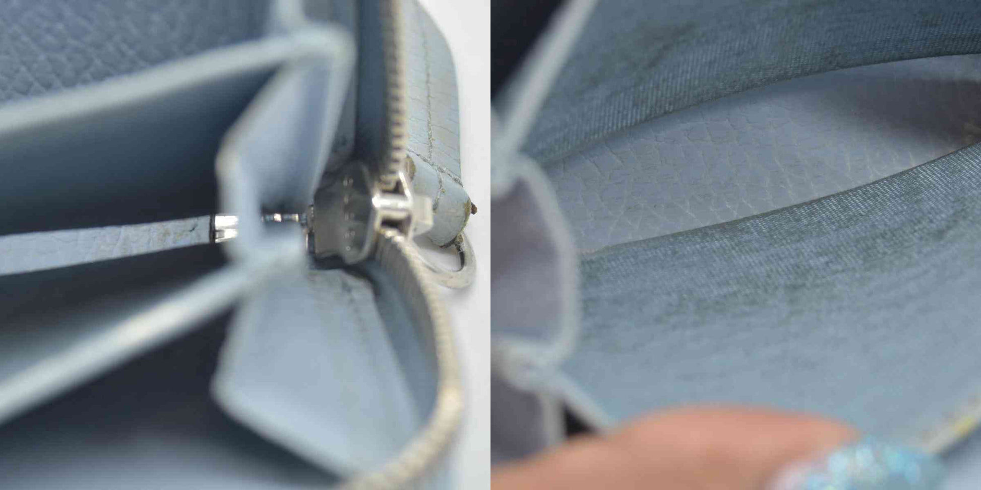 Surface wear, edge wear, corner wear, color loss, creases, marks, discoloration in interior, stretched pockets, dirt/dust, scratches on hardware