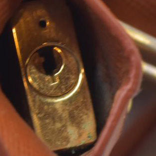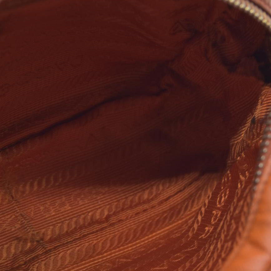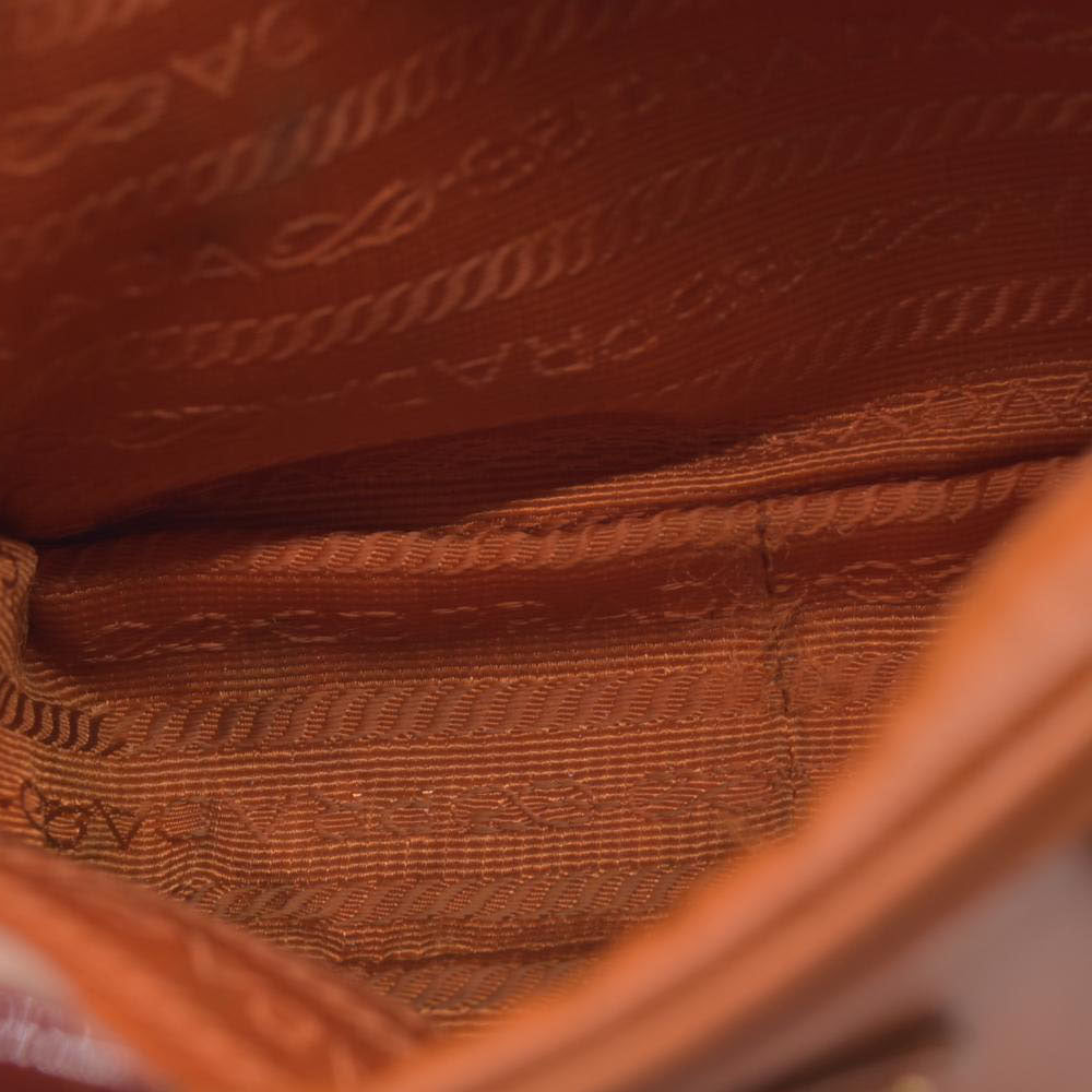 Orange Saffiano leather Prada Lux Mini crossbody bag with gold-tone hardware, dual rolled handles, detachable chain-link and leather shoulder strap, logo placard at front, tonal jacquard lining and zip closure at top. Includes clochette, lock and keys.