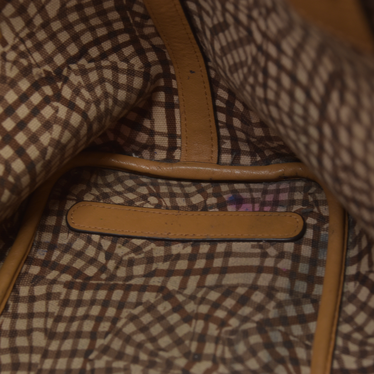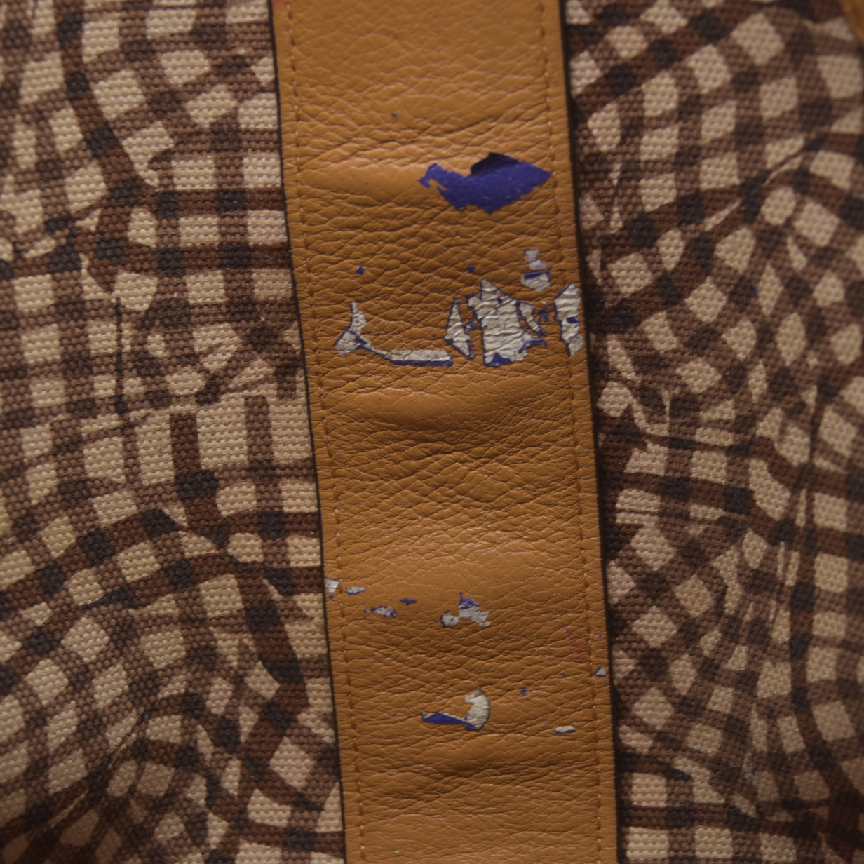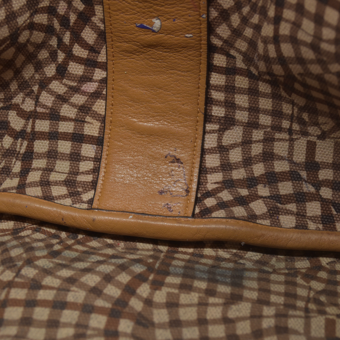 Heavy wear throughout; Moderate scuffs at exterior; moderate discoloration at handle; minor discoloration throughout; shape has relaxed due to wear, stains on interior