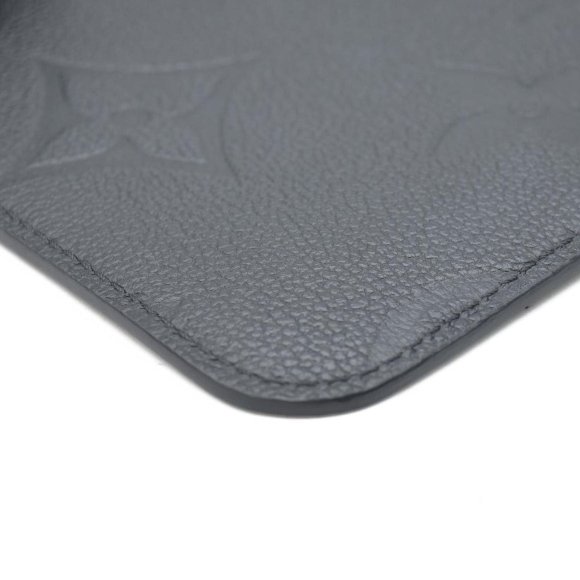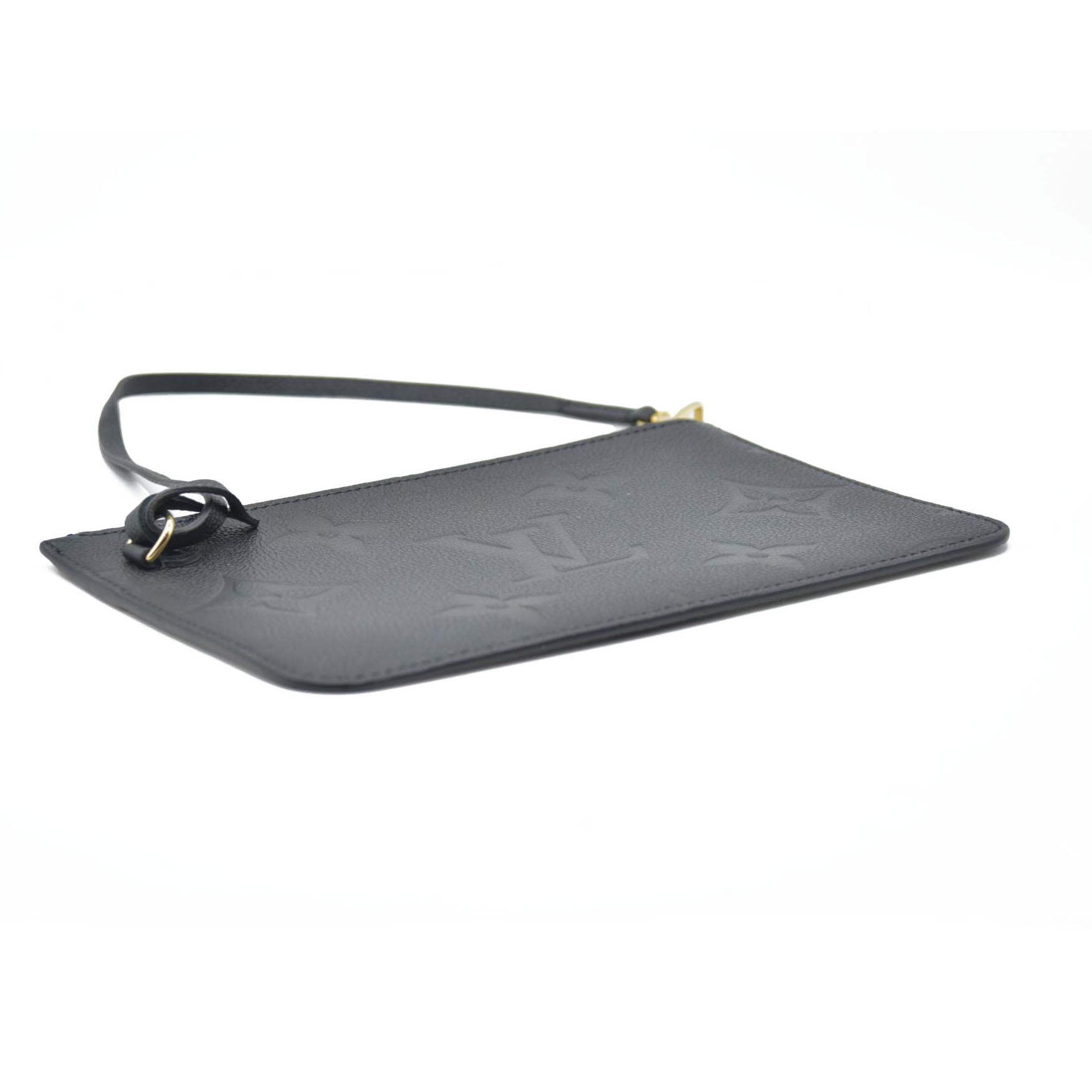 This is an authentic LOUIS VUITTON Empreinte Monogram Giant Neverfull MM Pochette in Black. This embossed monogram leather clutch features a wristlet strap, which can connect to the D-ring inside a Neverfull as an accessory, or can also be worn solo. This pochette opens with a polished brass top zipper to a navy blue microfiber interior.