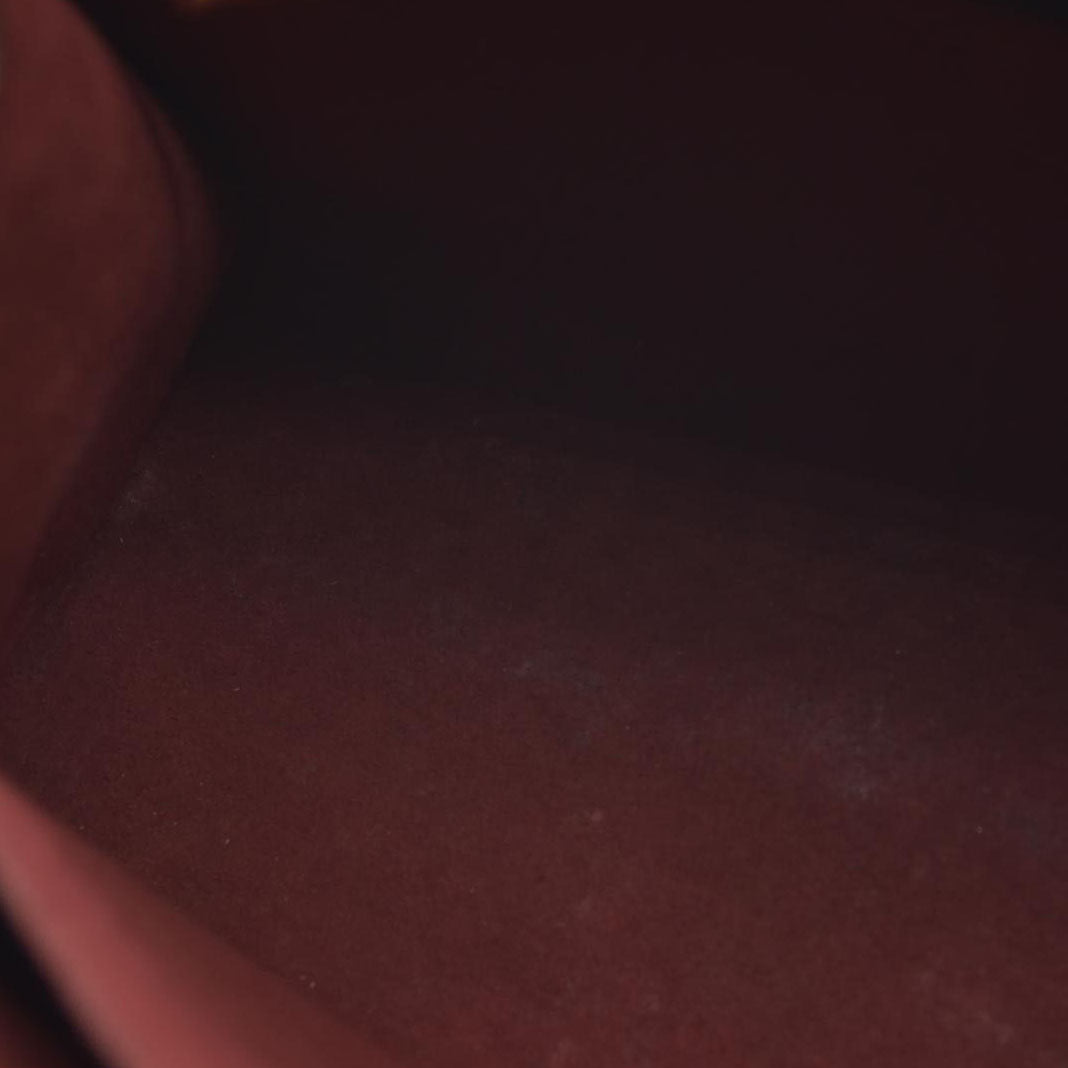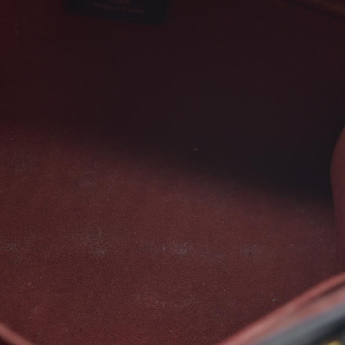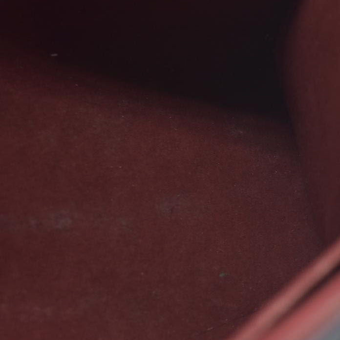Heavy scuffs at base; heavy wear at strap; minor discoloration at interior; minor cracking at exterior.