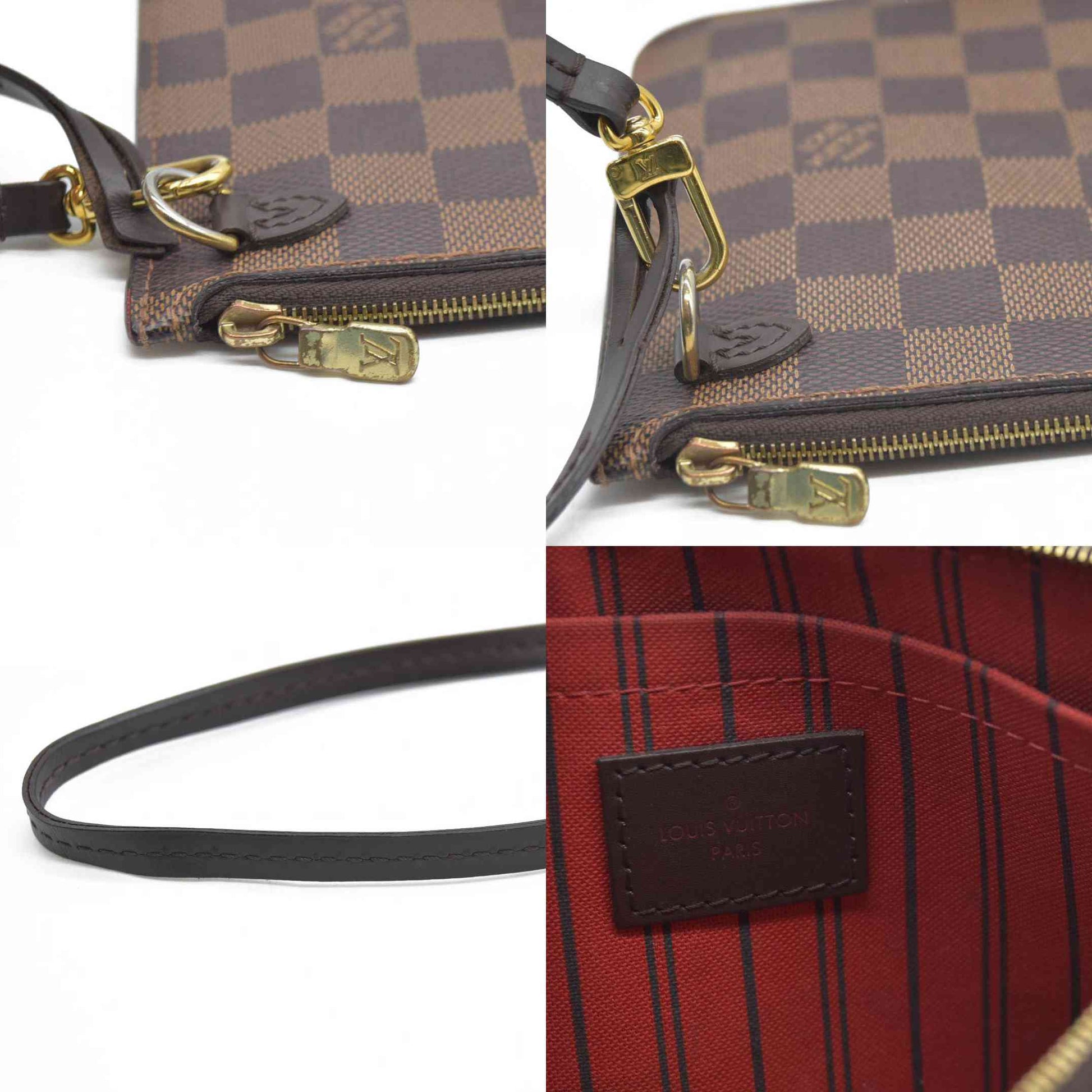 This is the authentic LOUIS VUITTON Damier Ebene Neverfull MM GM Pochette. This pouch is crafted of signature Louis Vuitton checkerboard-coated canvas in brown with a removable chocolate brown leather strap. It features a polished gold-toned top zipper that opens to a dark red striped fabric interior with a patch pocket.