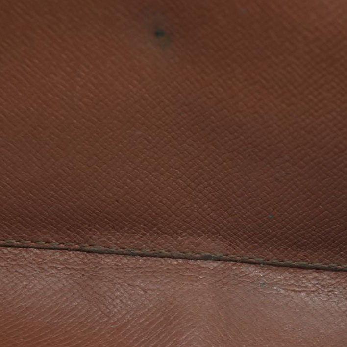 The exterior is rubbed with scratches. There are loose stitches around the folding area. There are rubbed marks on the inside. The inside of pocket is peeled.