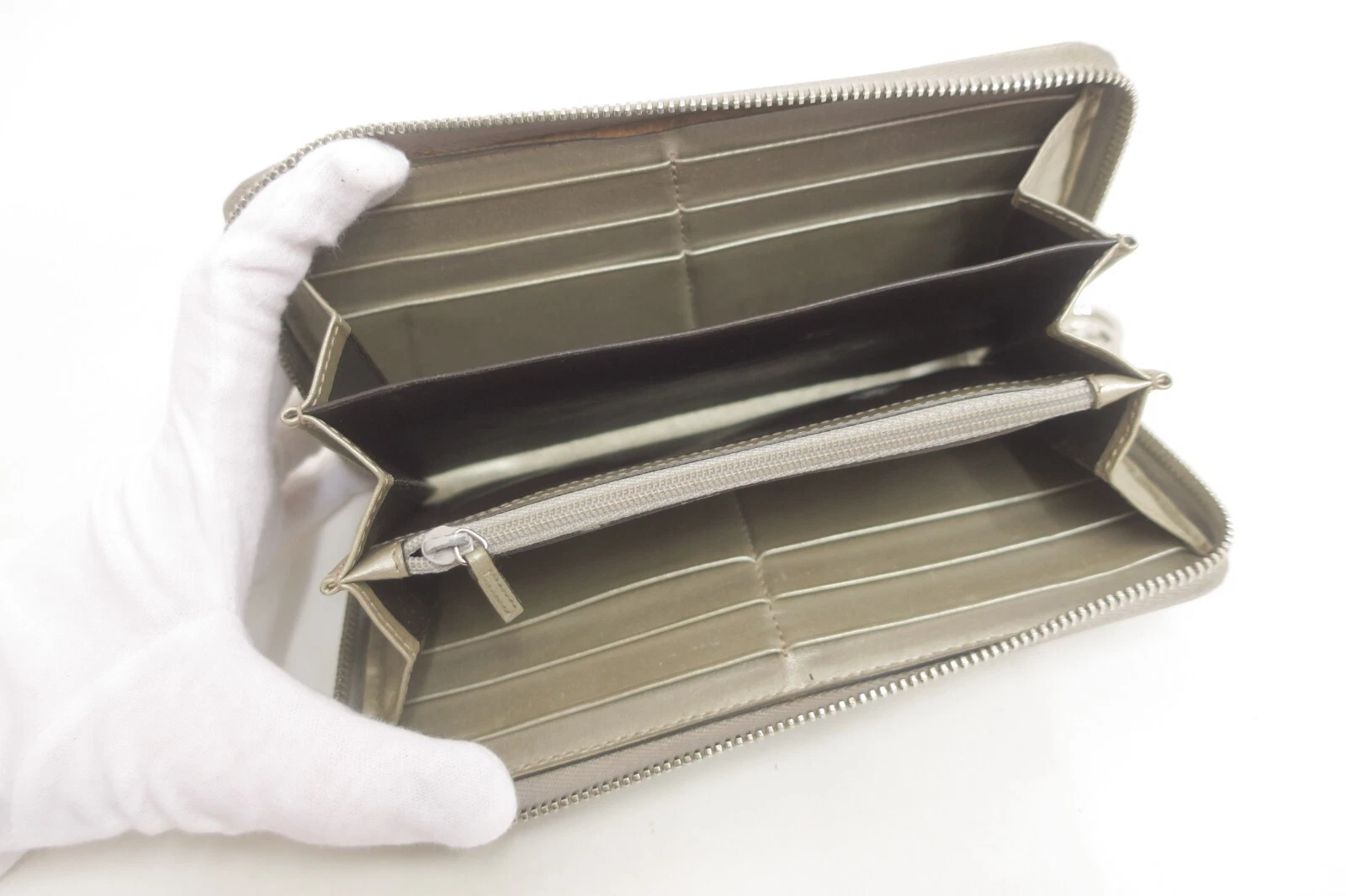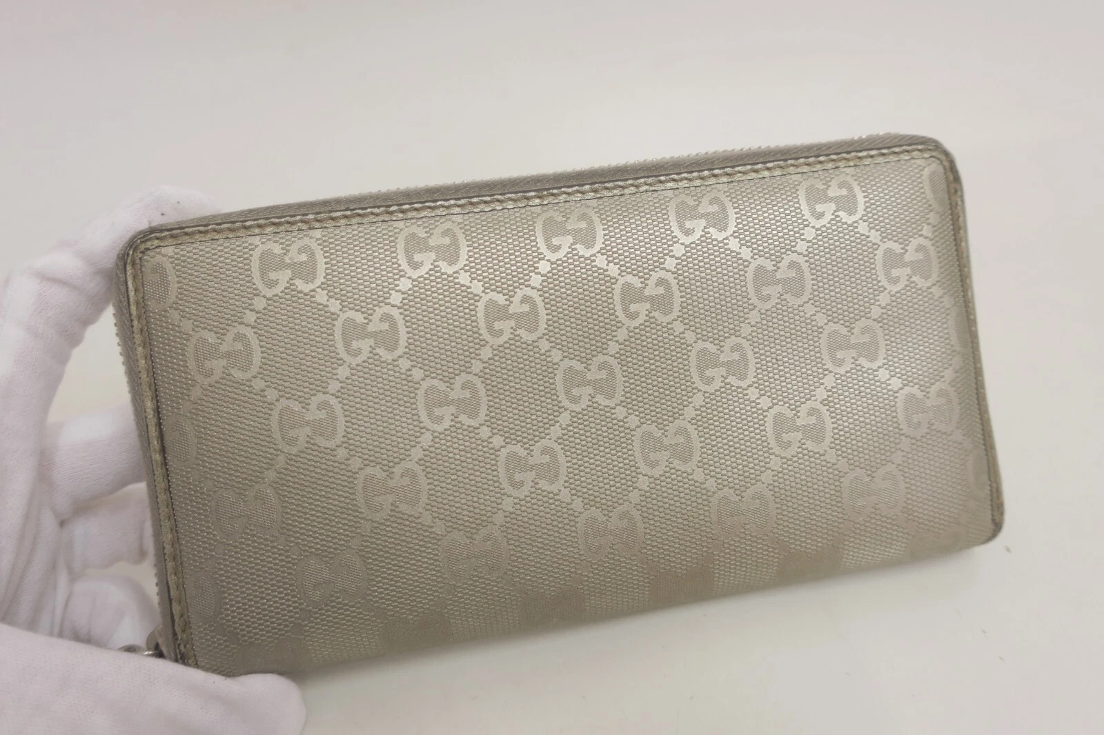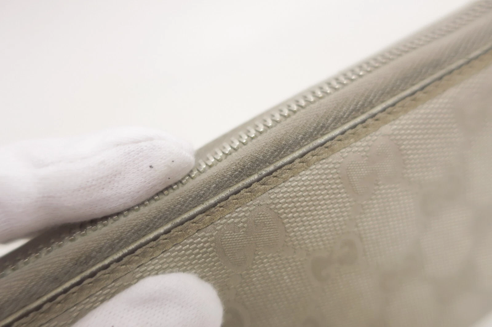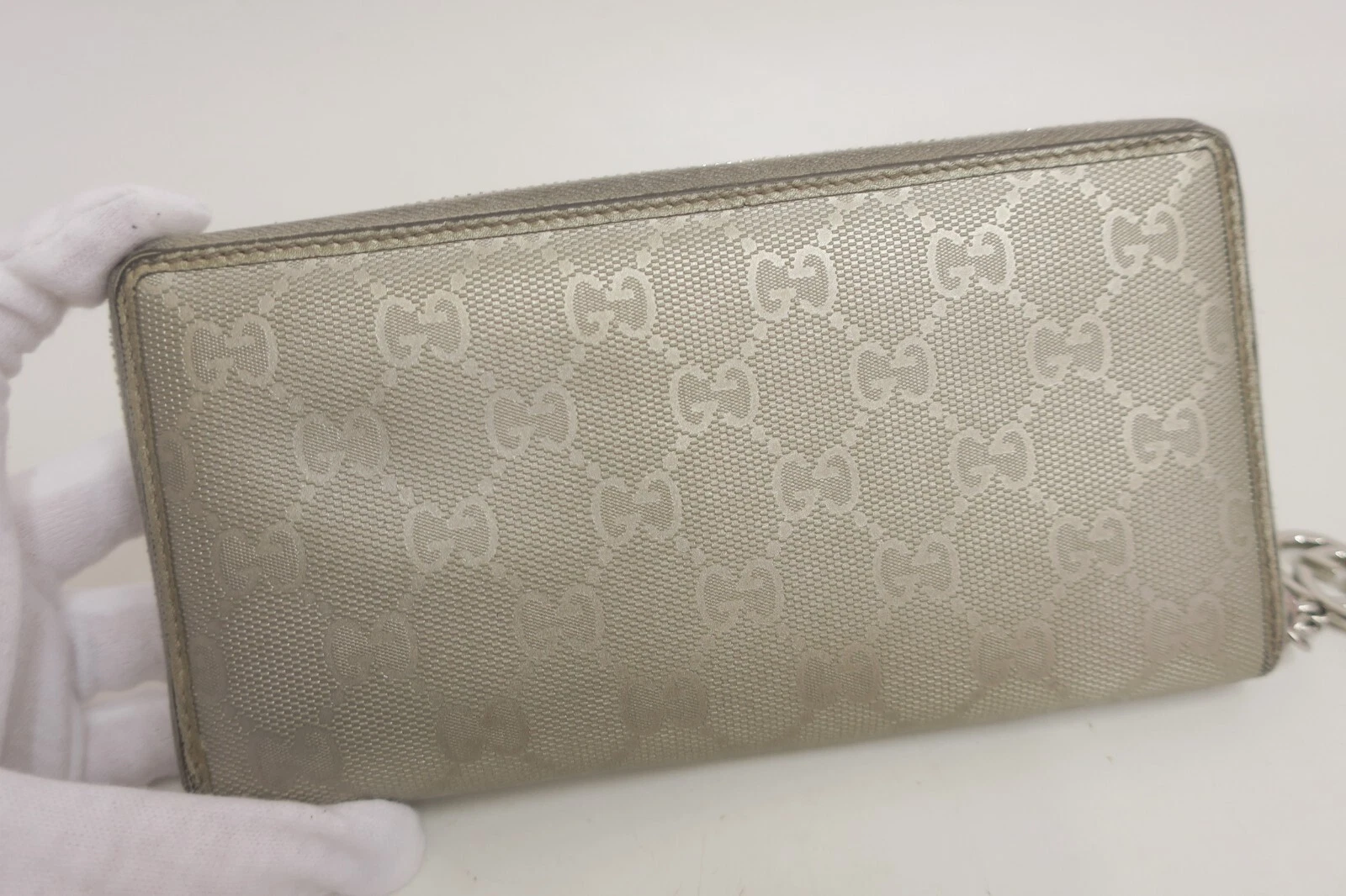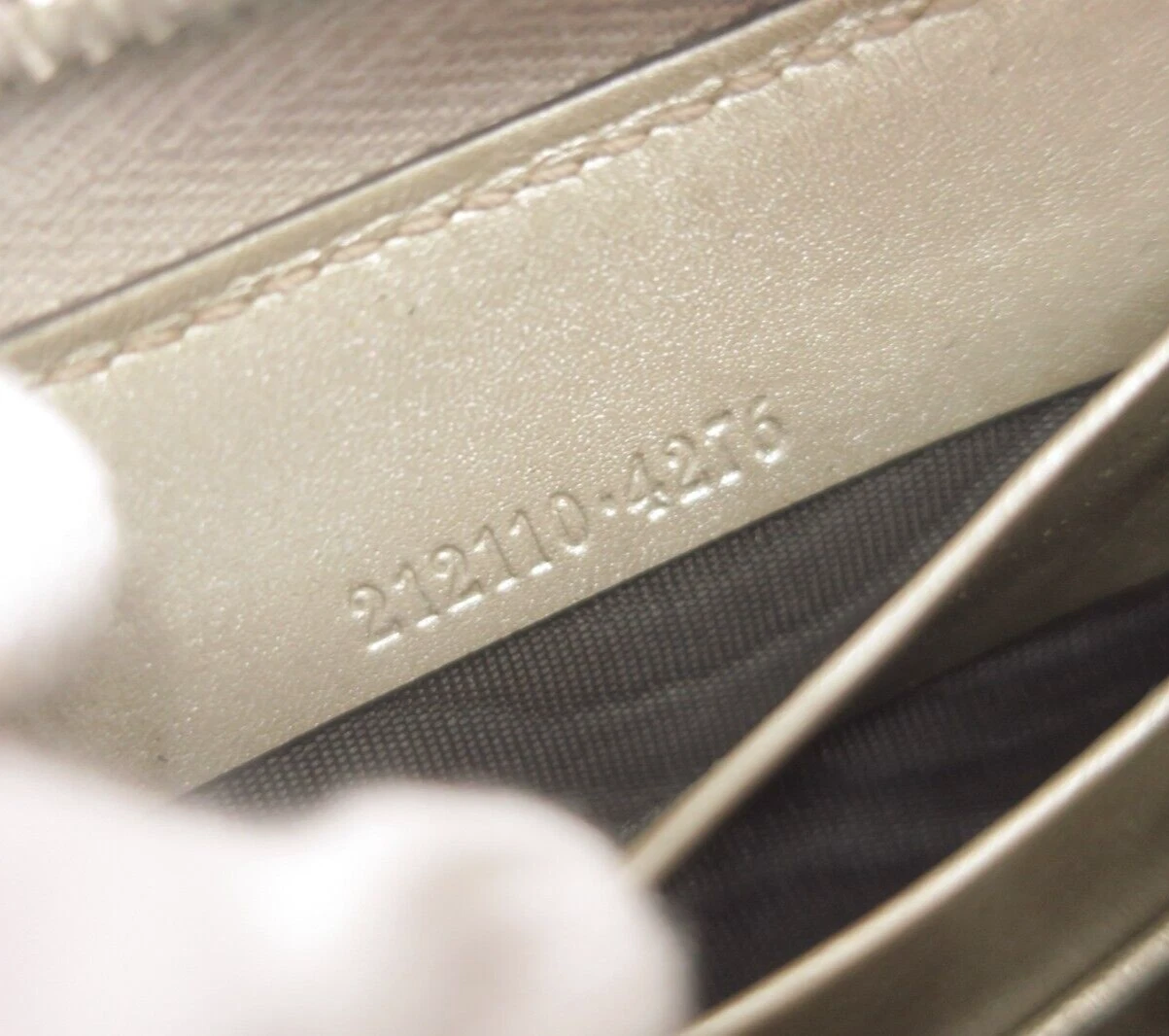 This sophisticated Gucci zip-around wallet is crafted from durable GG Imprime canvas in a versatile metallic champagne hue. Designed for maximum organization and style, the signature monogram pattern offers a subtle yet recognizable luxury finish.