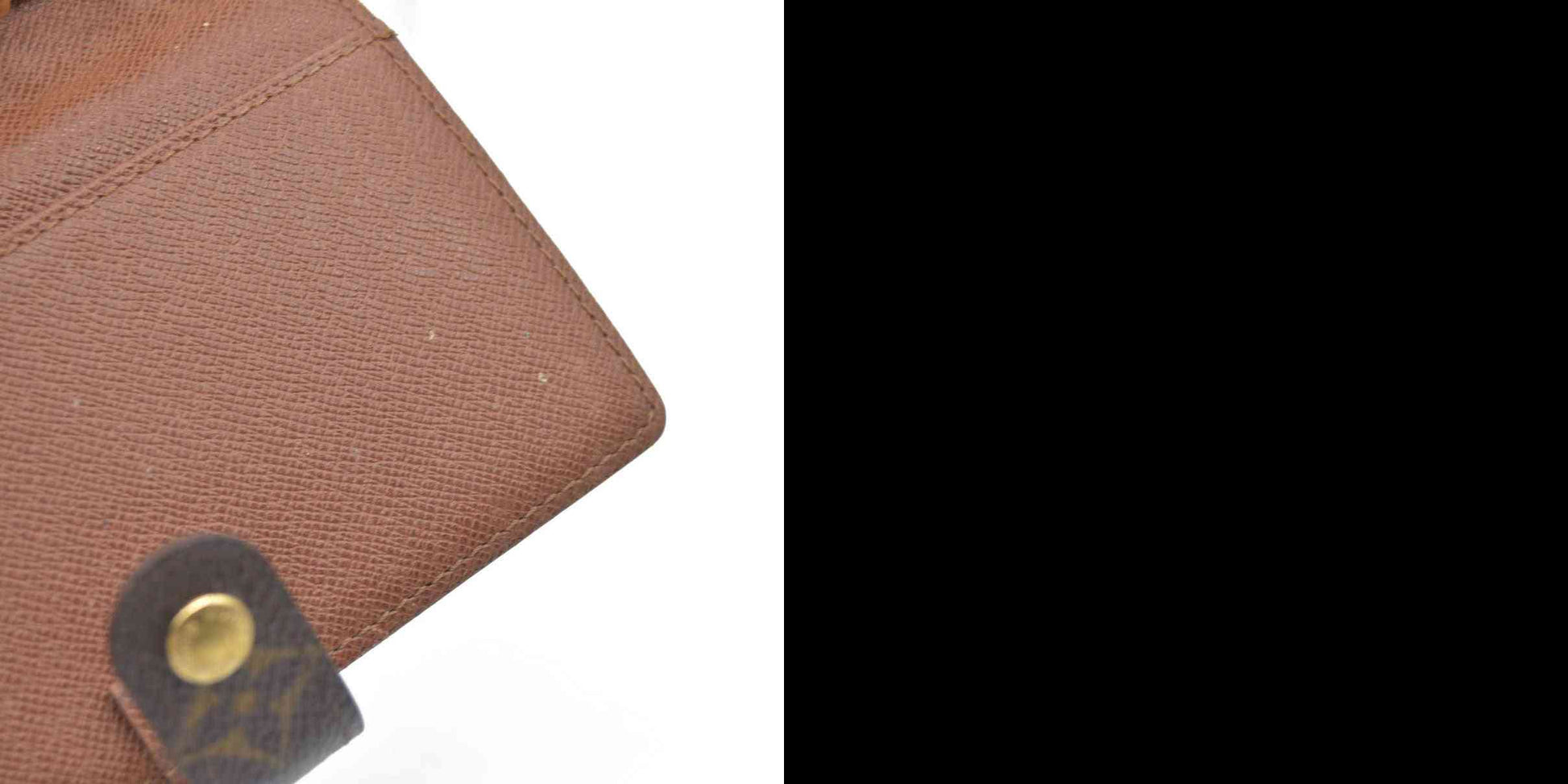 Brown and tan coated canvas Louis Vuitton Monogram medium ring agenda cover with brass hardware, brown leather lining, six interior card slots, single slit compartment, single internal flap brand stamp at interior and snap closure at front