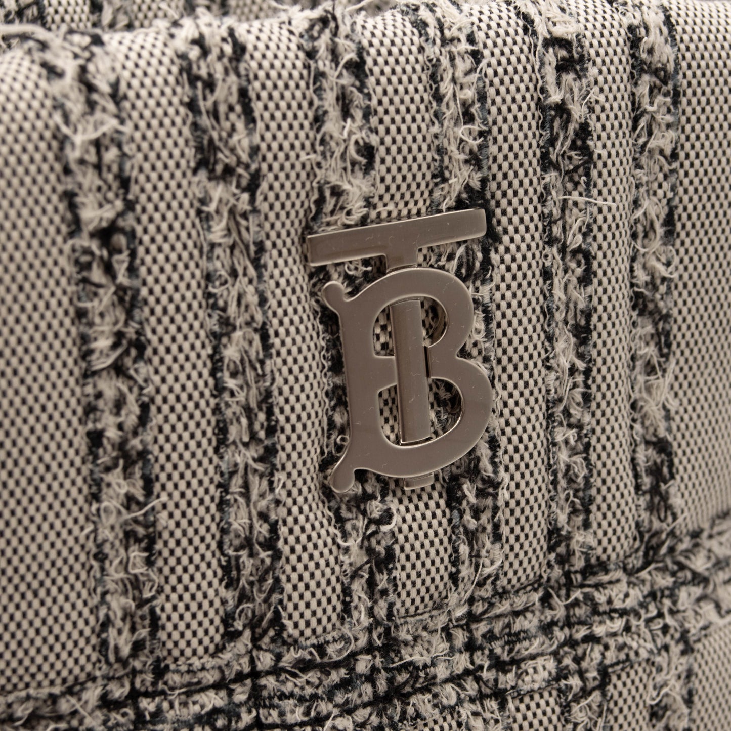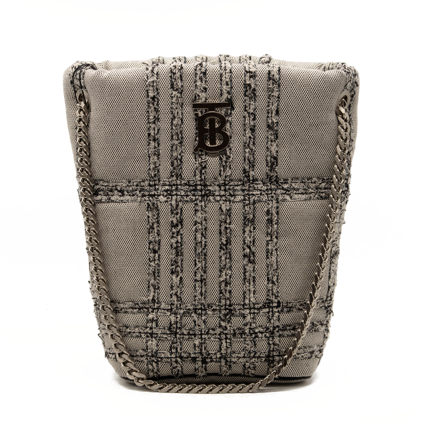 Textural needle-punch embroidery creates Burberry's iconic check on this compact bucket bag polished with a gleaming curb-link chain strap and TB monogram.
