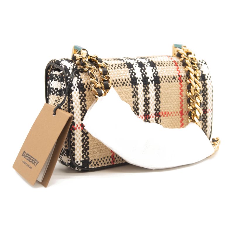 Vintage-check bouclé Lola bag from BURBERRY featuring archive beige, cotton-wool blend, bouclé construction, Vintage Check pattern, chain-link shoulder strap, logo plaque and foldover top with magnetic fastening.