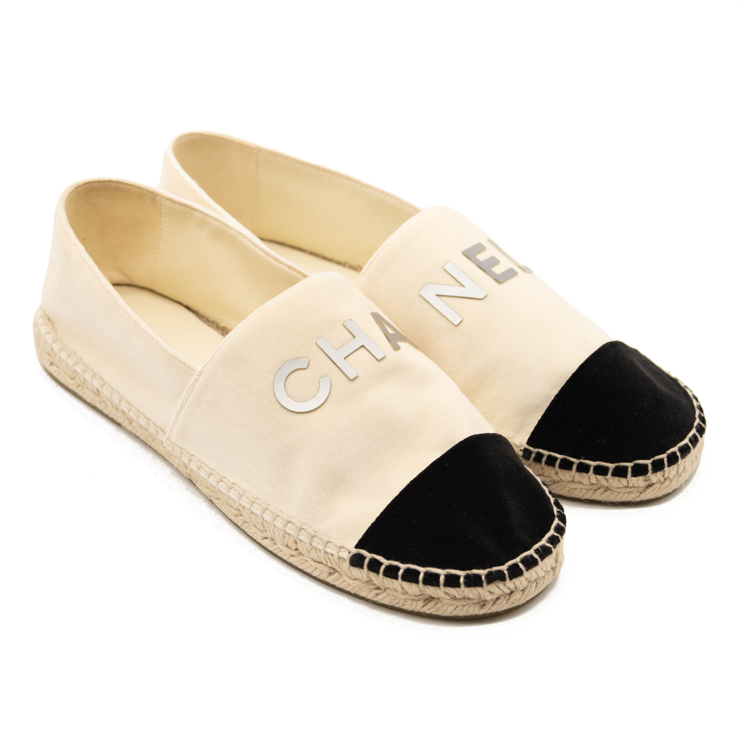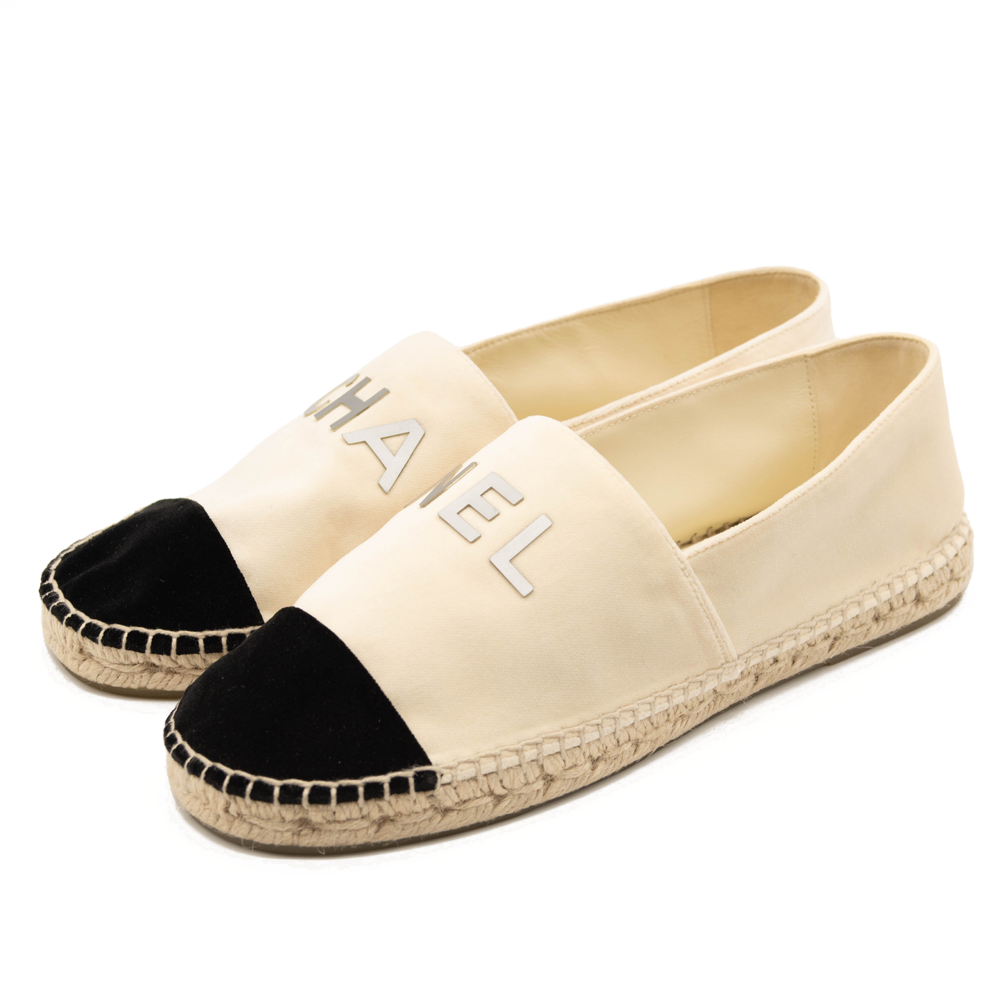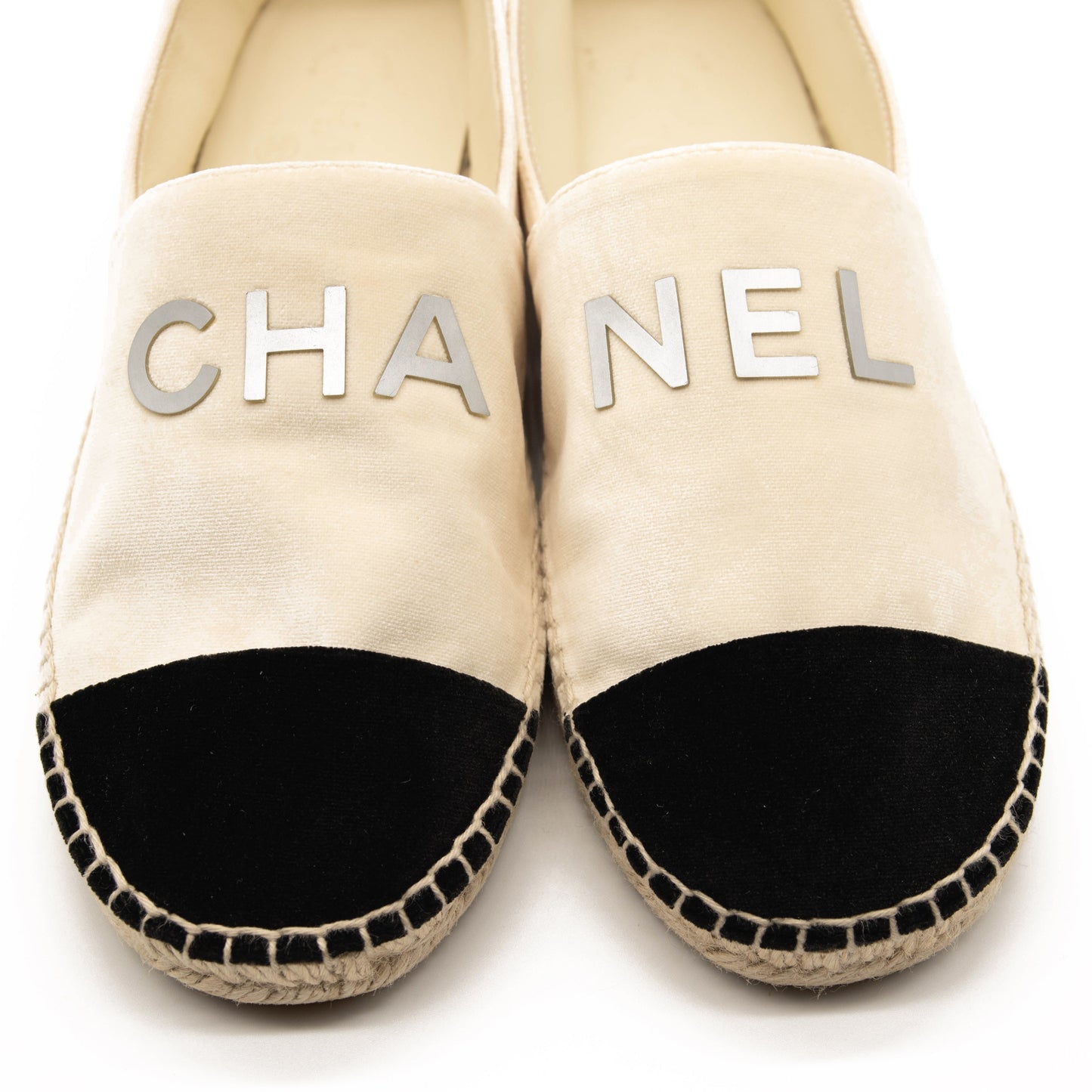 We guarantee this is an authentic CHANEL Velvet Logo Espadrilles 40 Beige Black or 100% of your money back. These espadrilles have a slim midsole with uppers of fine velvet in beige. They feature a prominent white Chanel logo at the front of each shoe and have a black toe cap.