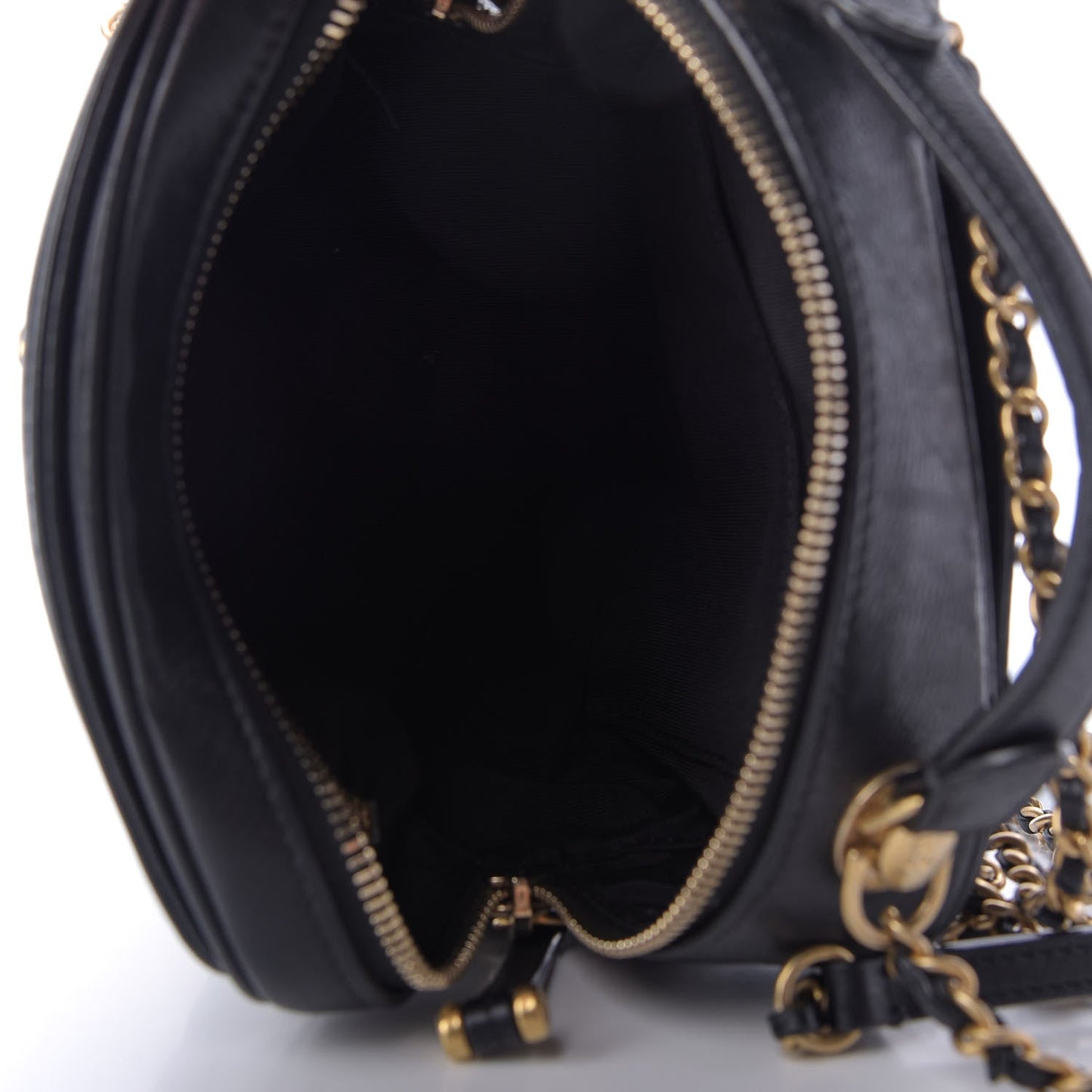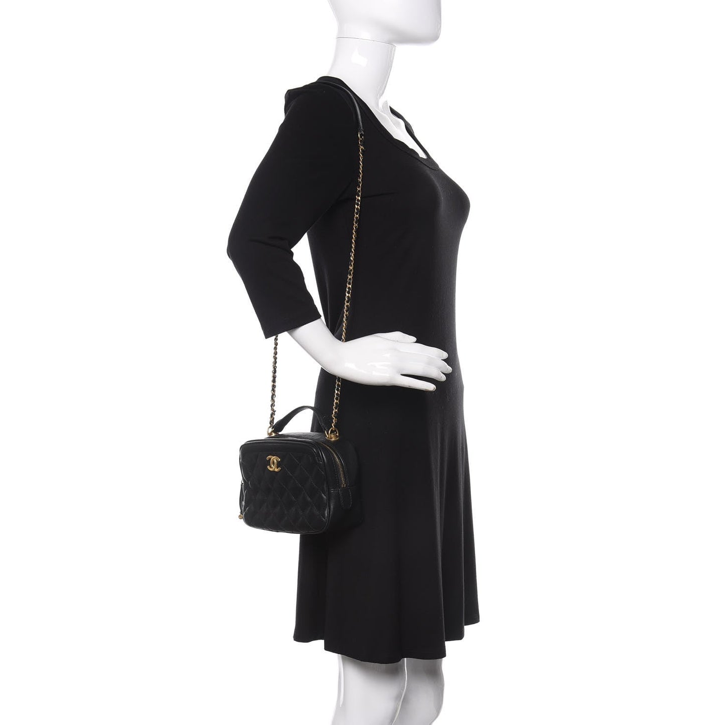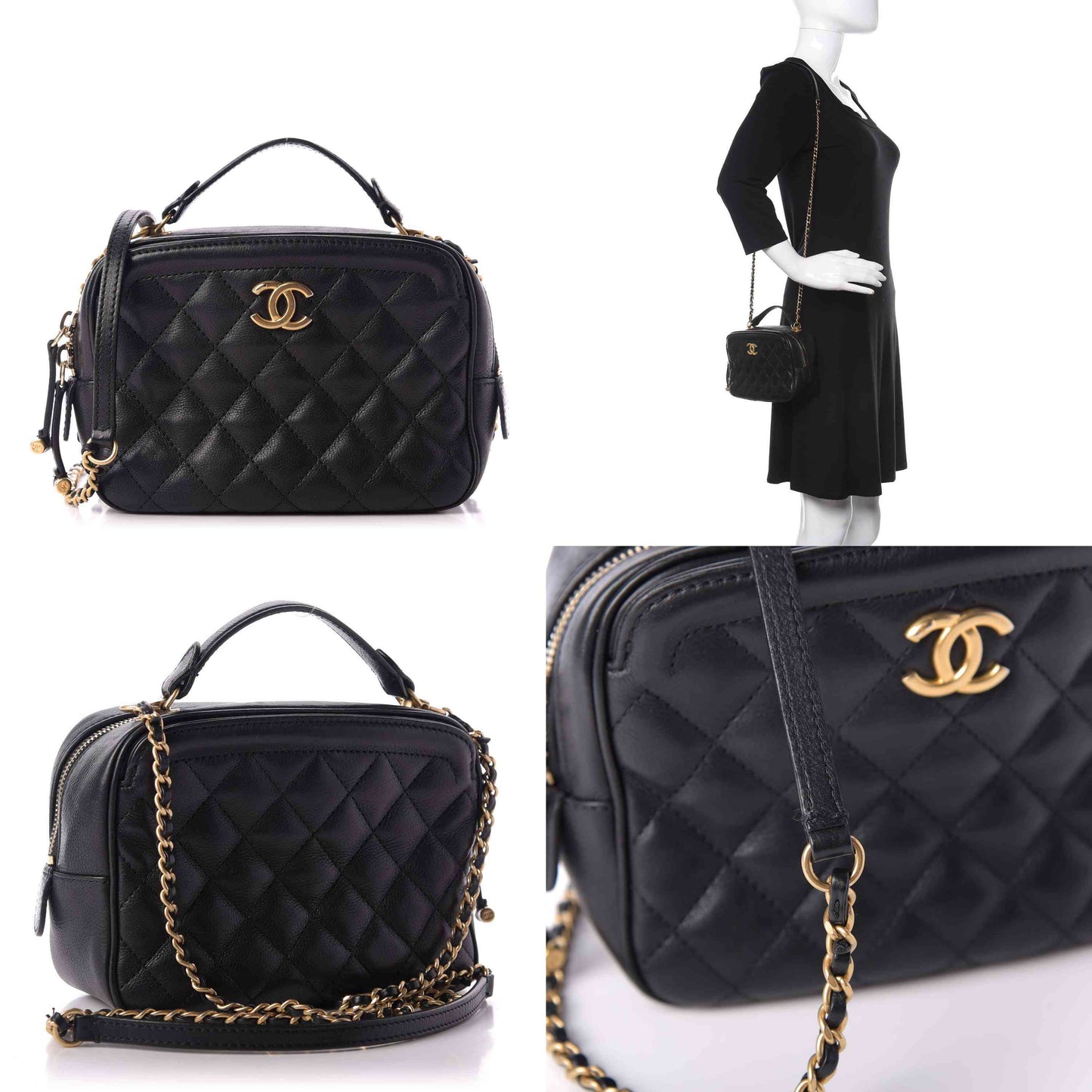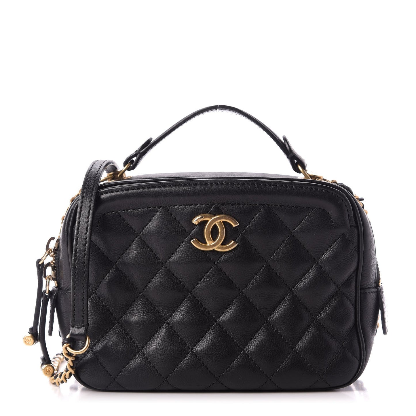 This is an authentic CHANEL Calfskin Quilted CC Small Vanity Case in Black. This chic shoulder bag is finely crafted of luxurious grained calfskin leather in black. The bag features a leather-threaded an aged gold-tone chain shoulder strap and a Chanel CC logo on the front. The top zippers open to a black fabric interior with zipper and patch pockets.
