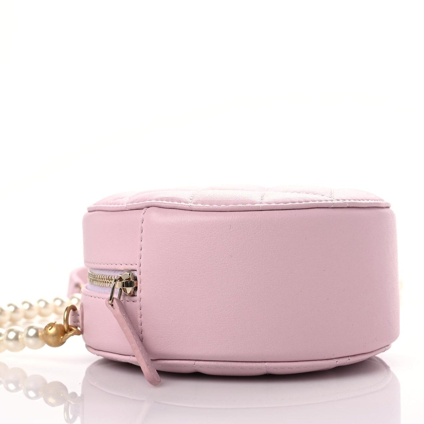 This is an authentic CHANEL Calfskin Quilted Pearl Round Clutch With Chain Light Pink. This stylish crossbody bag is crafted of luxurious calfskin leather in light pink. The bag features a faux pearl shoulder strap with a leather pad and a gold Chanel CC logo on the front. This shoulder bag opens with a top zipper to a matching fabric interior with patch pockets.