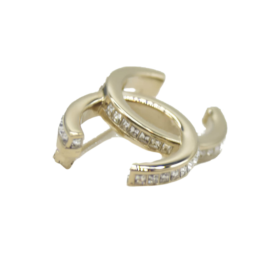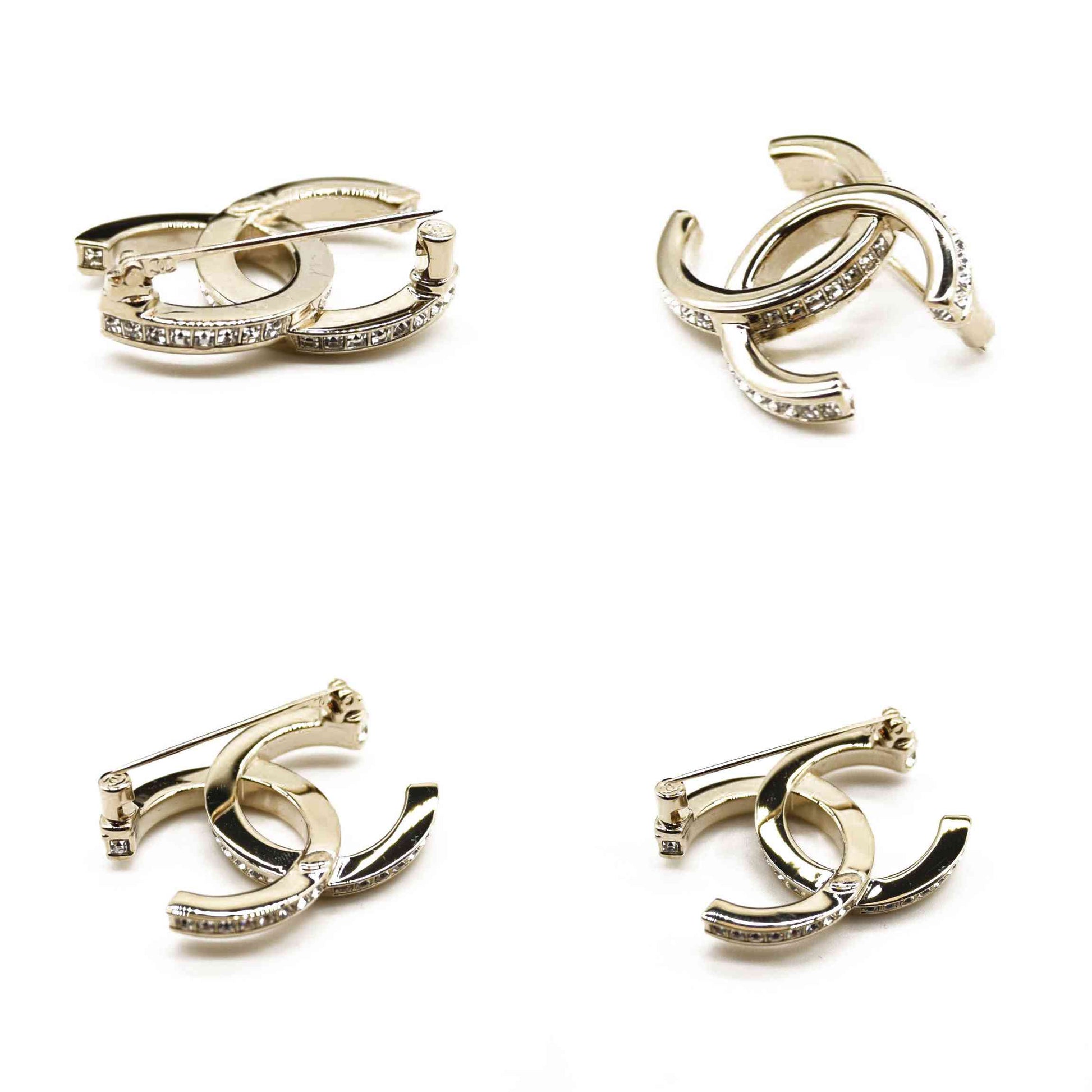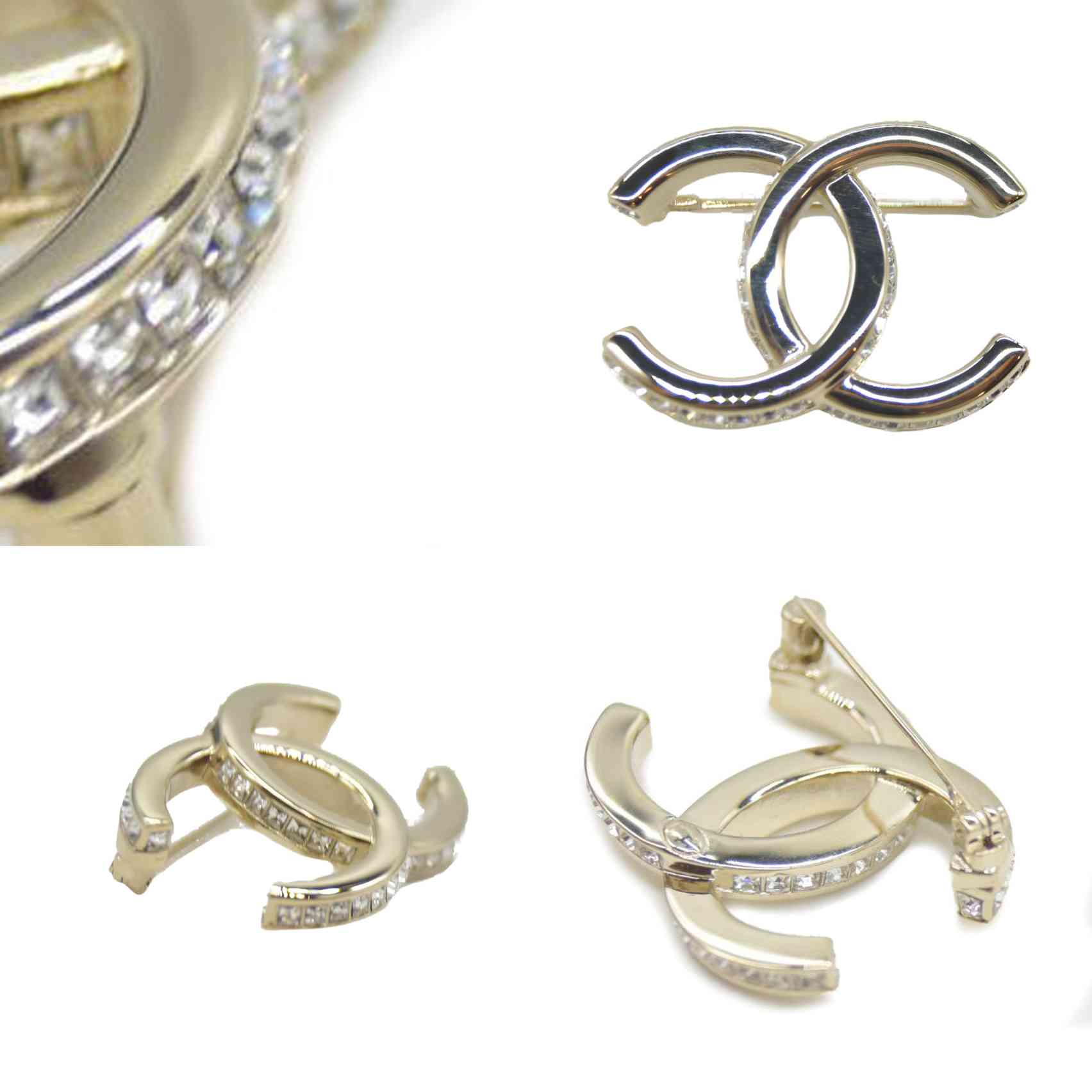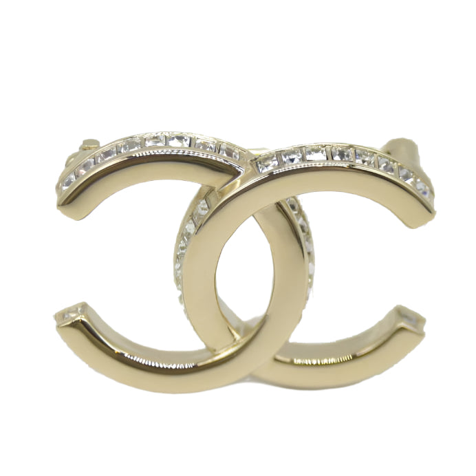 This is an authentic CHANEL Crystal CC Brooch in Gold. This brooch is a large gold Chanel CC logo lined with square crystals.
