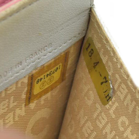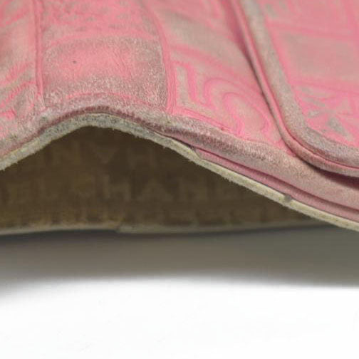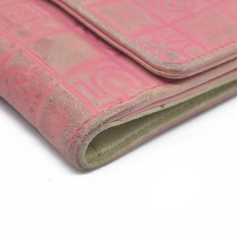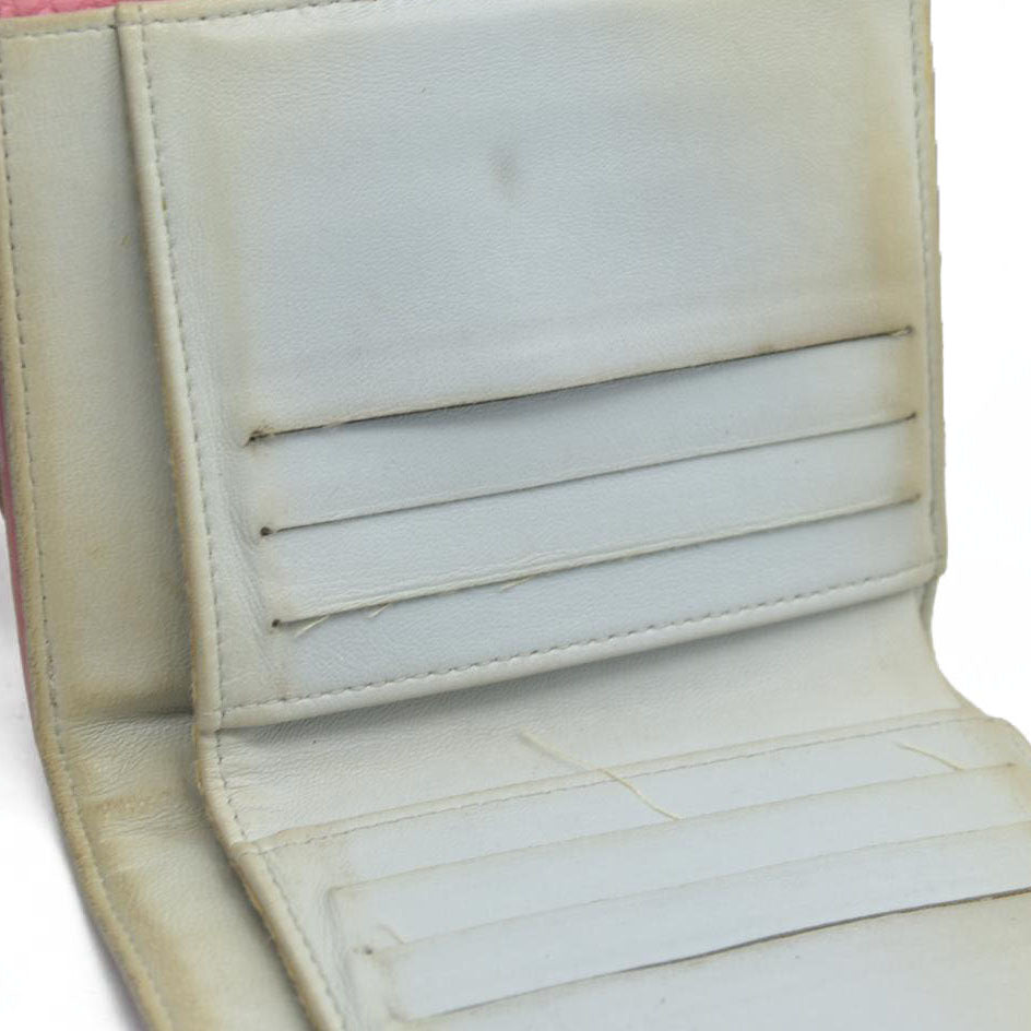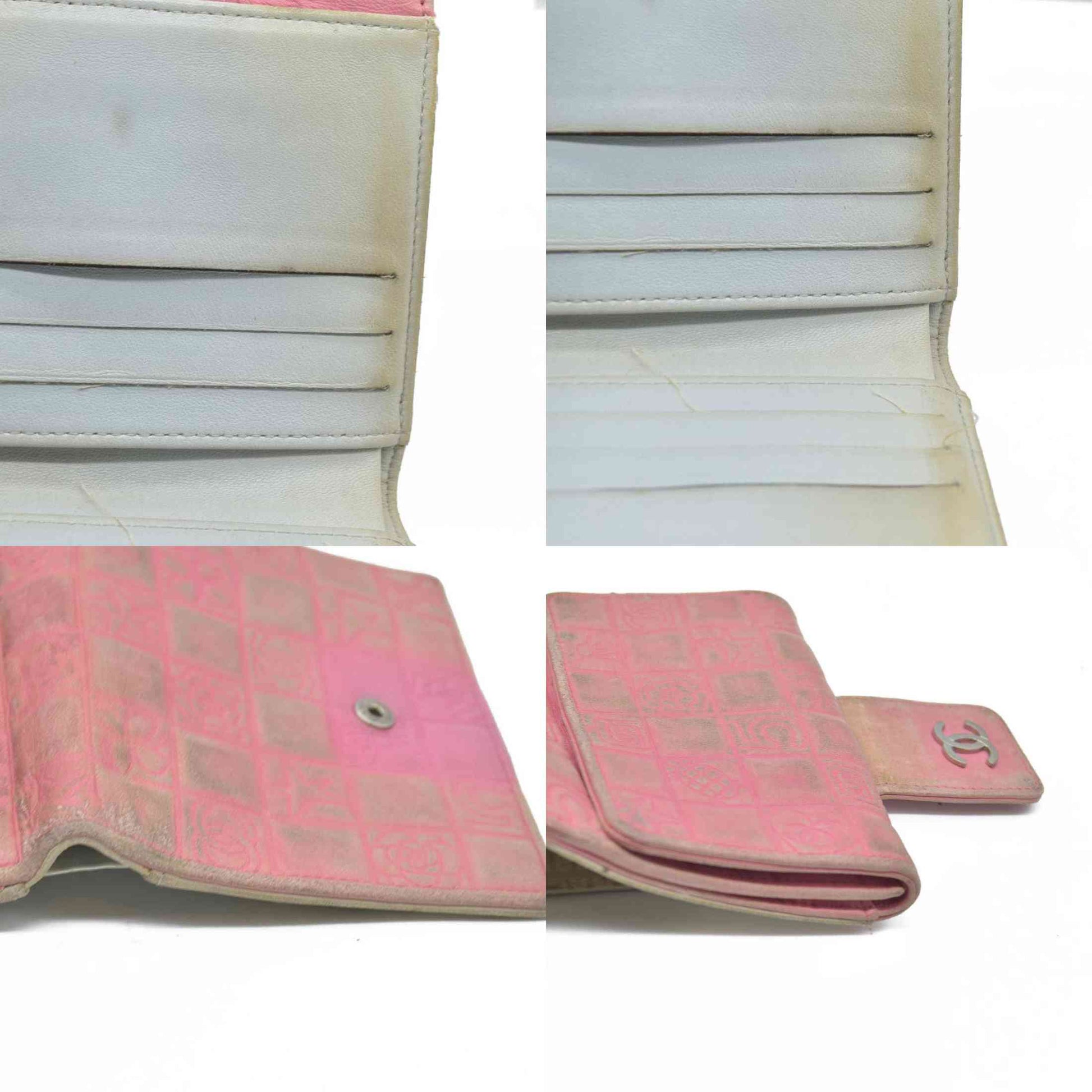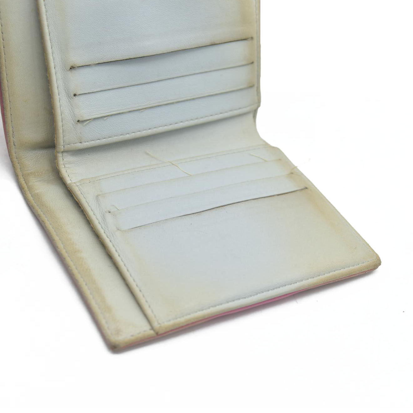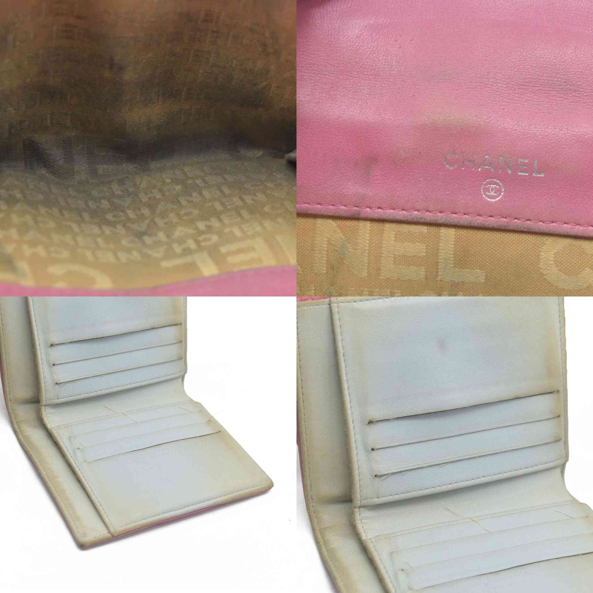 This Chanel bi-fold wallet is crafted from soft lambskin leather in a pink hue, offering a stylish accessory for everyday use.