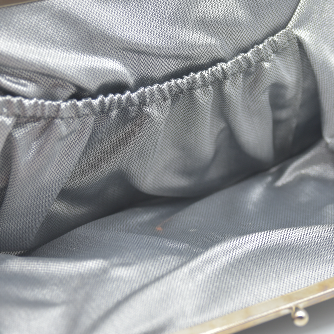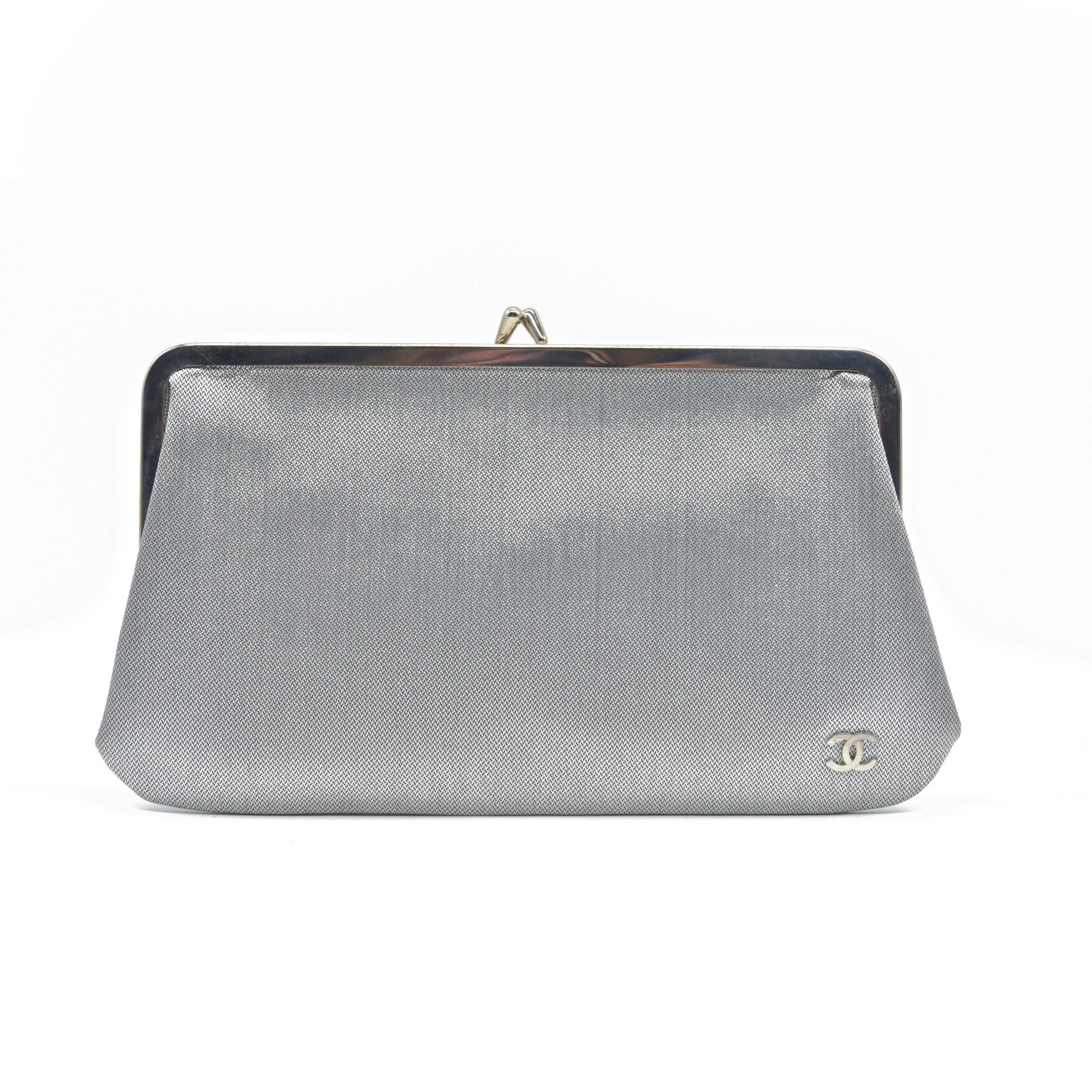 CHANEL Silver Nylon CC Kisslock Frame Clutch.Mademoiselle Line with Pouch Plain Silver Gray Women's.