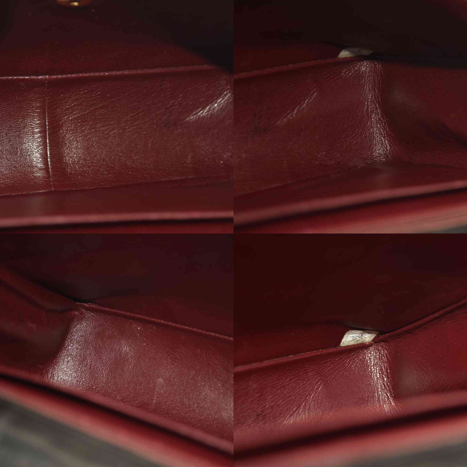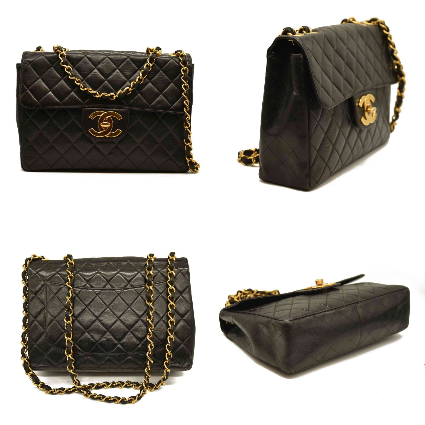 This is an authentic CHANEL Lambskin Quilted Jumbo Single Flap in Black. This stunning flap bag is finely crafted of quilted black lambskin leather. The bag features a gold chain-link shoulder strap threaded with black leather, a frontal flap, a rear patch pocket and an oversized 24k gold plated Chanel CC turn-lock. This opens to a burgundy leather interior with zipper and patch pockets.