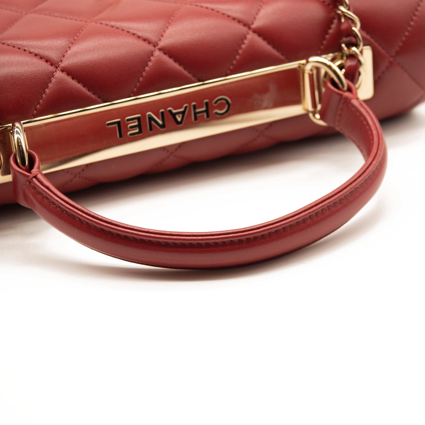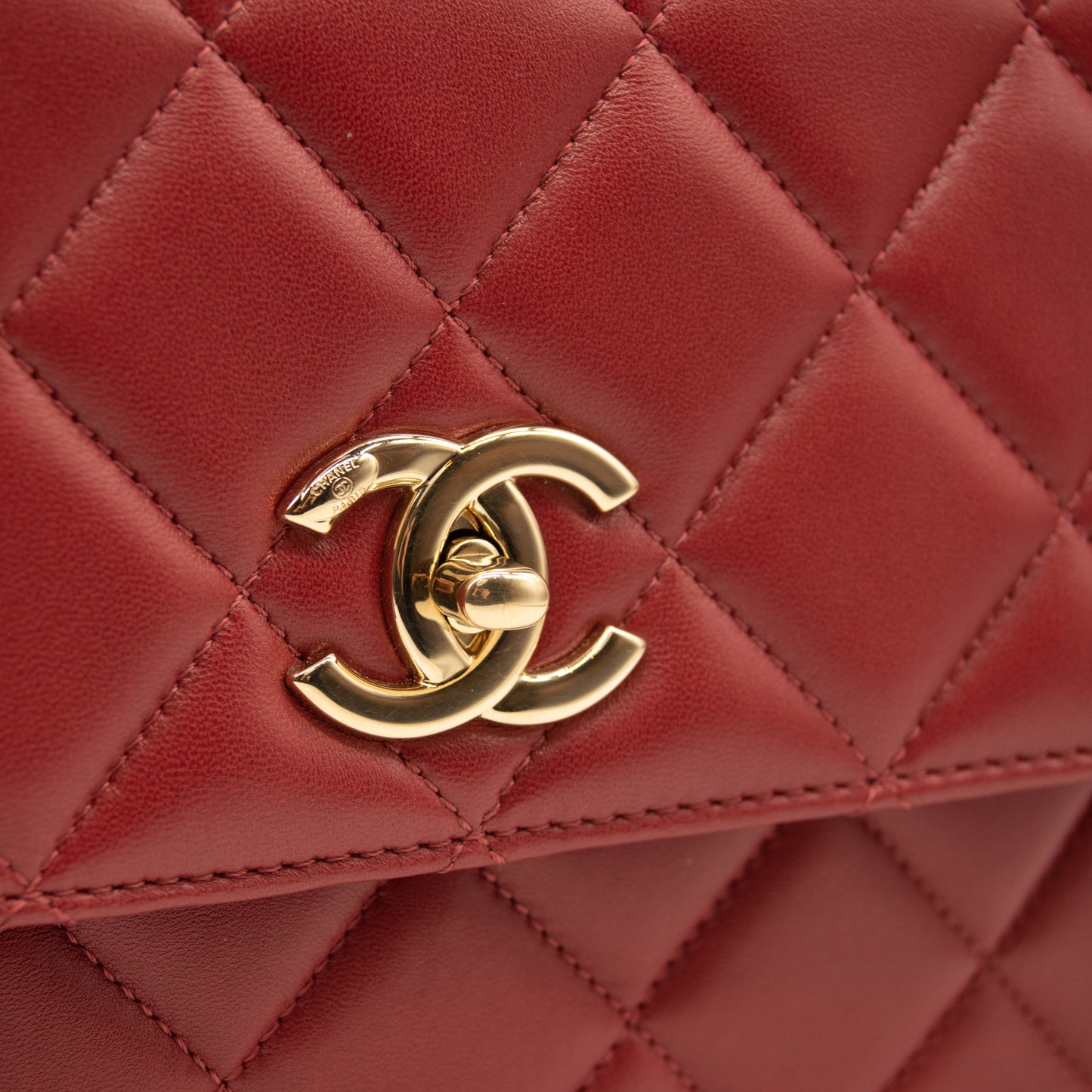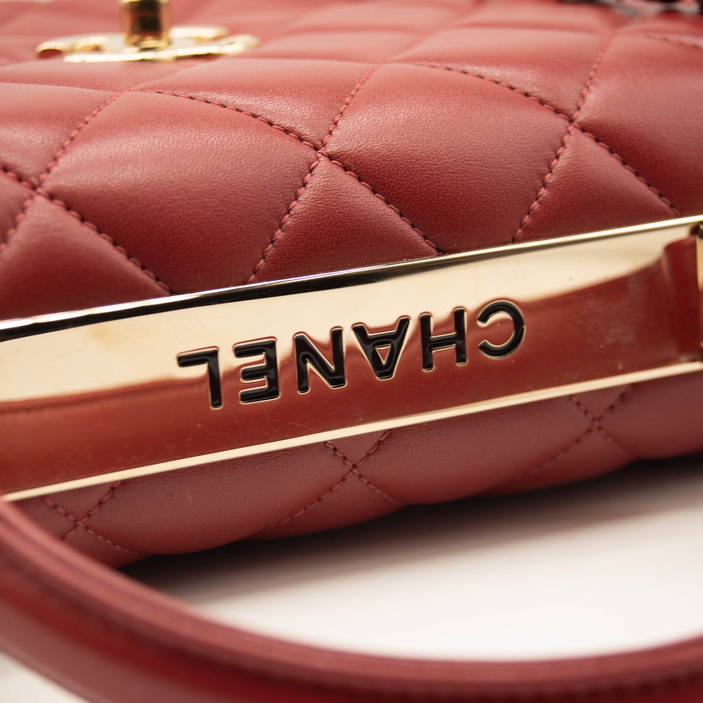 This is an authentic CHANEL Lambskin Quilted Medium Trendy CC Flap Dual Handle Bag in Red. This stylish handbag is crafted of diamond quilted lambskin leather in red. This refined bag features a reinforced leather top handle, a gold chain leather threaded shoulder strap with a shoulder pad, and polished gold hardware. These open to a partitioned matching leather interior with zipper and patch pockets. This bag is ideal for any occasion with the timeless style, from Chanel!