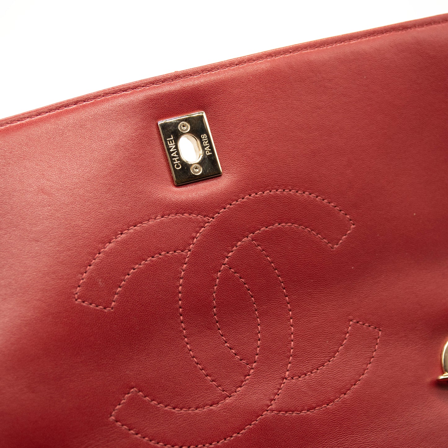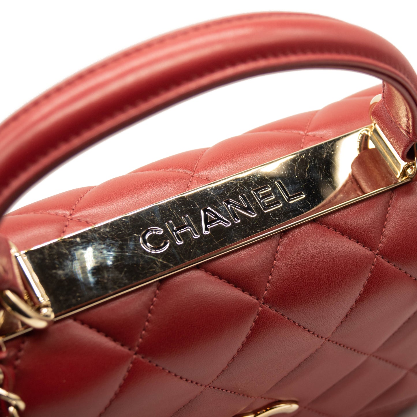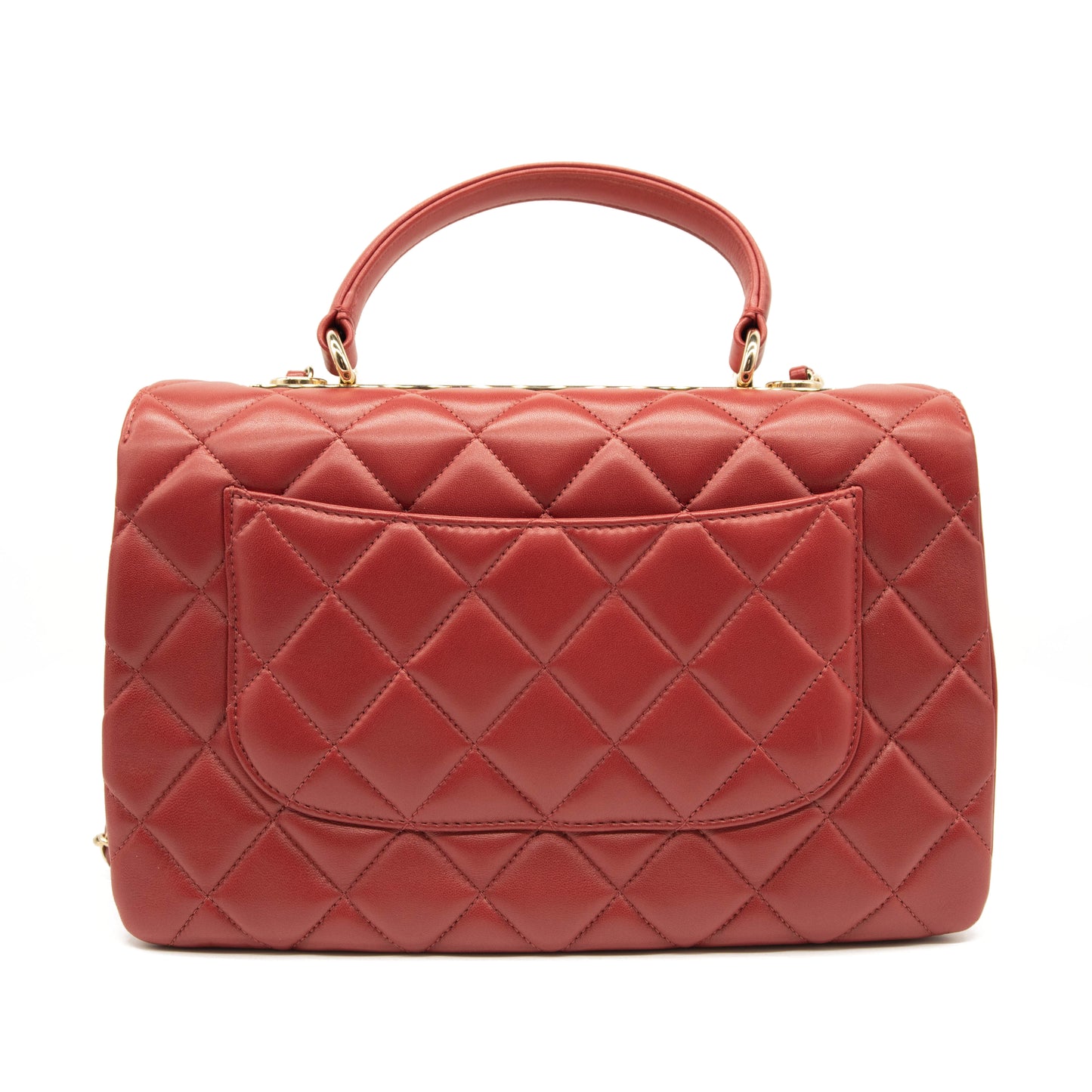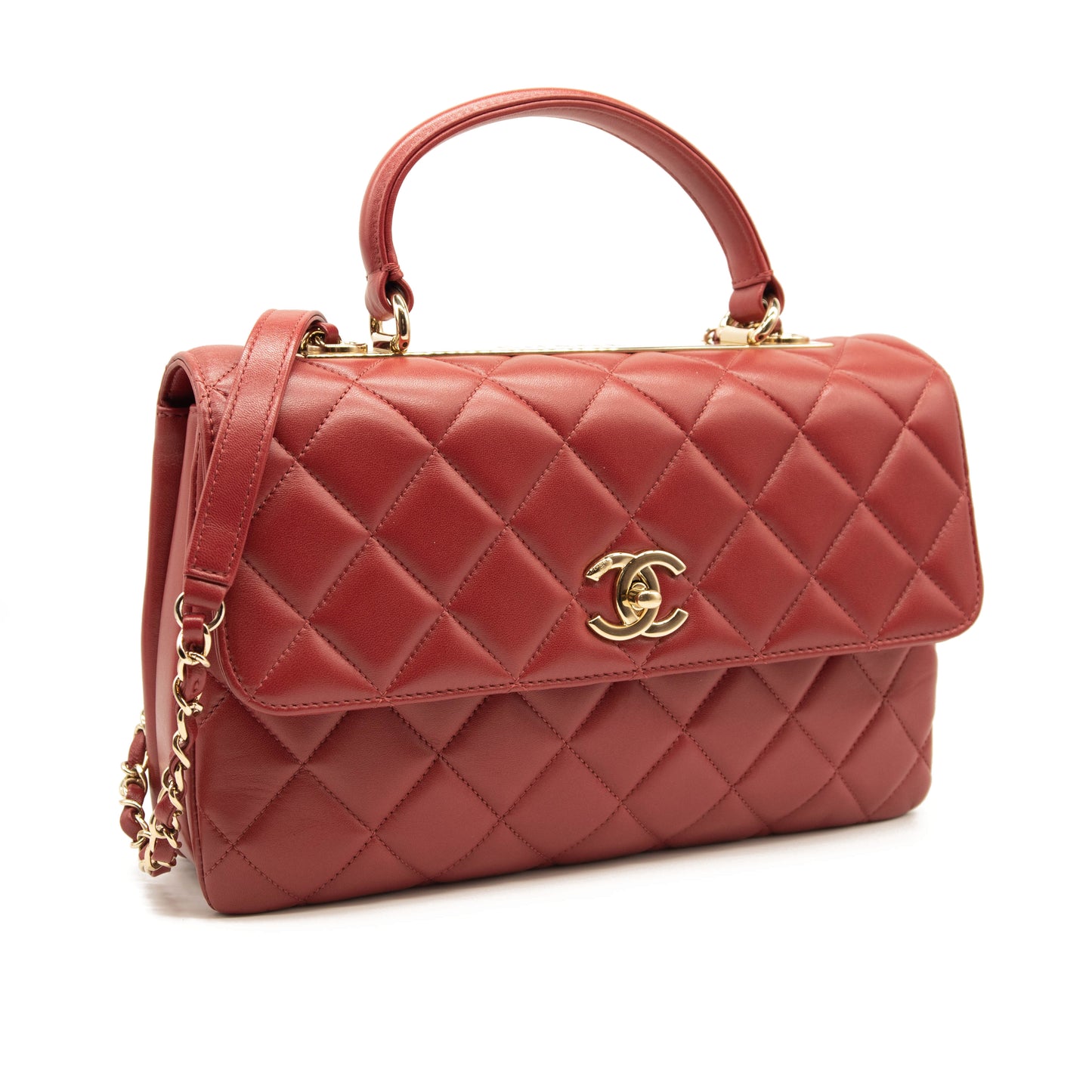 This is an authentic CHANEL Lambskin Quilted Medium Trendy CC Flap Dual Handle Bag in Red. This stylish handbag is crafted of diamond quilted lambskin leather in red. This refined bag features a reinforced leather top handle, a gold chain leather threaded shoulder strap with a shoulder pad, and polished gold hardware. These open to a partitioned matching leather interior with zipper and patch pockets. This bag is ideal for any occasion with the timeless style, from Chanel!