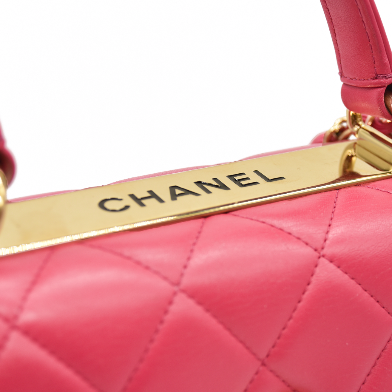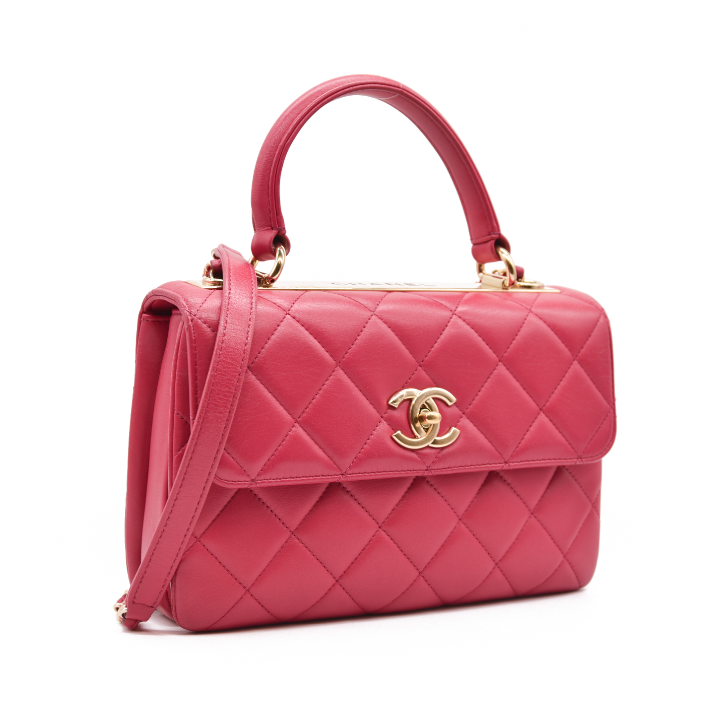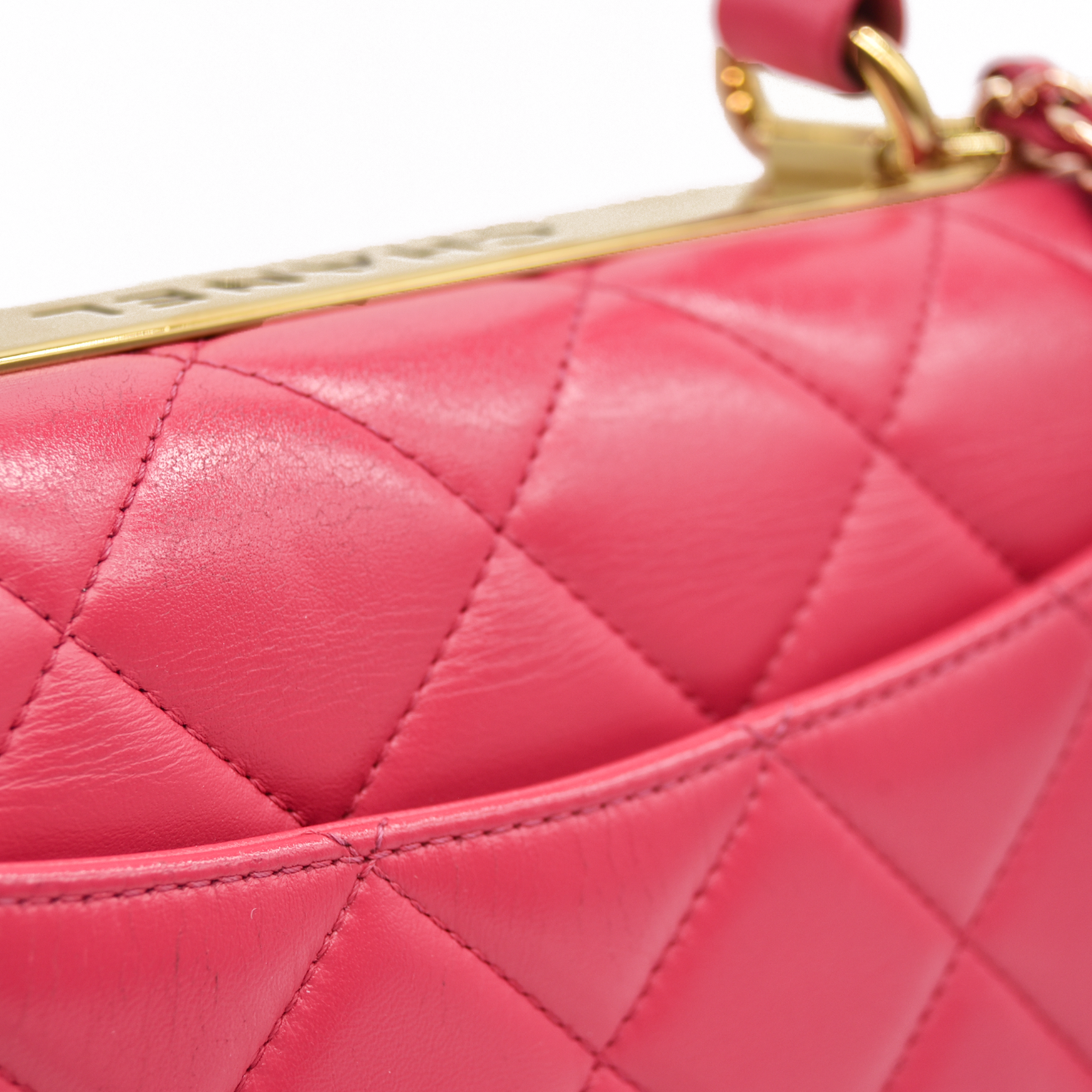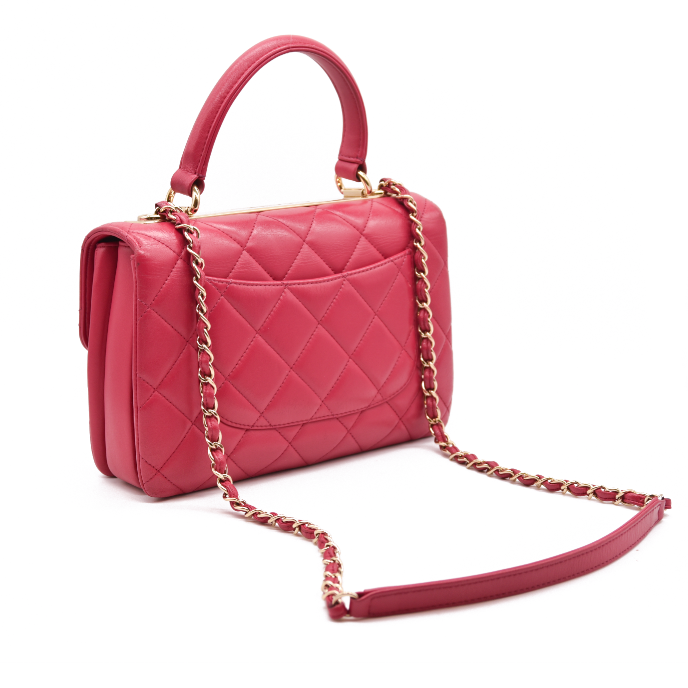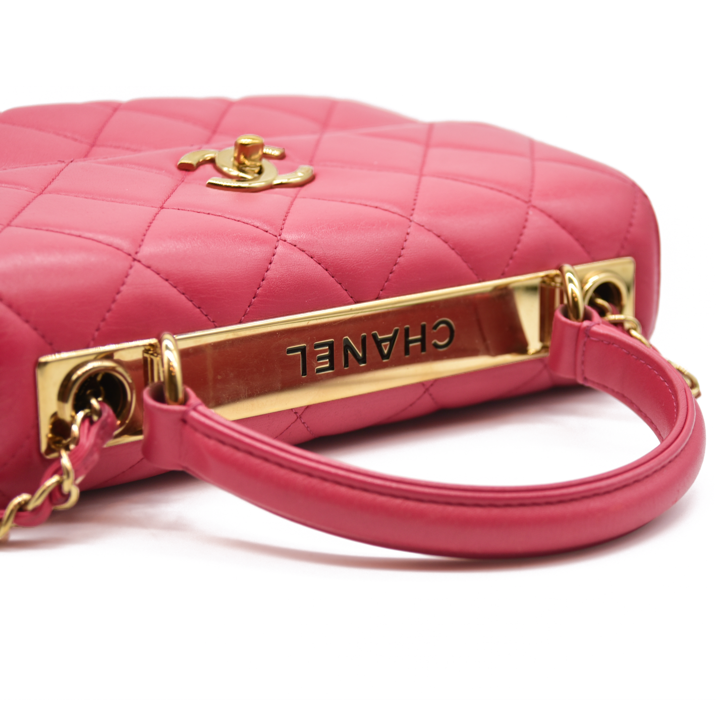 This is an authentic CHANEL Lambskin Quilted Small Trendy CC Flap Dual Handle Bag in Dark Pink. This stylish handbag is crafted of diamond quilted lambskin leather in pink. The refined bag features a leather top handle with a gold bar with a Chanel logo and gold links, a gold chain leather threaded shoulder strap with a shoulder pad, and a gold Chanel CC logo on the front flap. This opens to a matching partitioned leather interior with zipper and patch pockets.