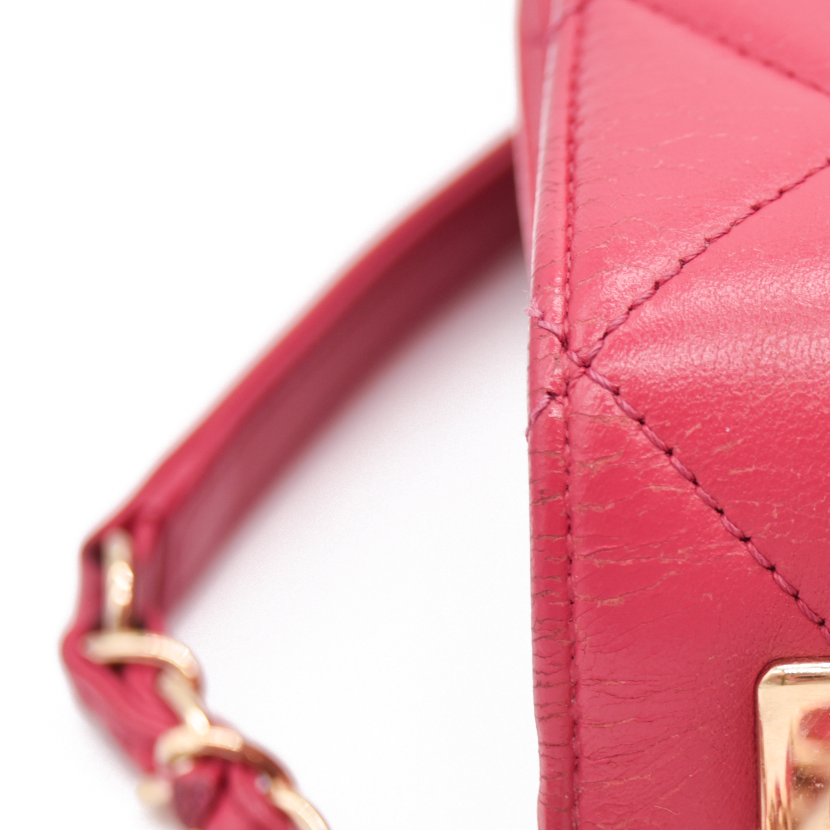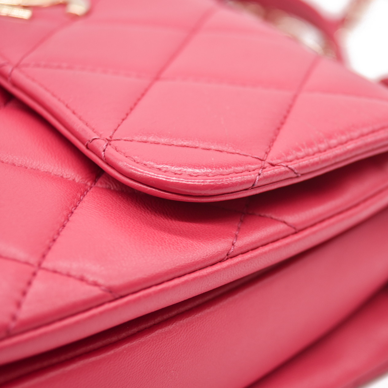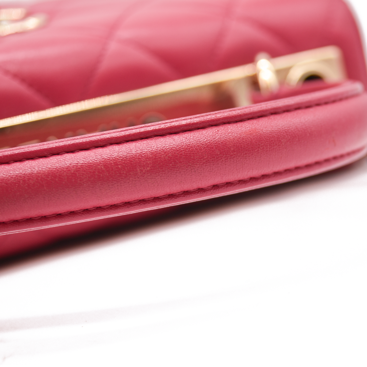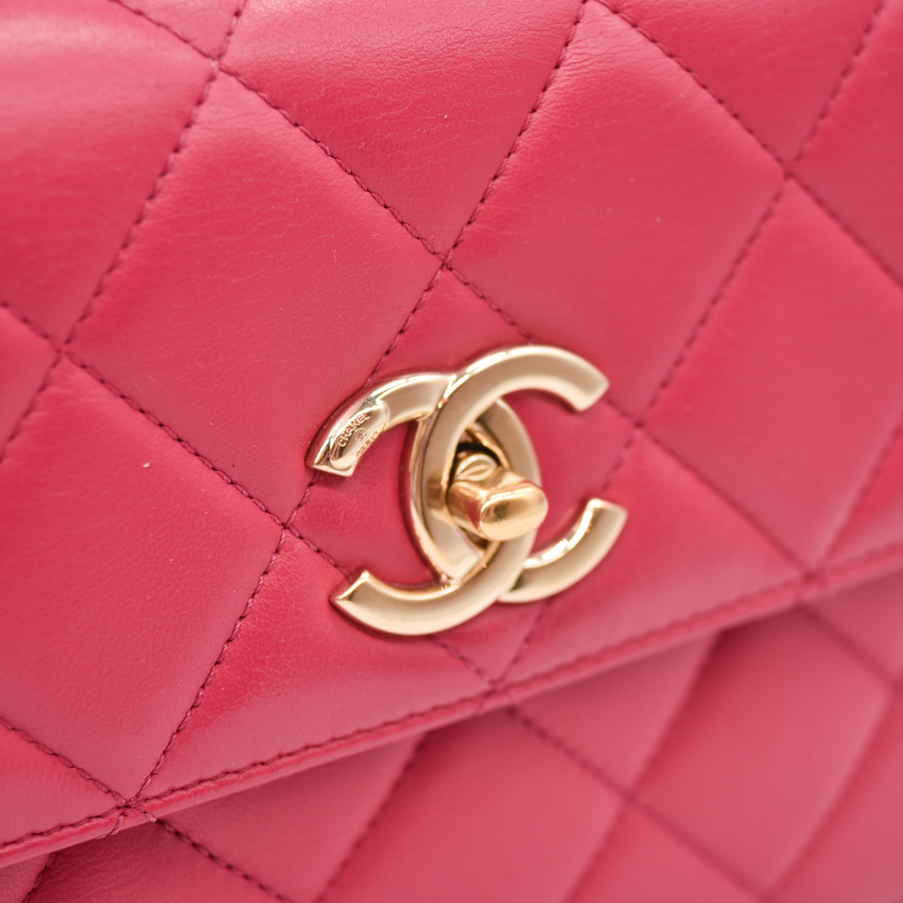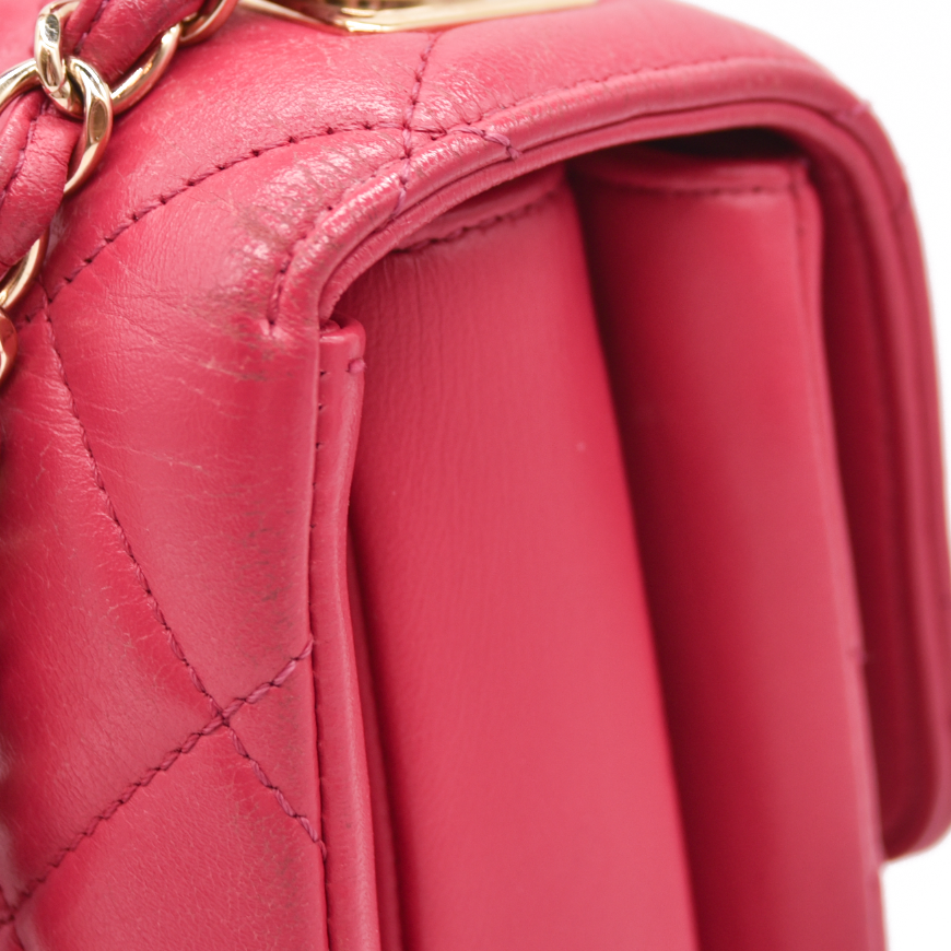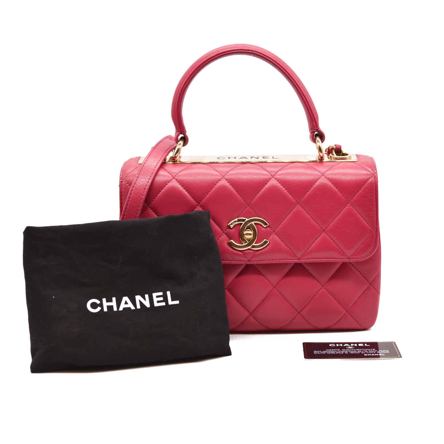 This is an authentic CHANEL Lambskin Quilted Small Trendy CC Flap Dual Handle Bag in Dark Pink. This stylish handbag is crafted of diamond quilted lambskin leather in pink. The refined bag features a leather top handle with a gold bar with a Chanel logo and gold links, a gold chain leather threaded shoulder strap with a shoulder pad, and a gold Chanel CC logo on the front flap. This opens to a matching partitioned leather interior with zipper and patch pockets.