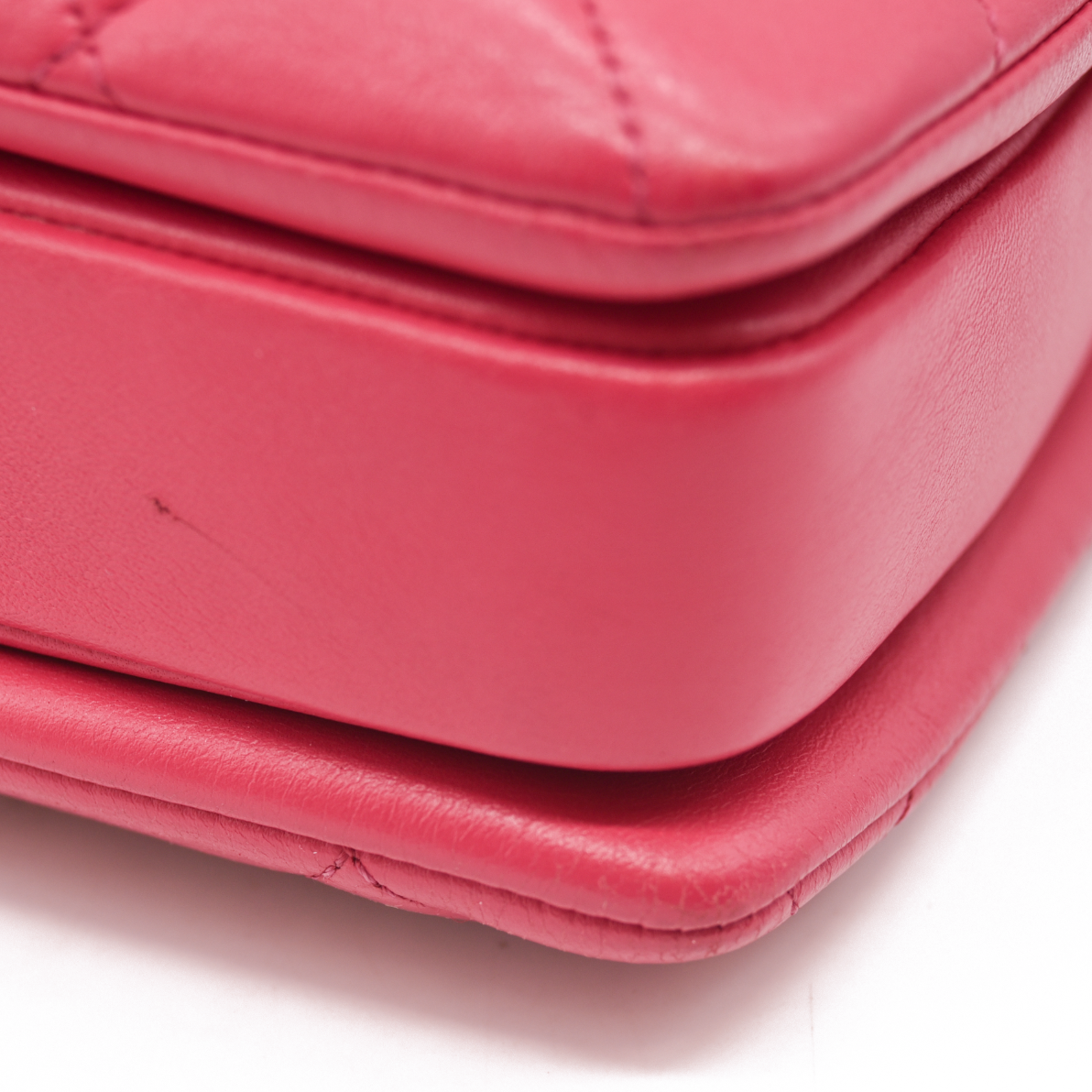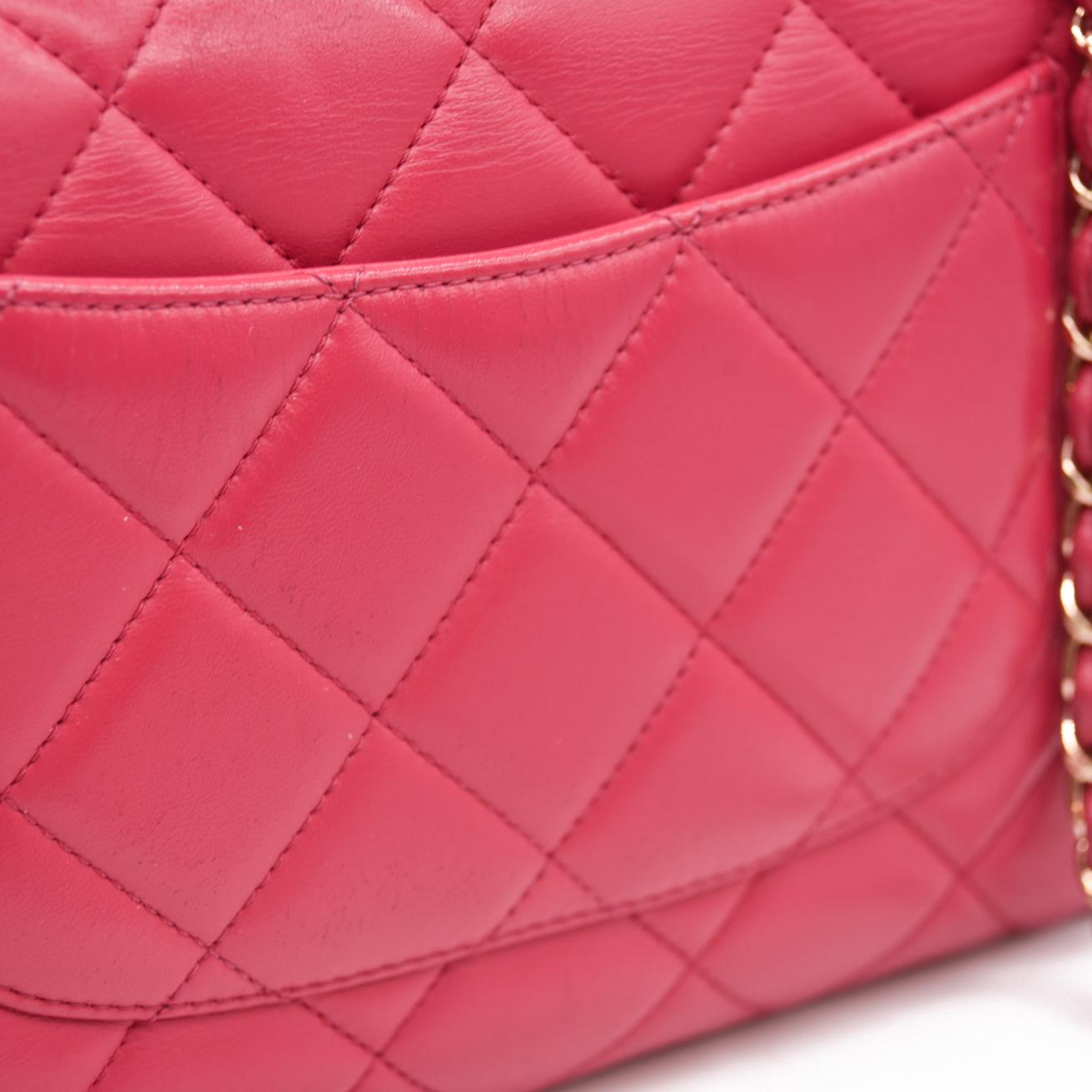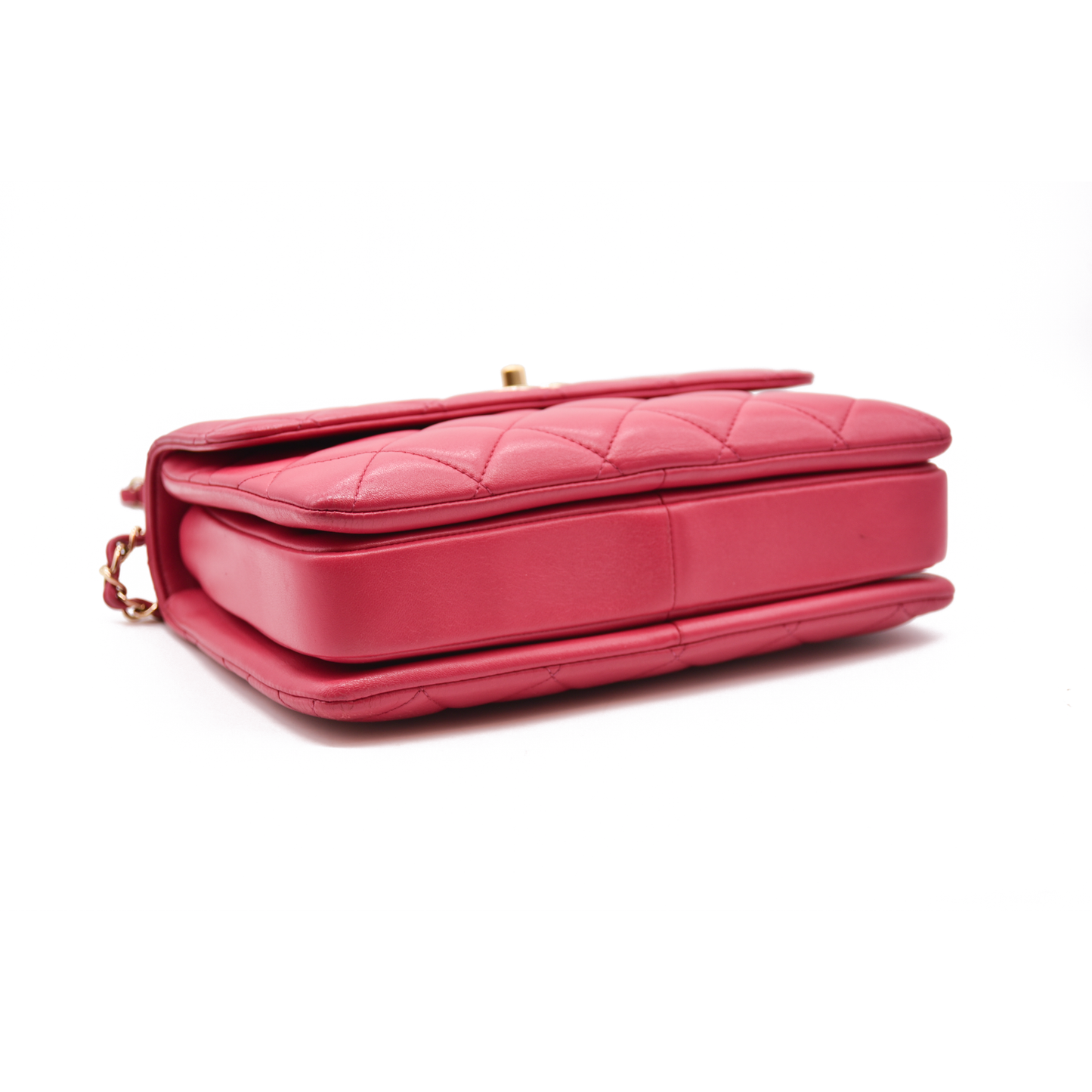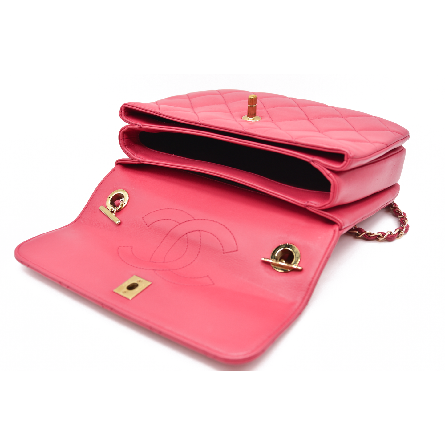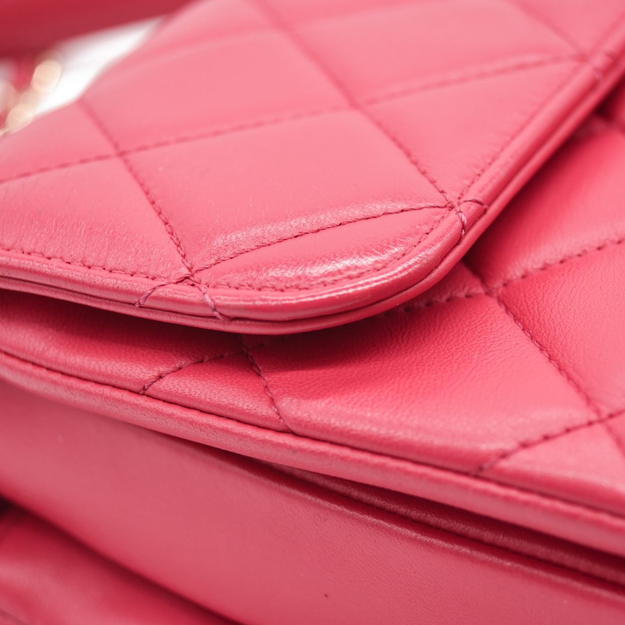 This is an authentic CHANEL Lambskin Quilted Small Trendy CC Flap Dual Handle Bag in Dark Pink. This stylish handbag is crafted of diamond quilted lambskin leather in pink. The refined bag features a leather top handle with a gold bar with a Chanel logo and gold links, a gold chain leather threaded shoulder strap with a shoulder pad, and a gold Chanel CC logo on the front flap. This opens to a matching partitioned leather interior with zipper and patch pockets.