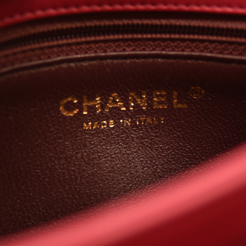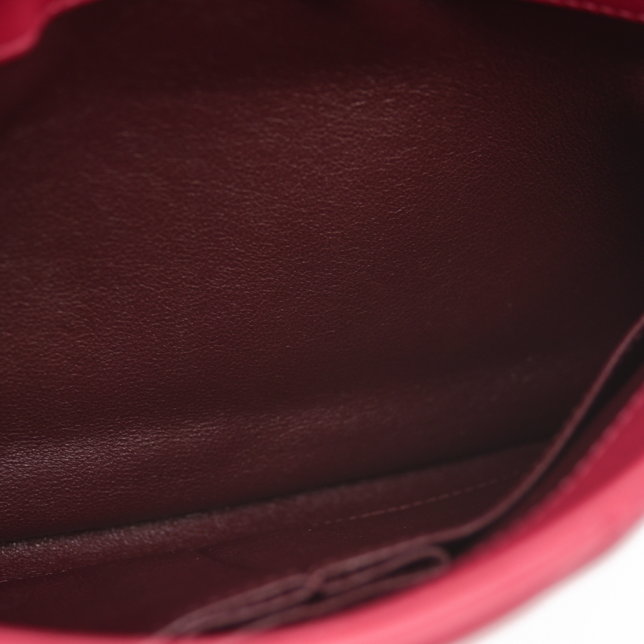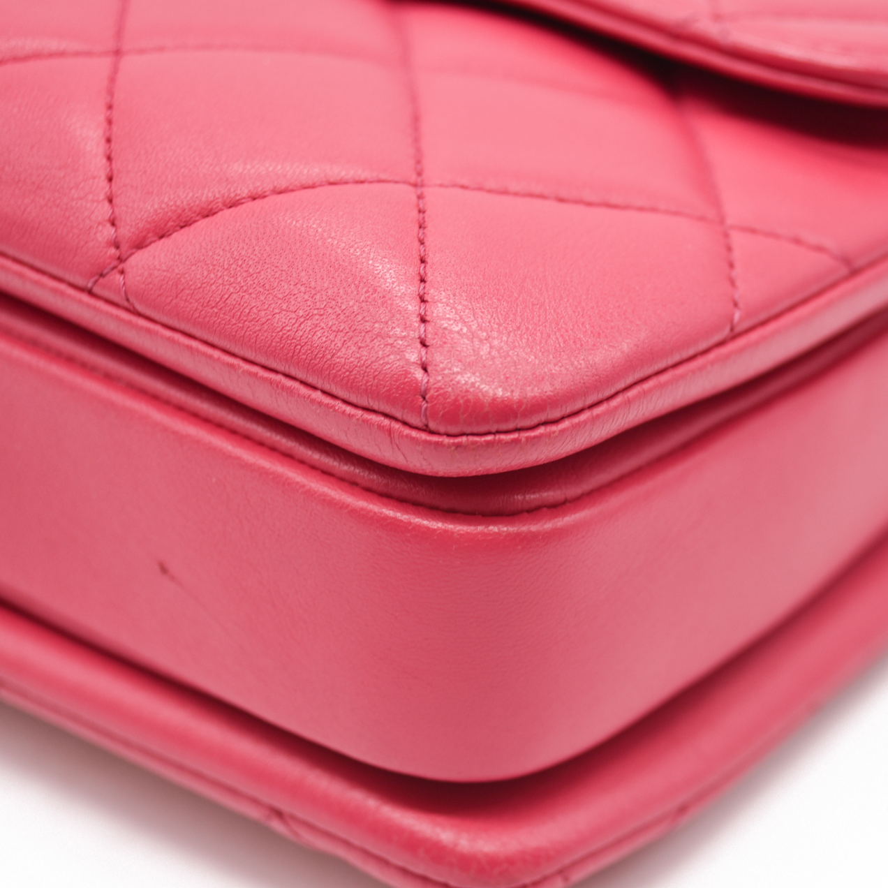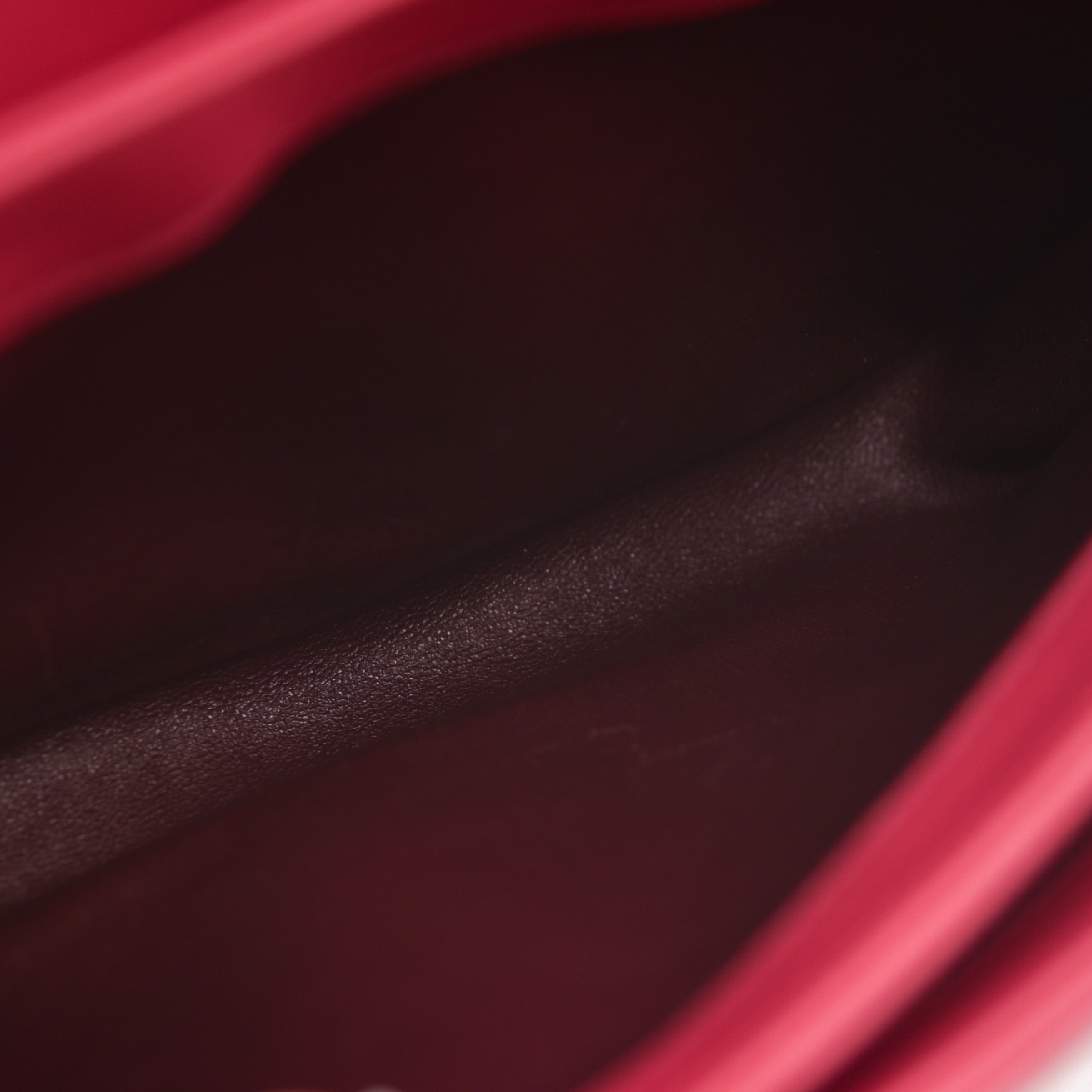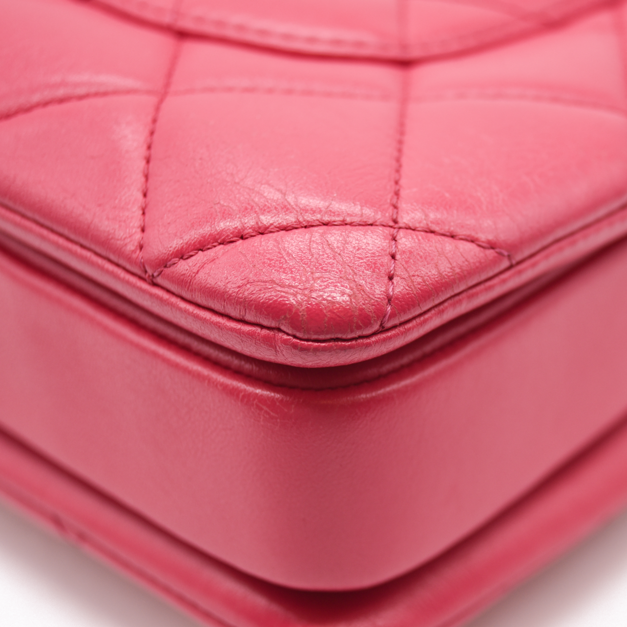 This is an authentic CHANEL Lambskin Quilted Small Trendy CC Flap Dual Handle Bag in Dark Pink. This stylish handbag is crafted of diamond quilted lambskin leather in pink. The refined bag features a leather top handle with a gold bar with a Chanel logo and gold links, a gold chain leather threaded shoulder strap with a shoulder pad, and a gold Chanel CC logo on the front flap. This opens to a matching partitioned leather interior with zipper and patch pockets.
