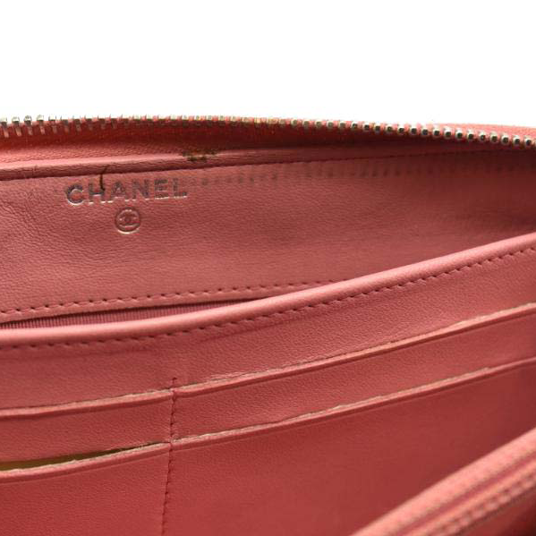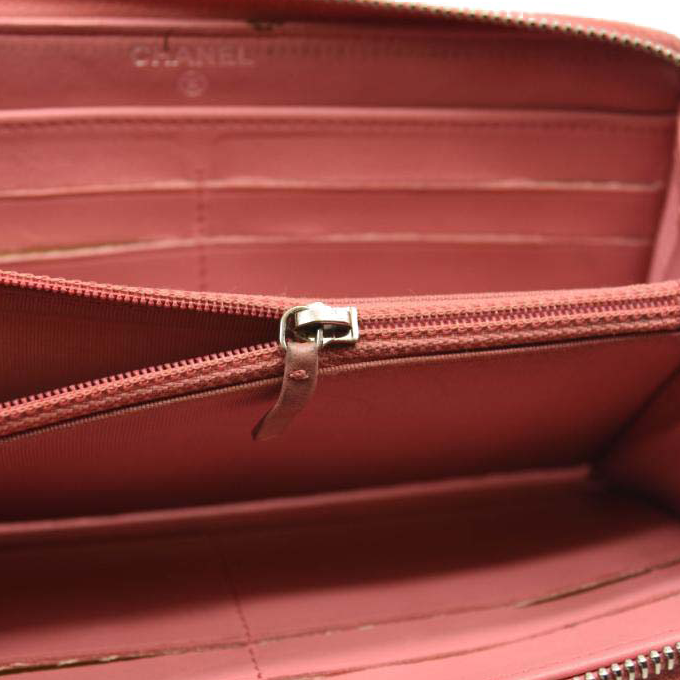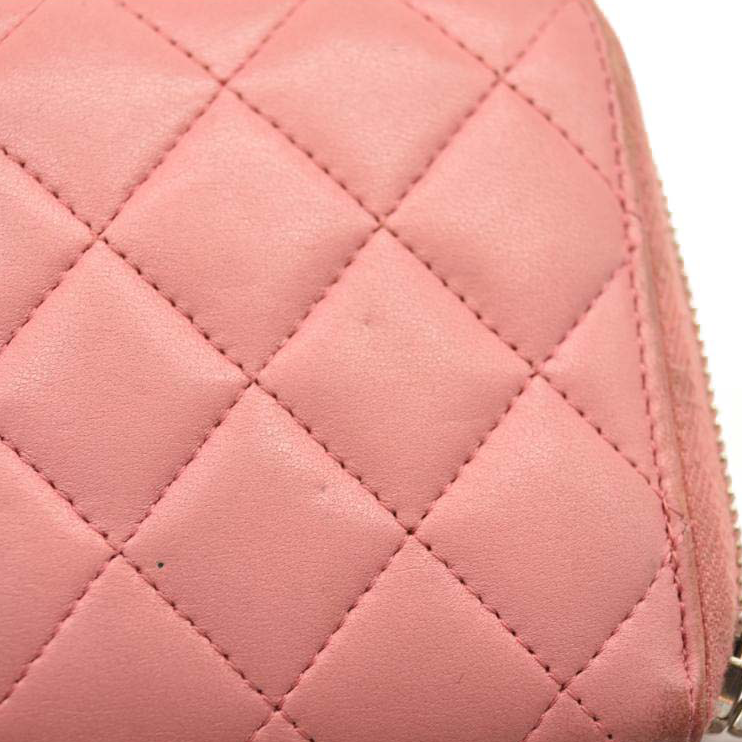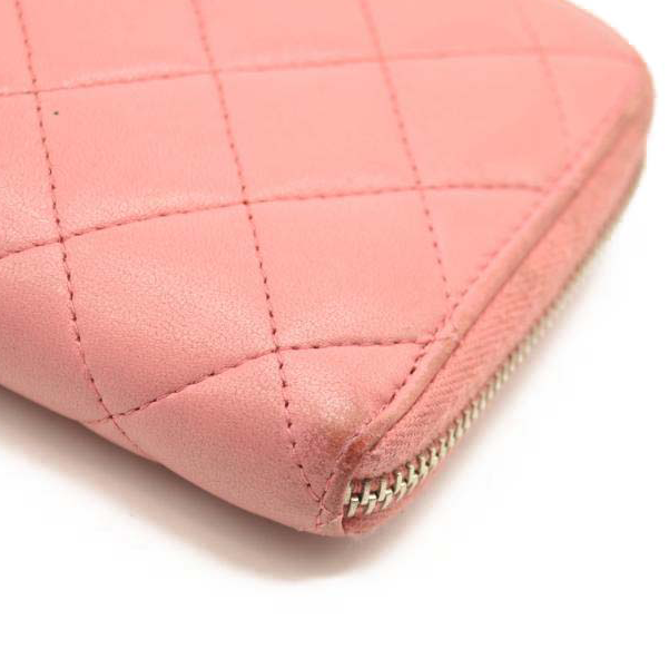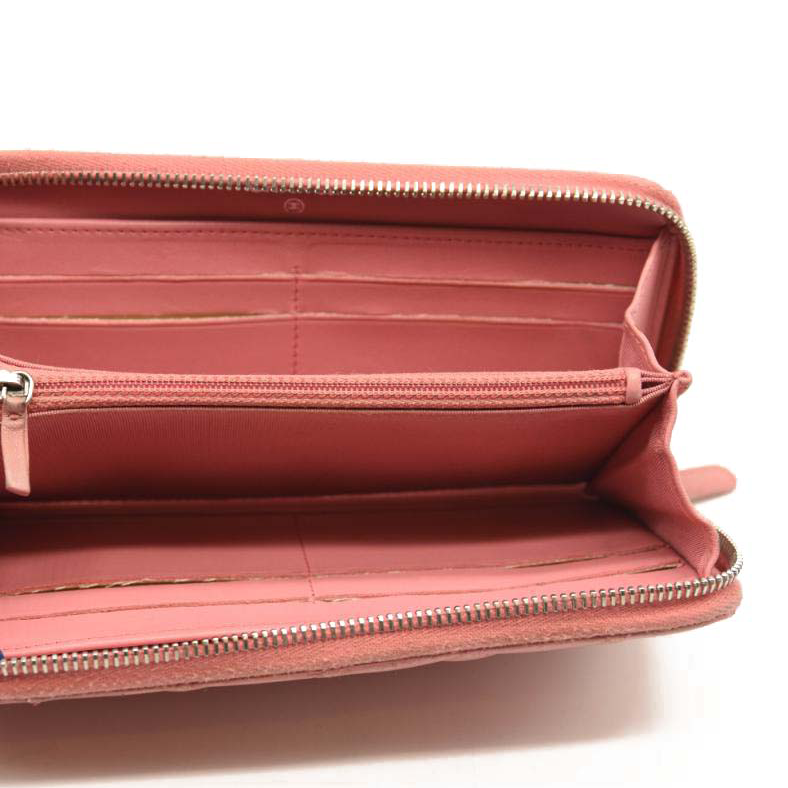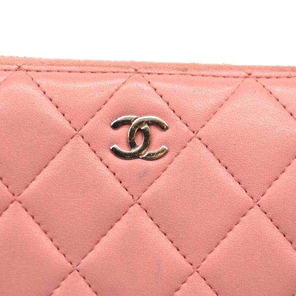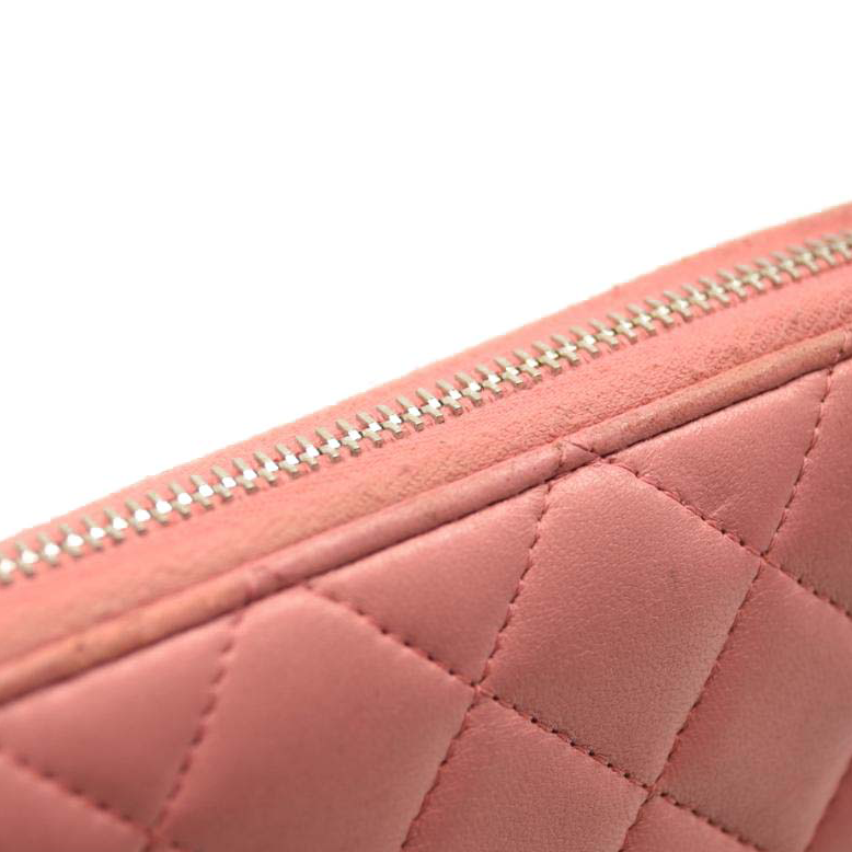 This is an authentic CHANEL Matelasse Long Wallet Lambskin in Light Pink. This chic clutch wallet is crafted of luxurious diamond quilted calfskin leather in pink. It features a front sliver Chanel CC logo. The wrap around zipper opens to a pink leather interior with two panels for card slots, open compartments, and a zipper compartment.
