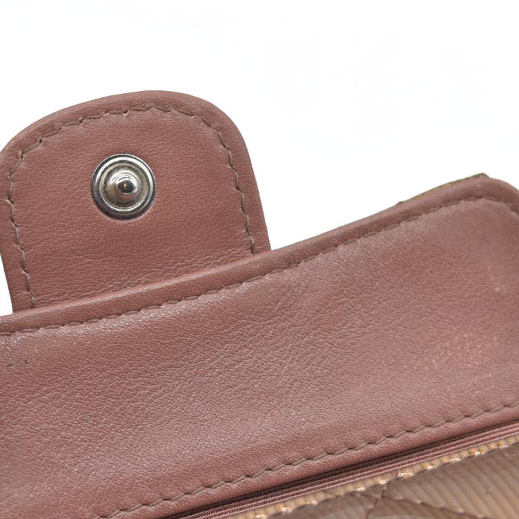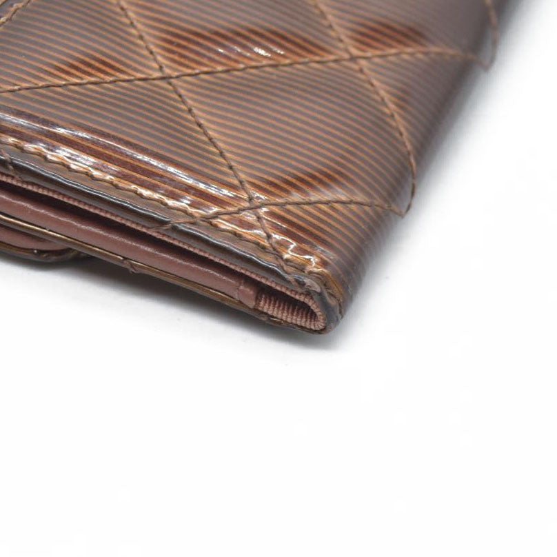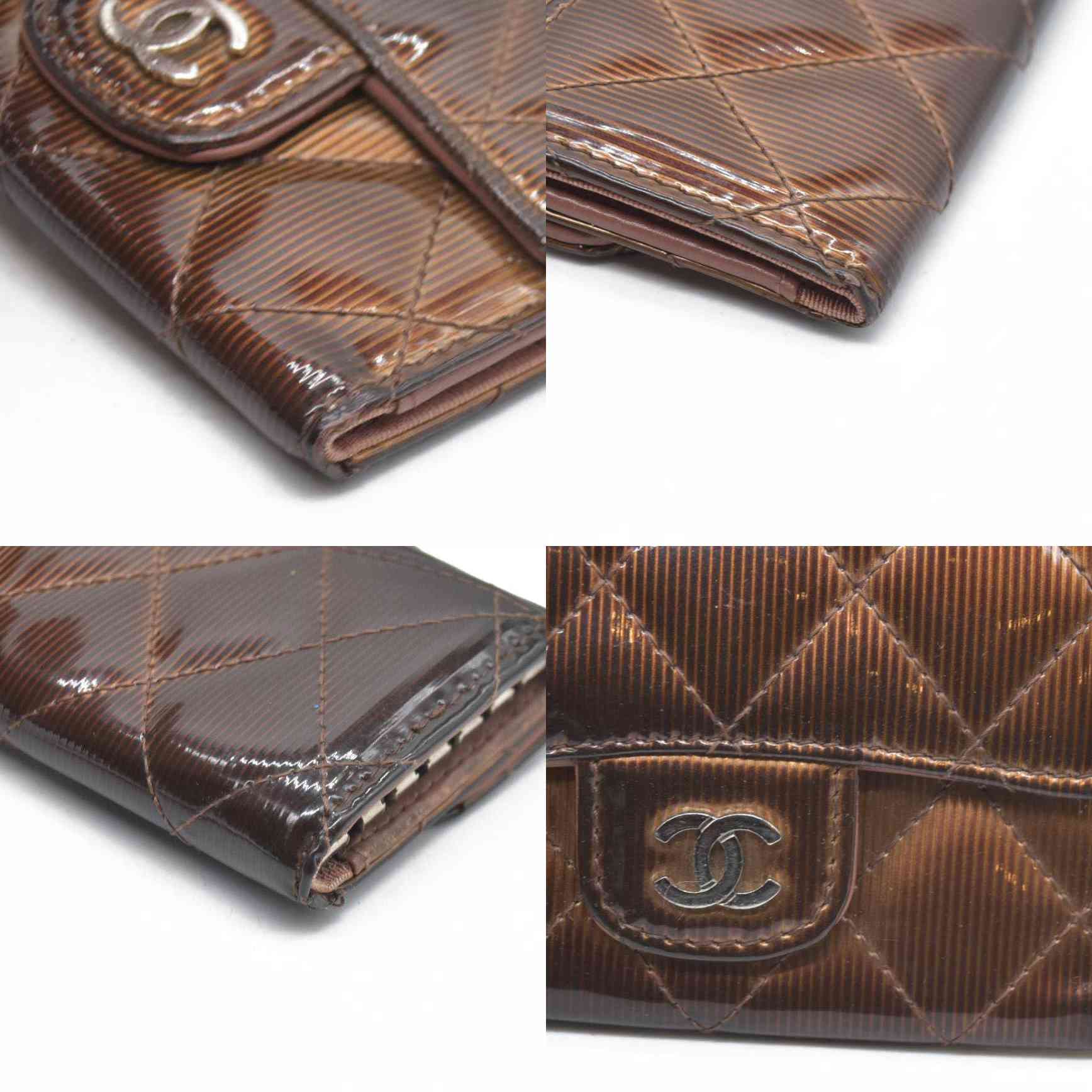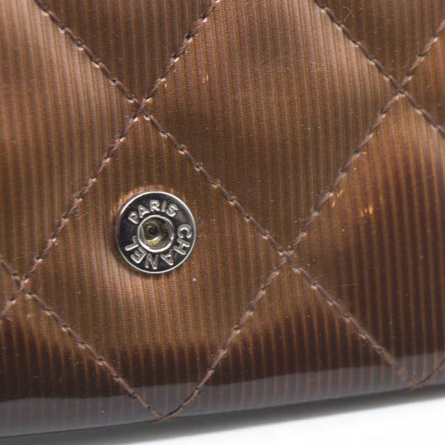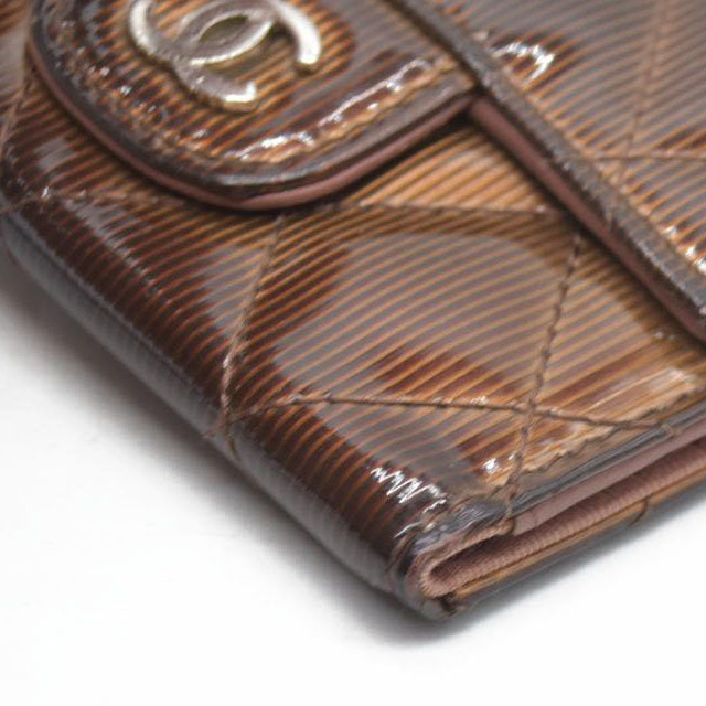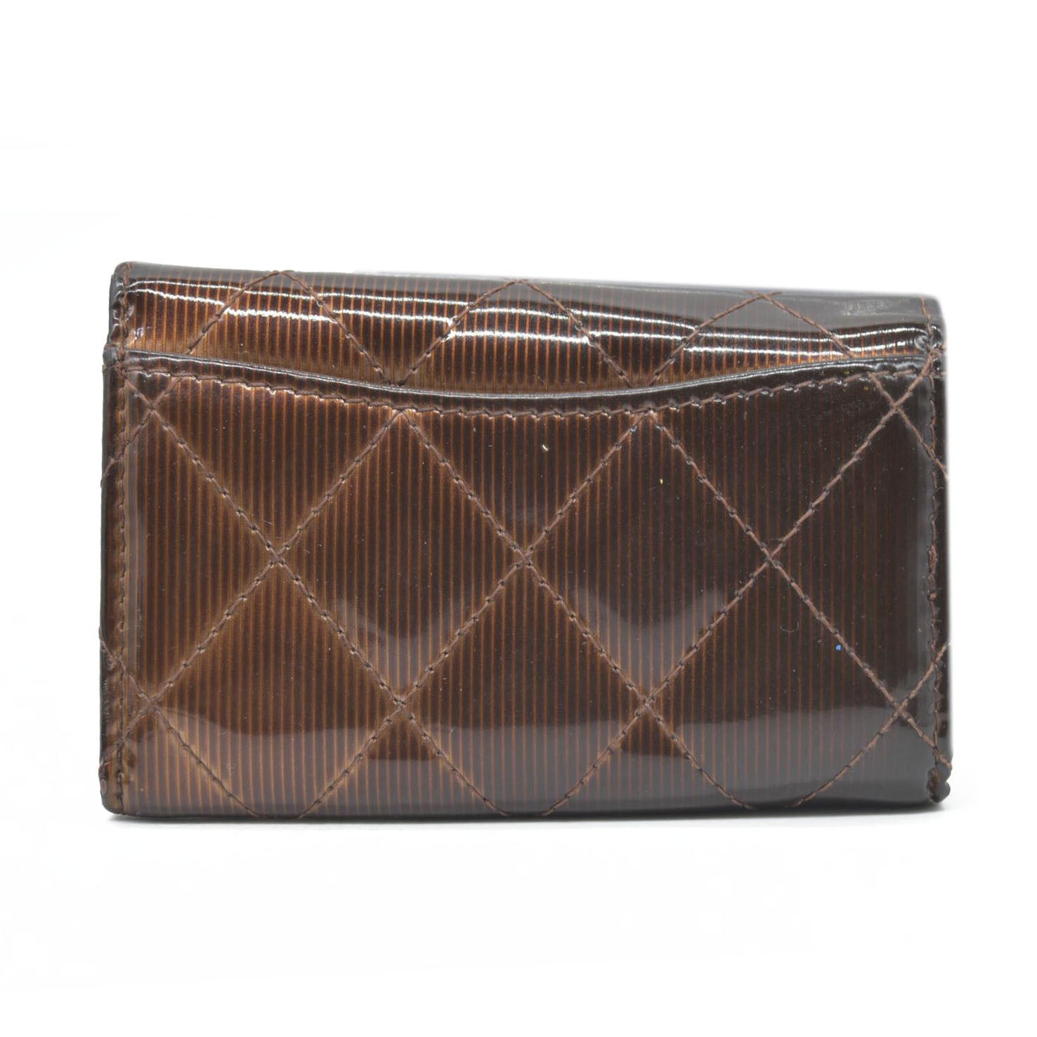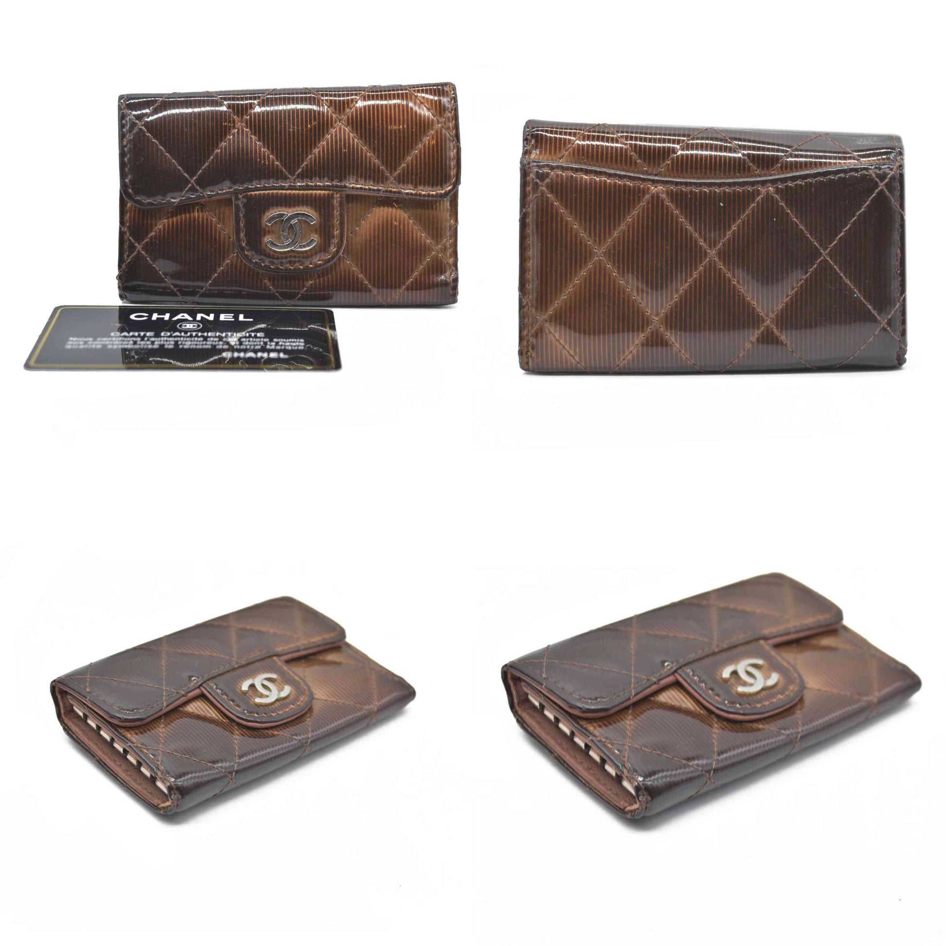 Splendid and iconic timeless/classic Chanel key holder in ribbed patent leather Camel/brown ribbed color with a reflective sheen.