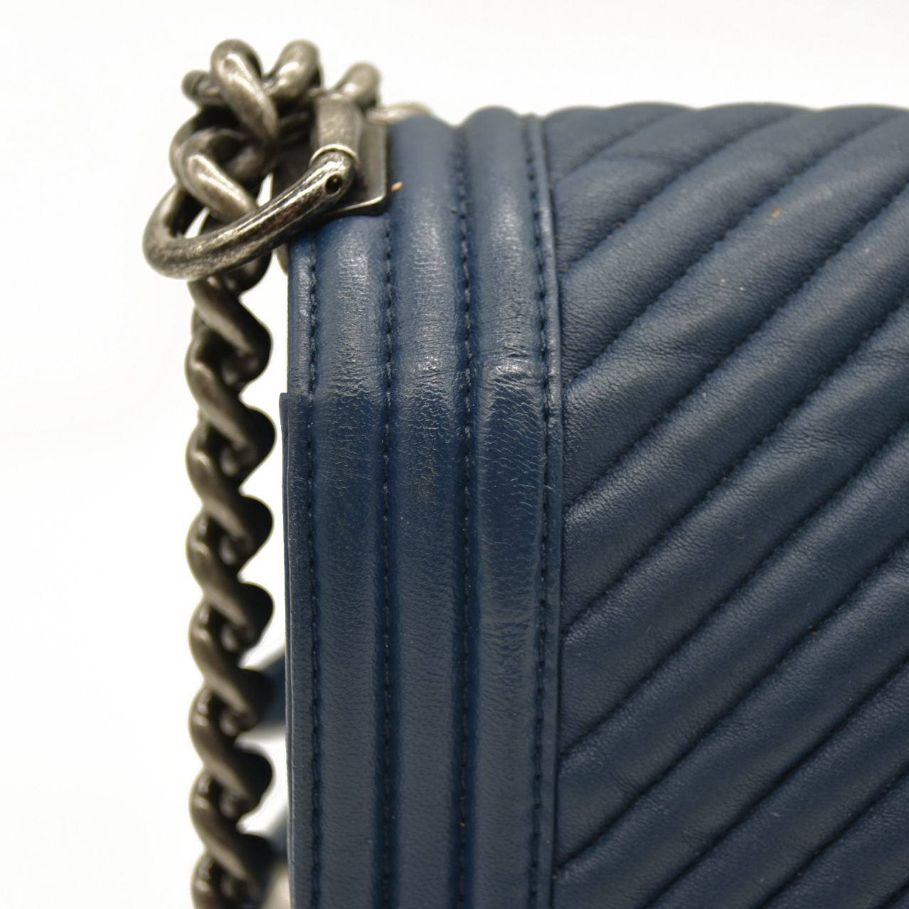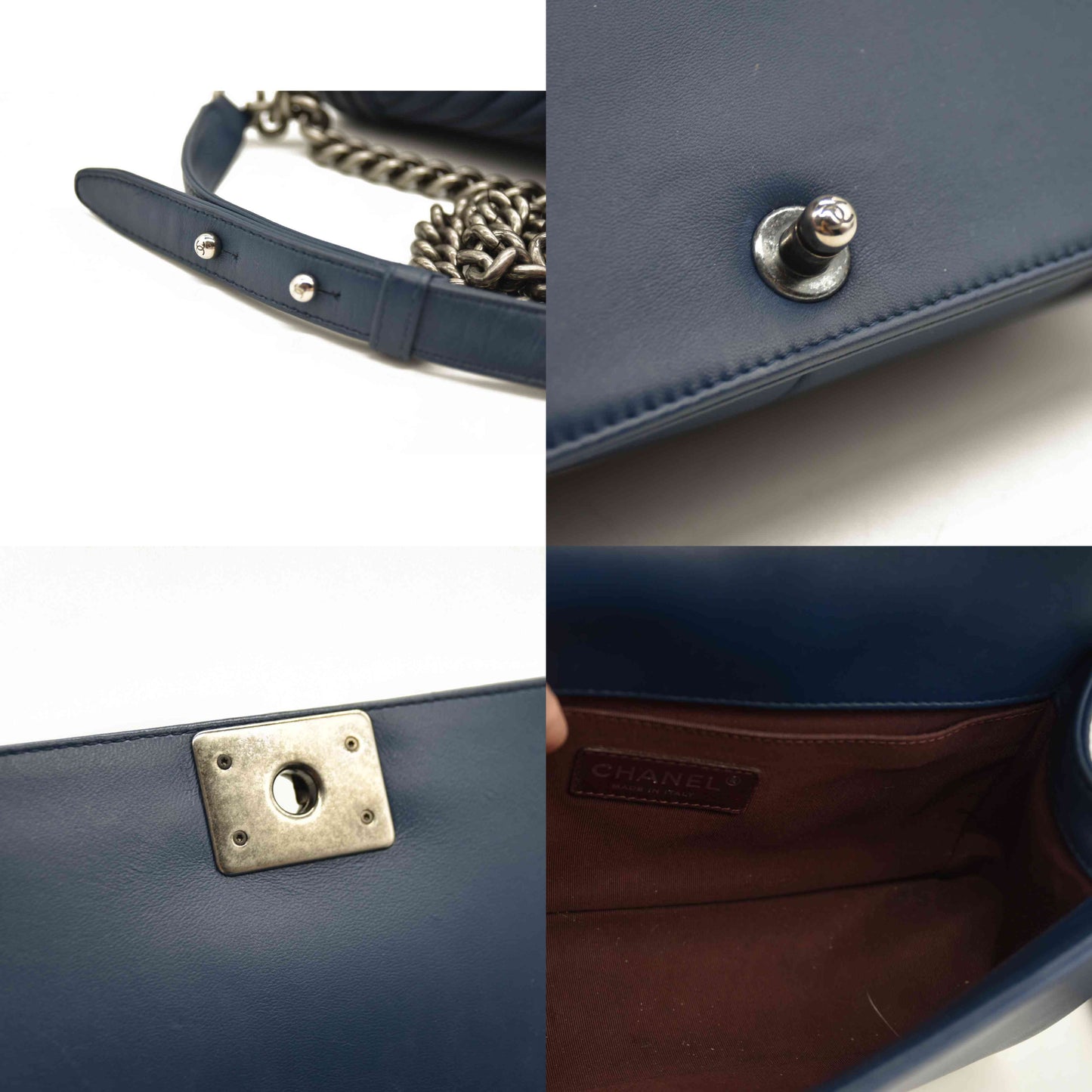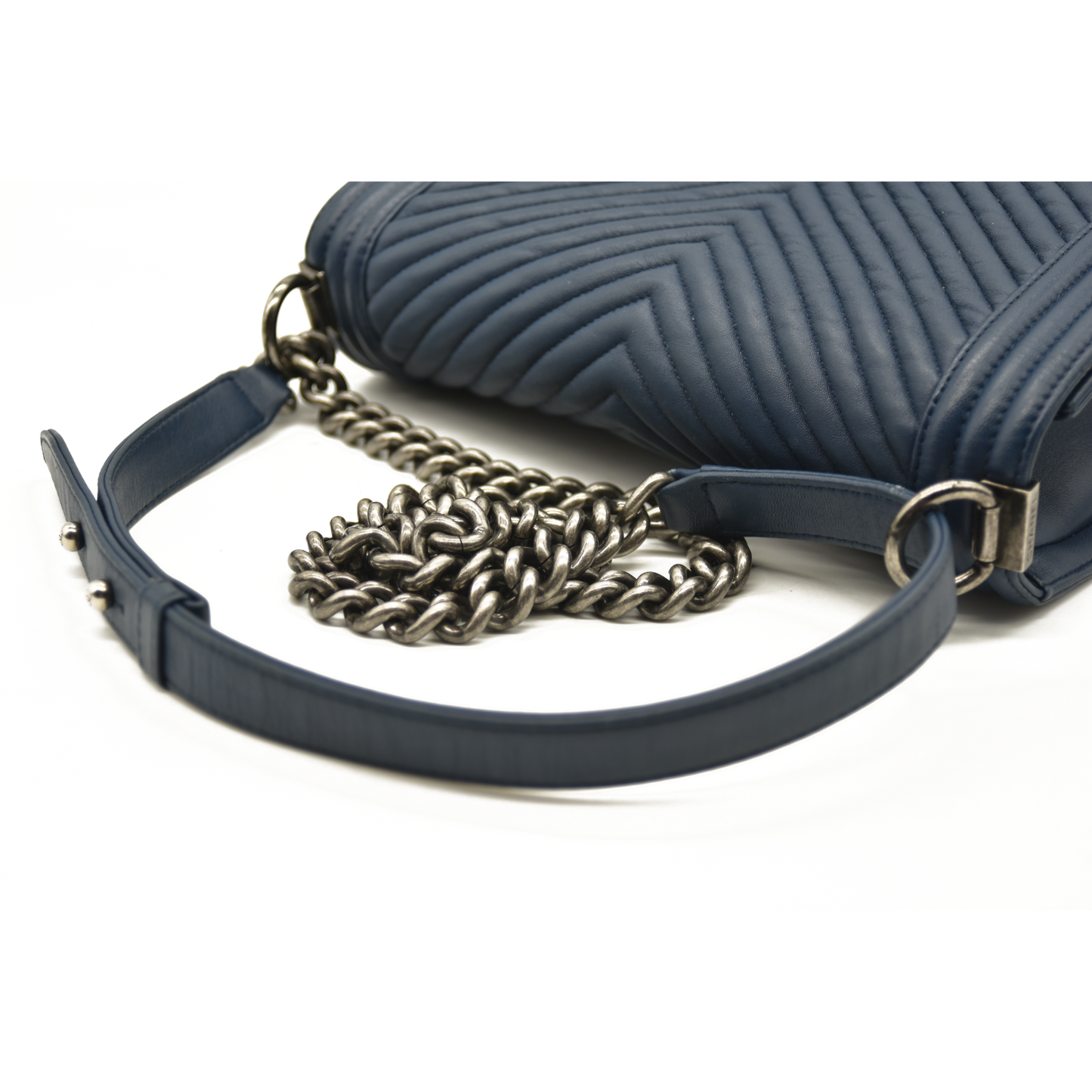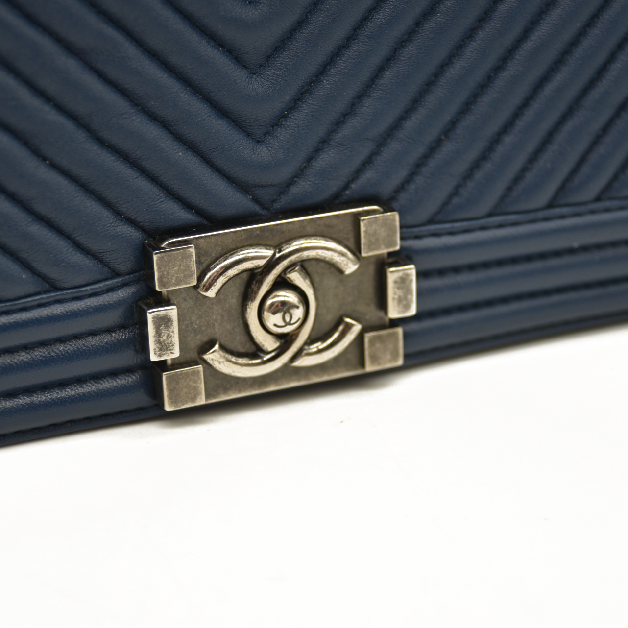 This is an authentic CHANEL Chevron Quilted Medium Boy Flap in Navy Blue. This chic shoulder bag features smooth luxurious chevron quilted leather framed by linear quilting. The bag features a ruthenium chain link and shoulder pad shoulder strap with a ruthenium facing Chanel boy CC push lock for the facing flap. This opens to a burgundy fabric interior with room for essentials for daytime and evening wear with the timeless quality and style only from Chanel!