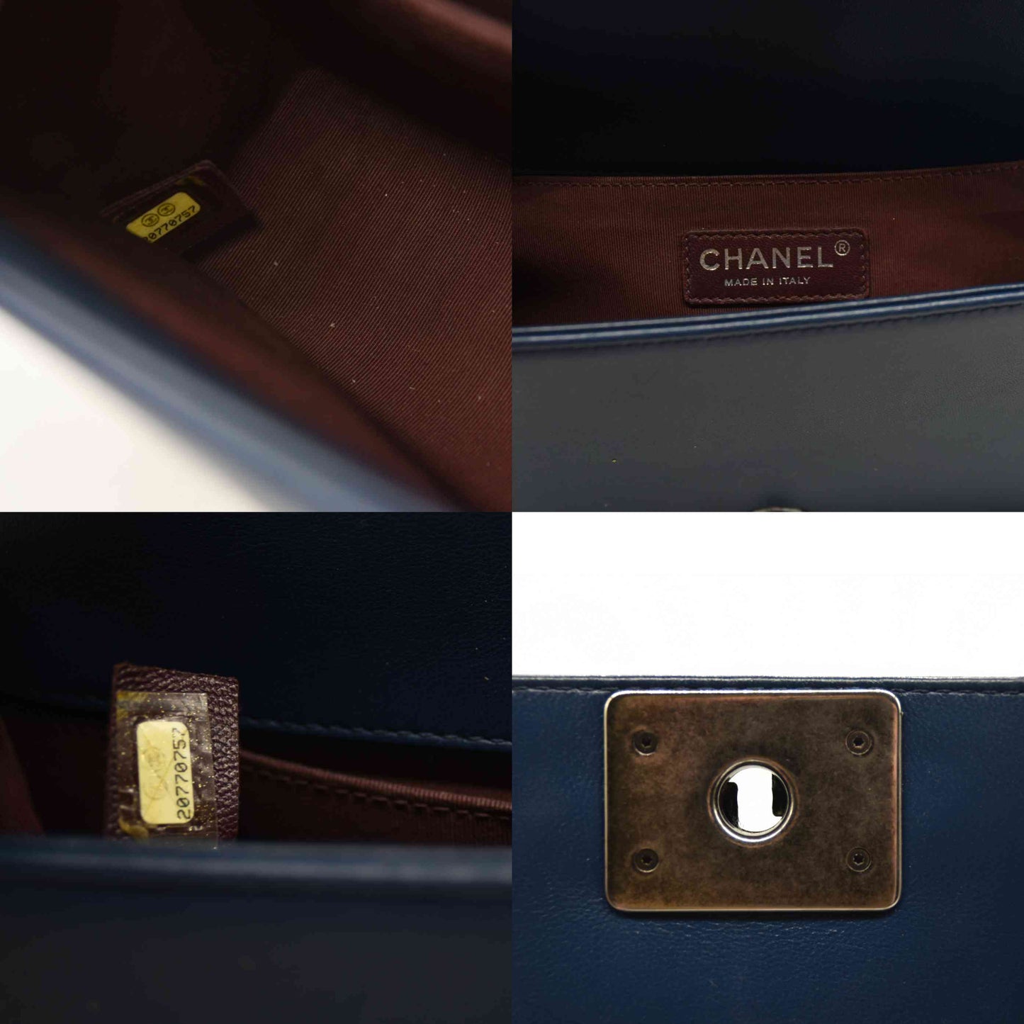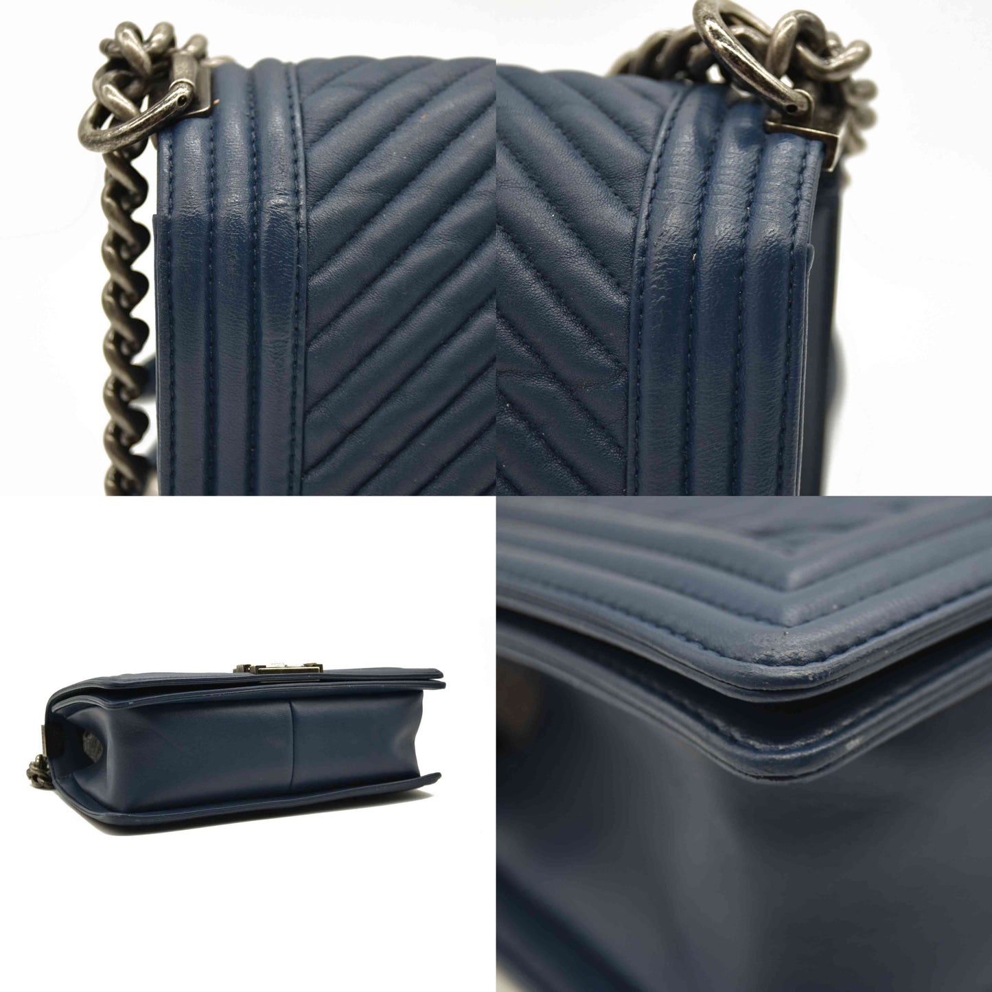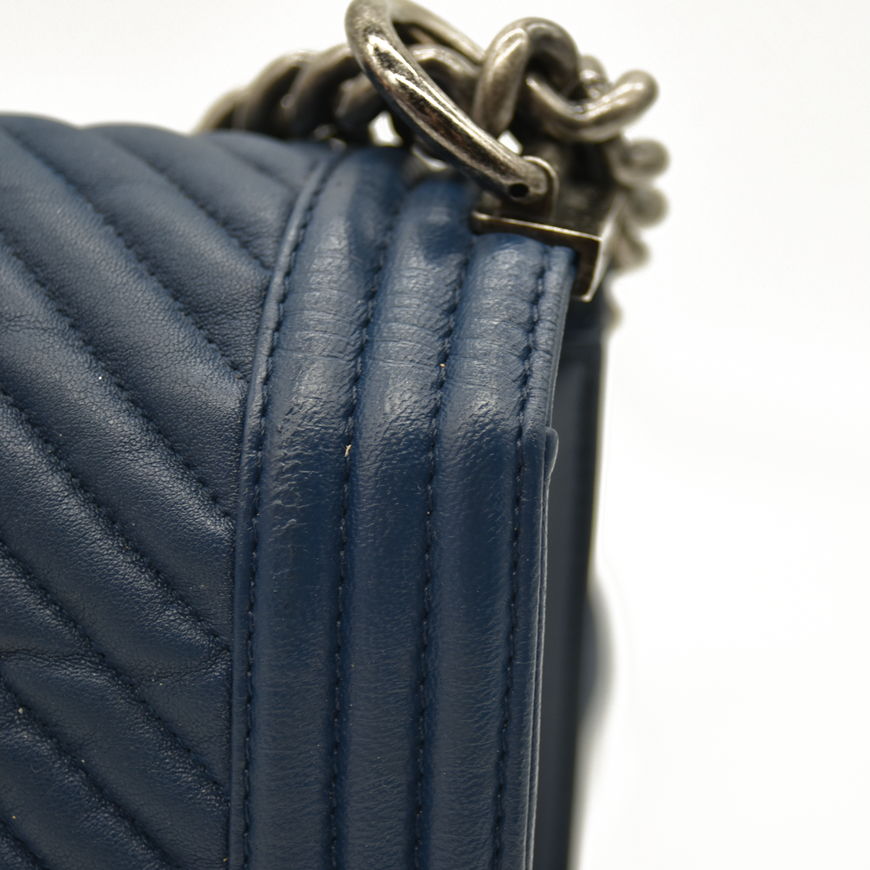 This is an authentic CHANEL Chevron Quilted Medium Boy Flap in Navy Blue. This chic shoulder bag features smooth luxurious chevron quilted leather framed by linear quilting. The bag features a ruthenium chain link and shoulder pad shoulder strap with a ruthenium facing Chanel boy CC push lock for the facing flap. This opens to a burgundy fabric interior with room for essentials for daytime and evening wear with the timeless quality and style only from Chanel!