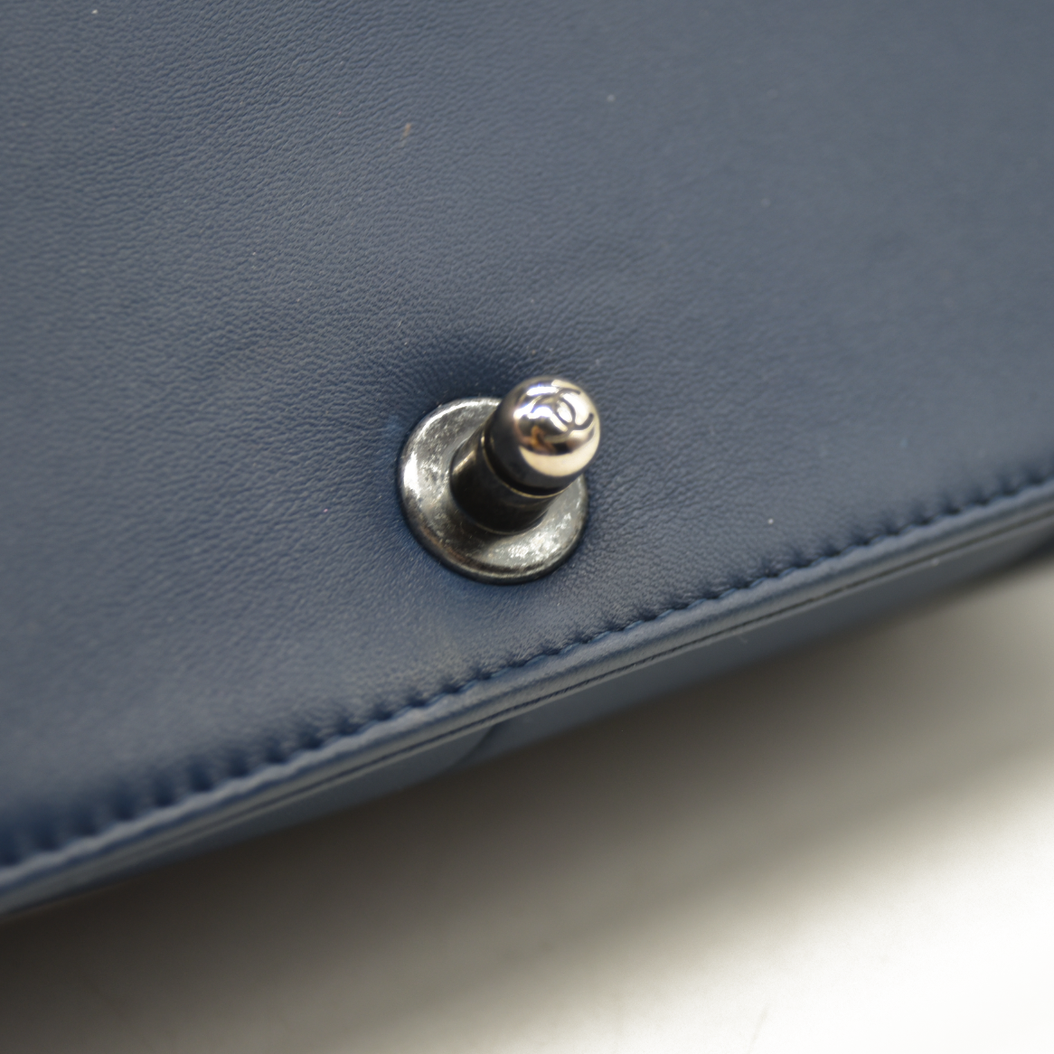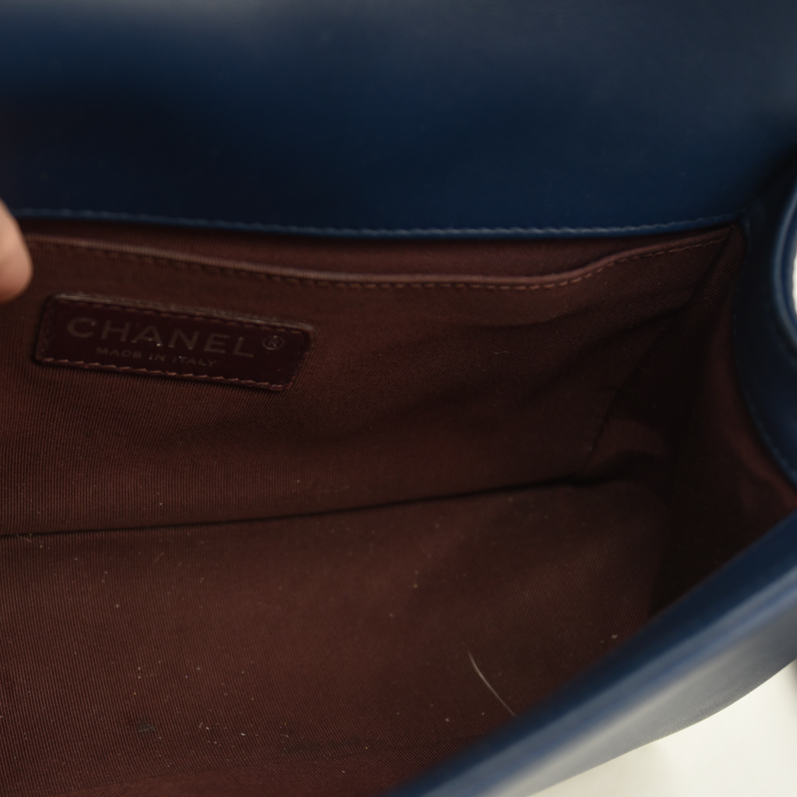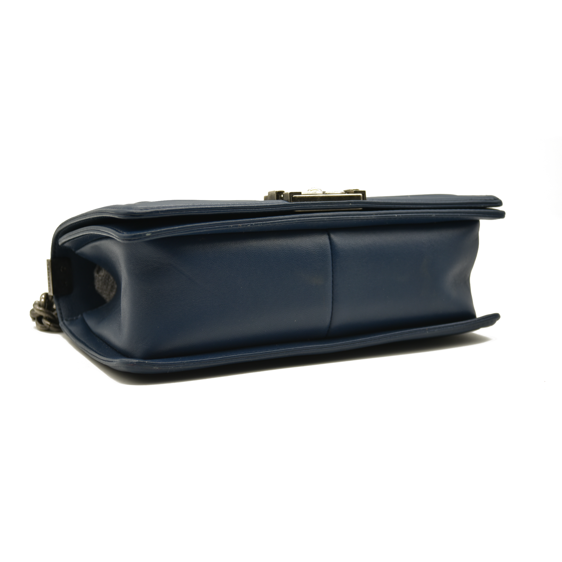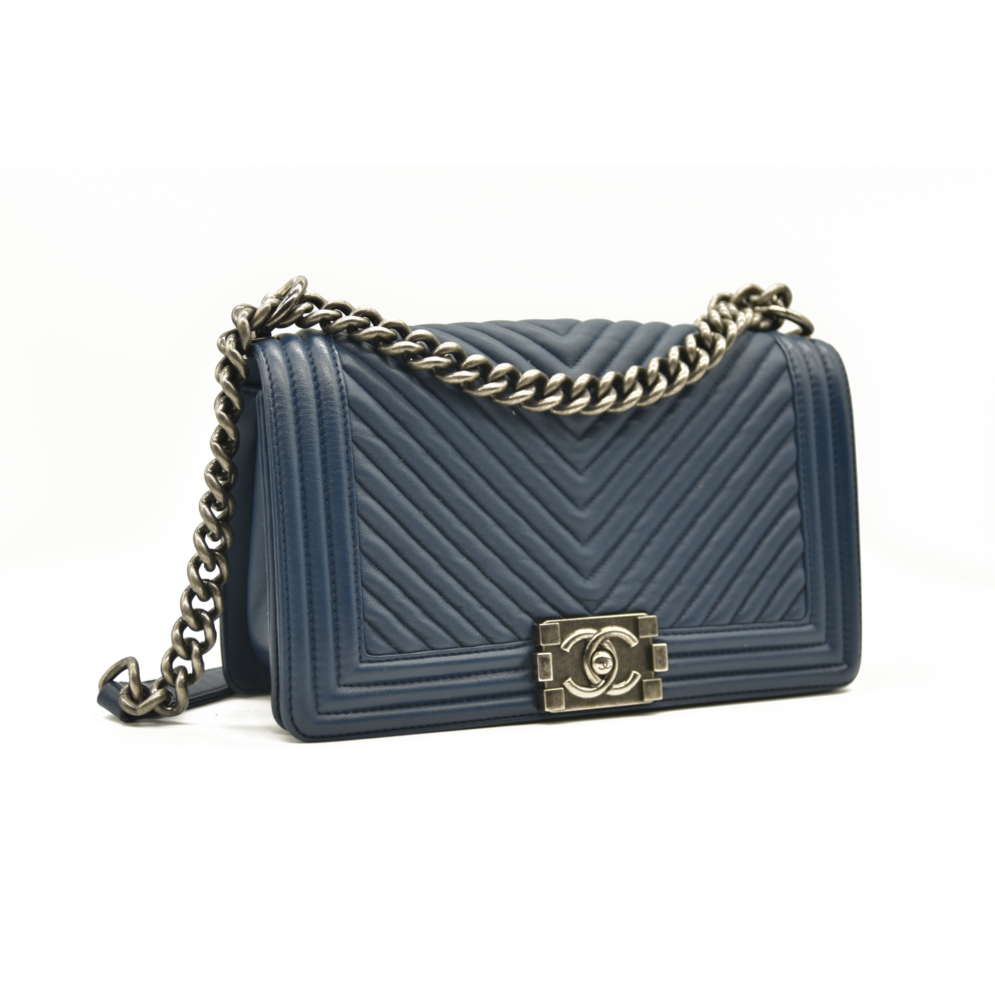 This is an authentic CHANEL Chevron Quilted Medium Boy Flap in Navy Blue. This chic shoulder bag features smooth luxurious chevron quilted leather framed by linear quilting. The bag features a ruthenium chain link and shoulder pad shoulder strap with a ruthenium facing Chanel boy CC push lock for the facing flap. This opens to a burgundy fabric interior with room for essentials for daytime and evening wear with the timeless quality and style only from Chanel!