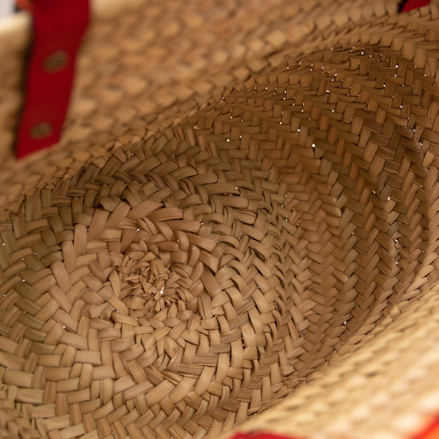 A logo-debossed plaque and red leather–lined shoulder straps bring signature detailing to this breezy straw tote designed to accessorize chic, summery looks.
