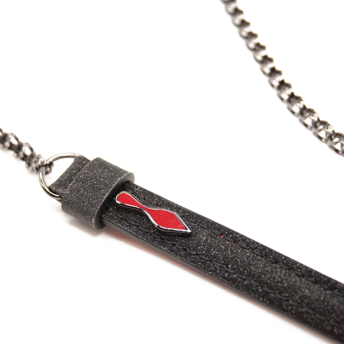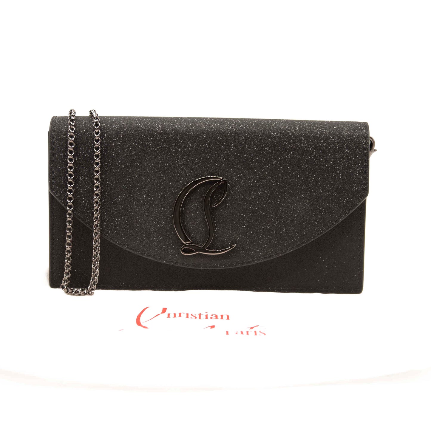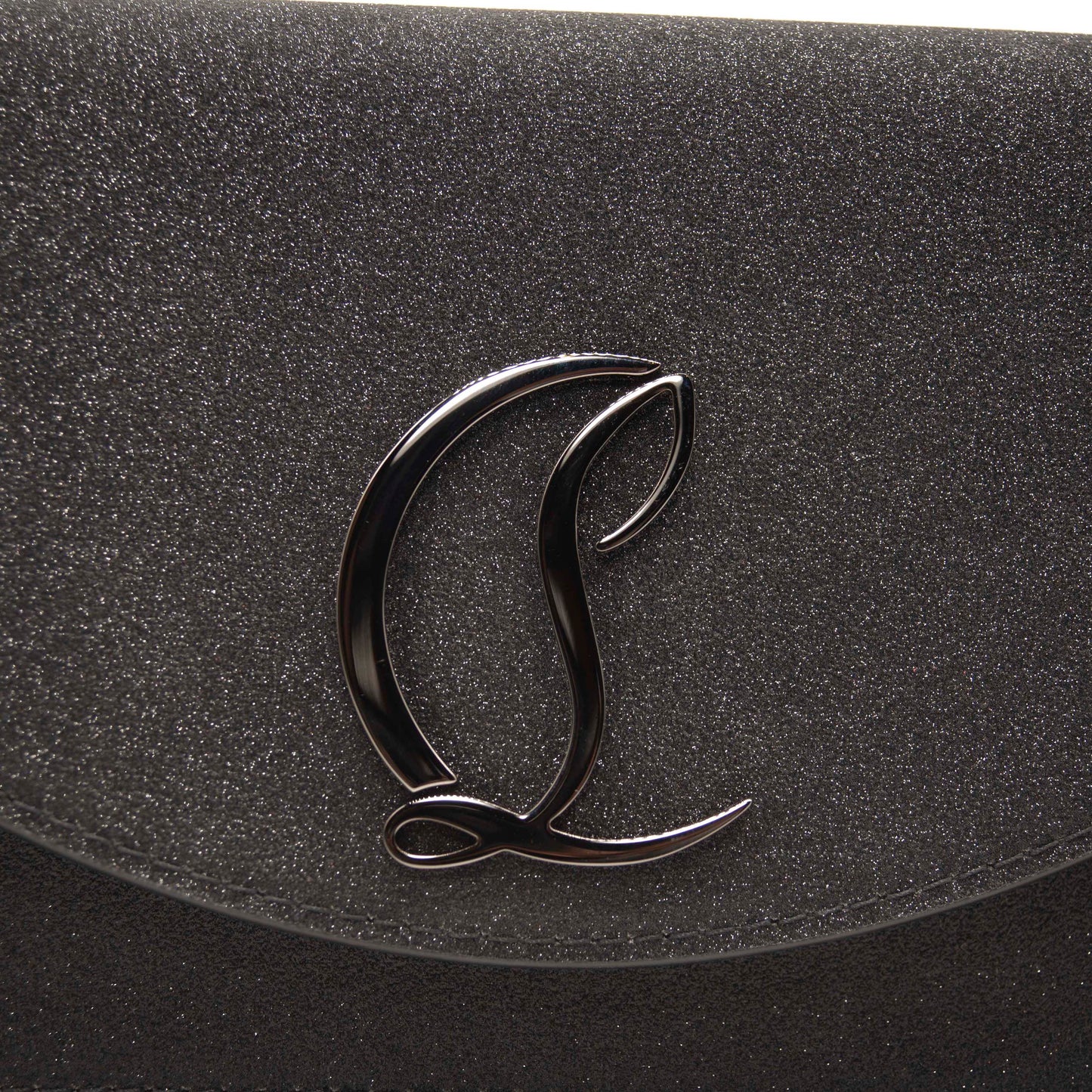 A glittery clutch with logo monogram hardware and a removable chain-and-leather strap is lined in Louboutin-red calfskin for a luxe look, inside and out.